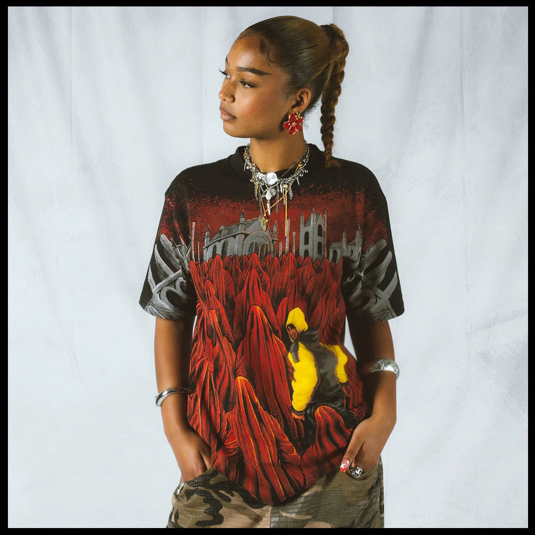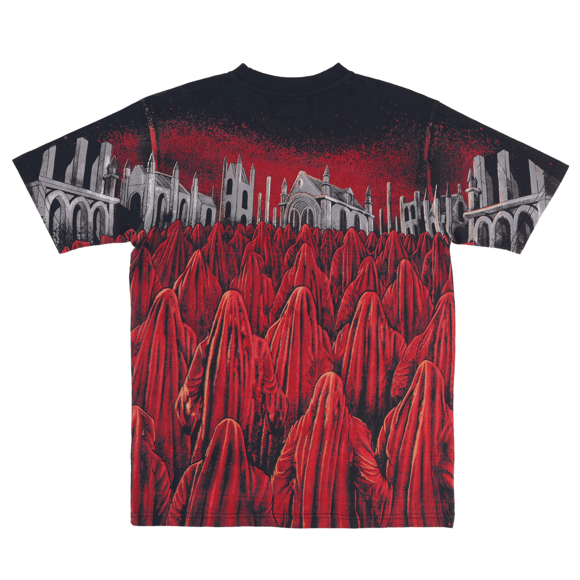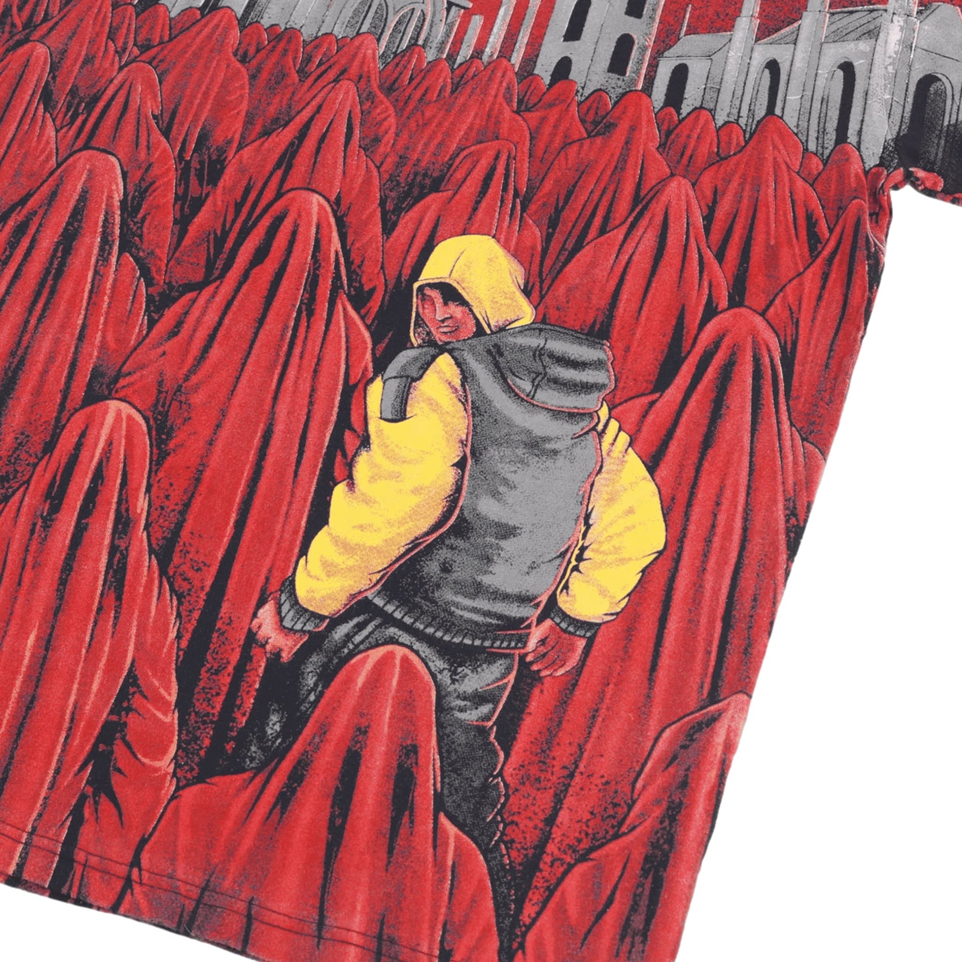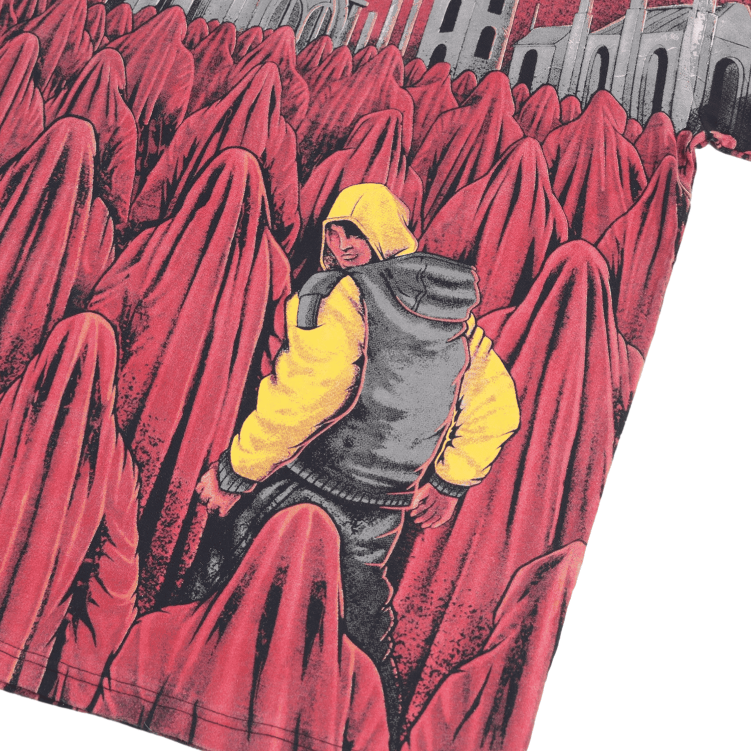 Designed by Raf Reyes: amid a sea of ᵥred-cloaked forms (ᵥradiating menace) moving toward a shadowy cathedral clawing at the crimson sky [...] one assassin stands out — draped in yellow + black, hood low, gaze piercing ⇄ LEAD NEVER FOLLOW :: moving against the current, his defiance is rebellion, his stance a Declaration ⚔️~