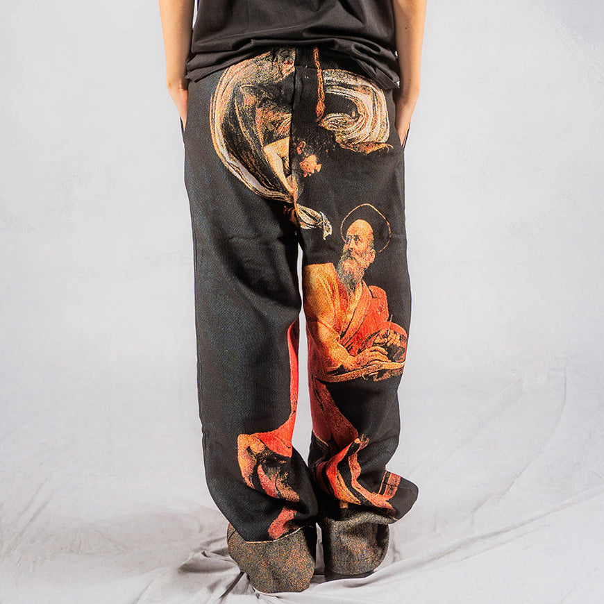 Designed by Raf Reyes: the goat's painting i.e Caravaggio’s “Inspiration of Saint Matthew” 🖼️ wherein divine ᵥrevelation crashes into scripture 📜~ the angel doesn’t whisper, it pulls ⇄ Saint Matthew, draped in vermilion, doesn’t just write the gospel — he’s drafting legacy *under pressure* 🙏📿 the sacred cuts through stitch ⇄ this isn’t homage, it’s possession | | | issa visual psalm for those who build Heritage from chaos, and style from soul 🧿😤.