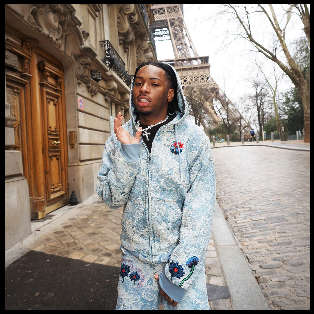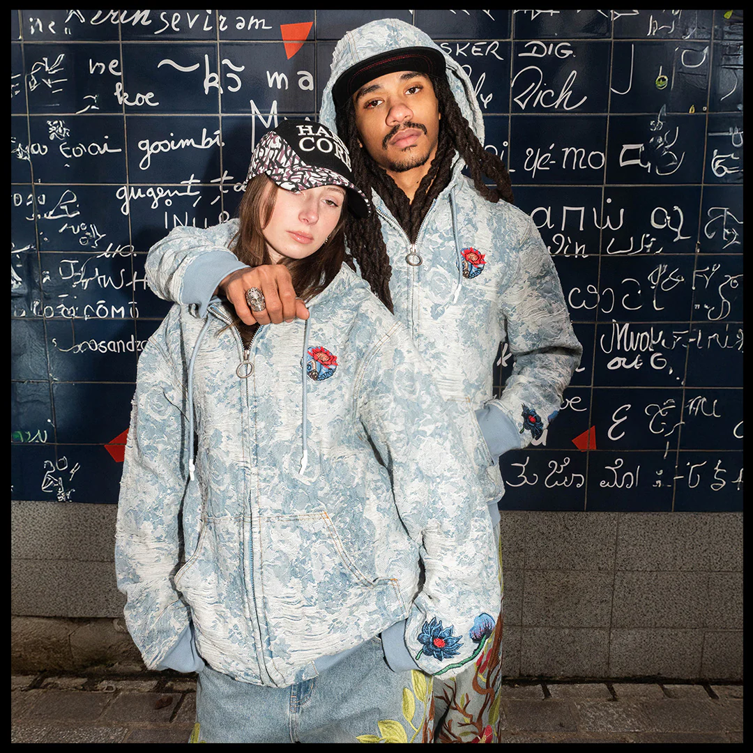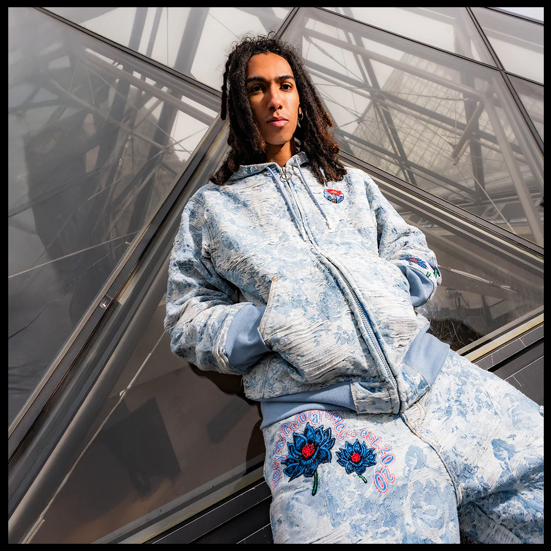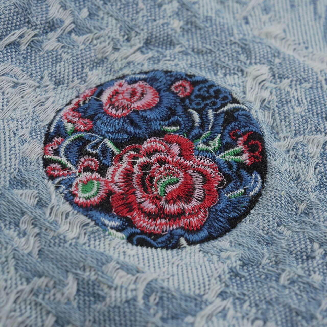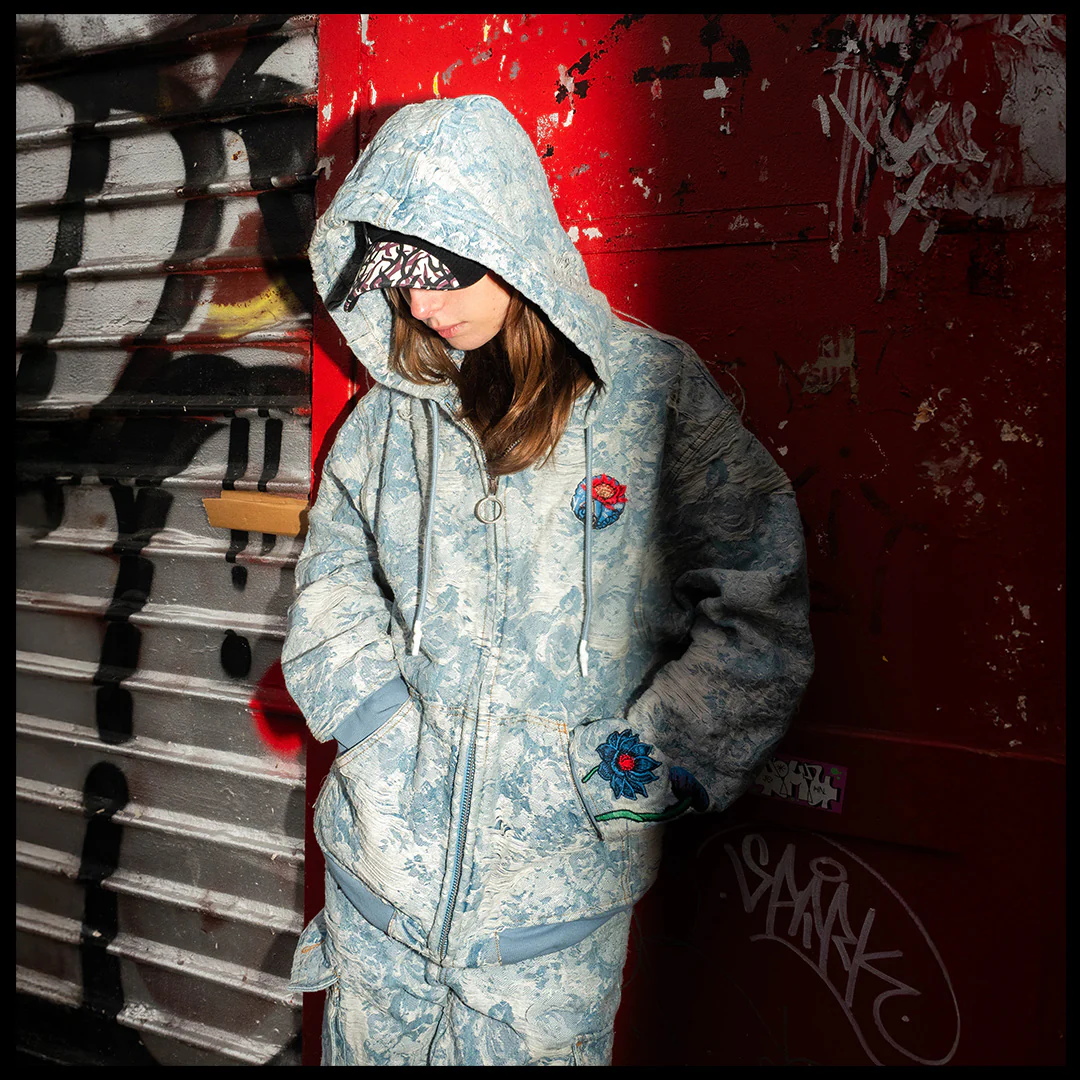Tech specs: ⁽†⁾ᵥremarkable couture-inspired fil coupé jacquard denim (100% cotton | | | 475gsm/14oz) ~ VERYRARE ""flowers tapestry"" motif incorporates a subtle texturing (& softness), while the fabric has been worked & dyed to give a worn-in effect [...] custom-molded branded zipper puller, embroideries @ front & back 🌹~ this piece can be worn with matching pants for a total look 👖.