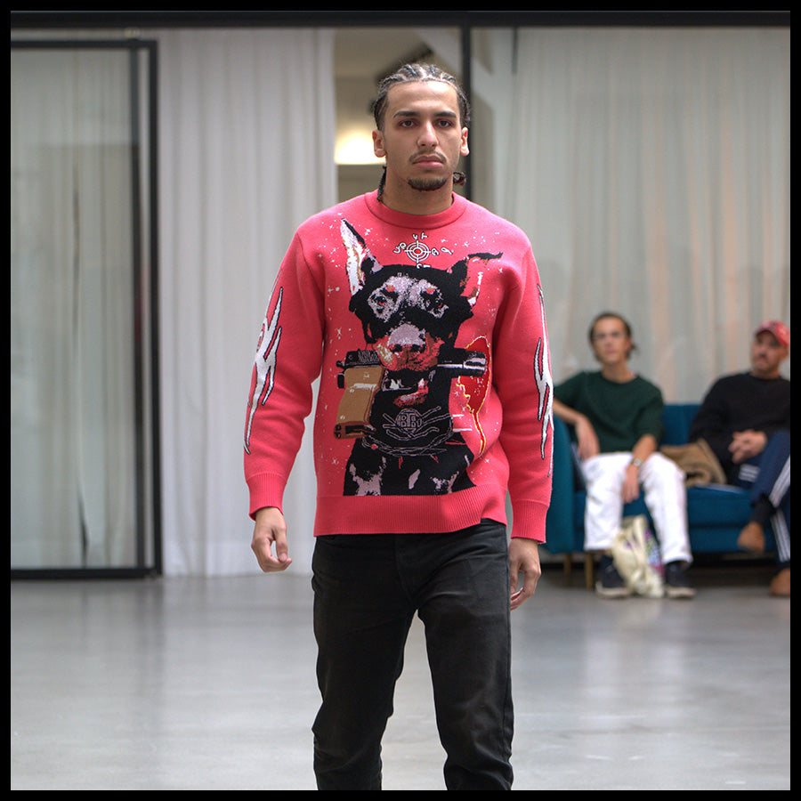 Tech specs: 14gg birdseye jacquard knit (composition: 50% viscose, 30% polyester, 20% nylon), embroidery.