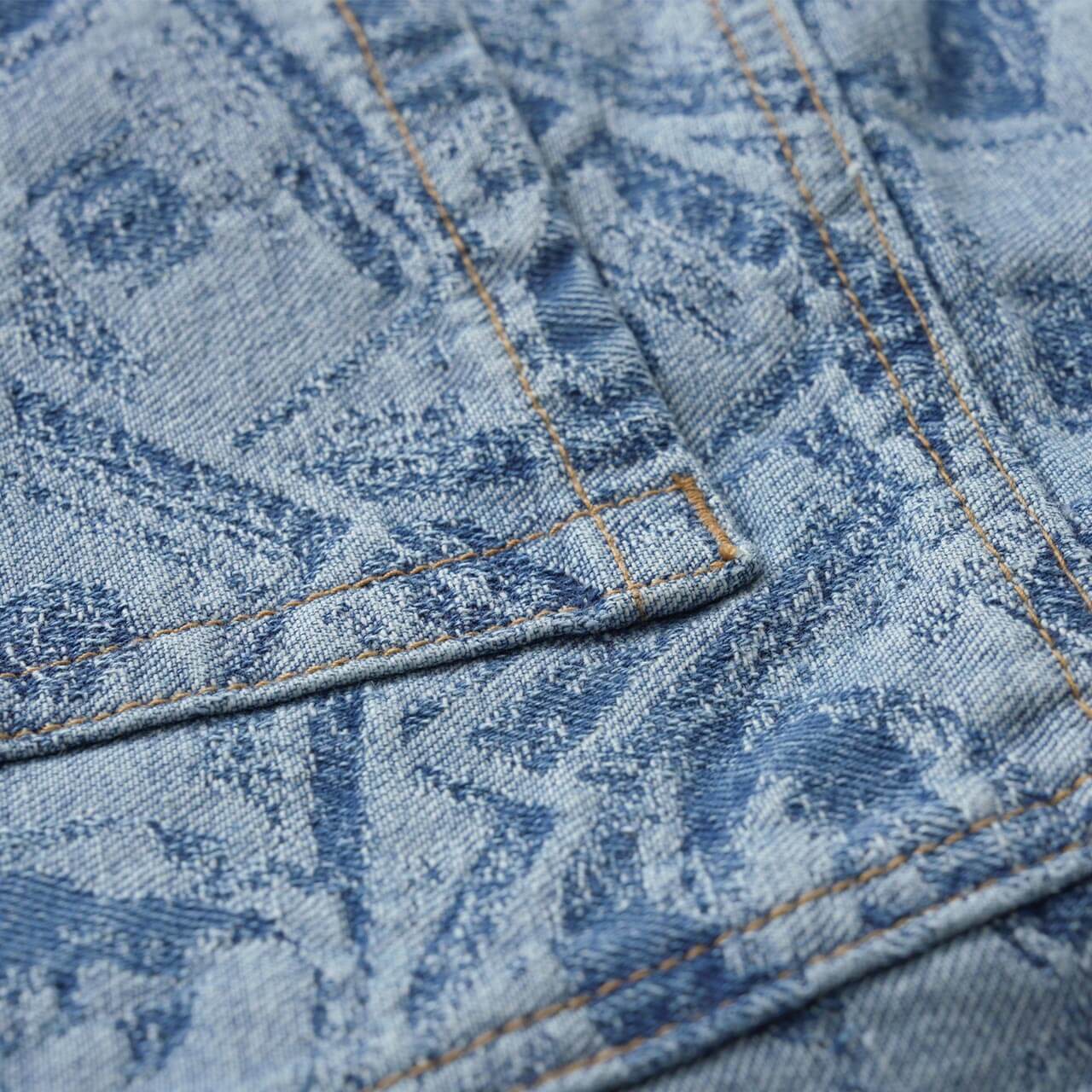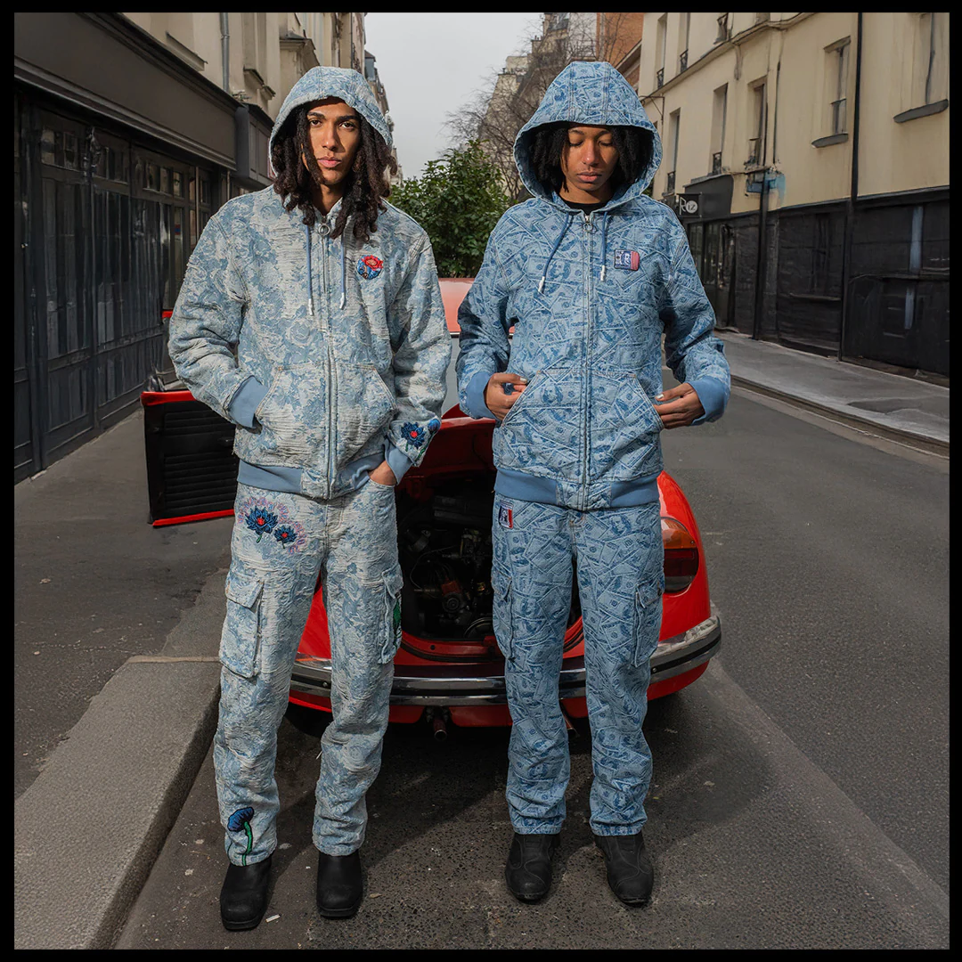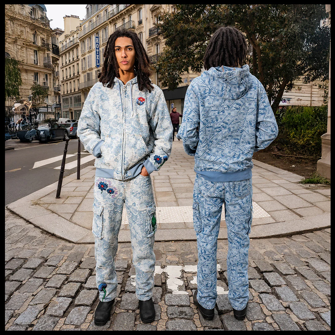 Designed by Raf Reyes: issa bold statement of opulence [💵] ~ crafted with intricate detailing, the jacquard denim is covered in a sea of hundred-dollar bill patterning, screaming luxury & dope-ness 💸✨ [...] the fabric’s rich texture (& meticulous design) embody the allure of ca$h (and success), making it perfect for those who want to wear their fortune on their sleeve 💰🤑.
