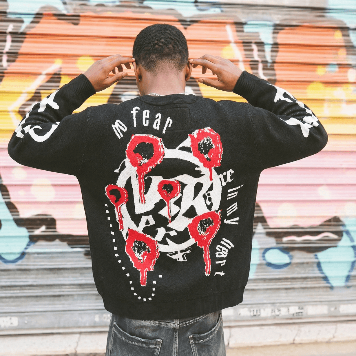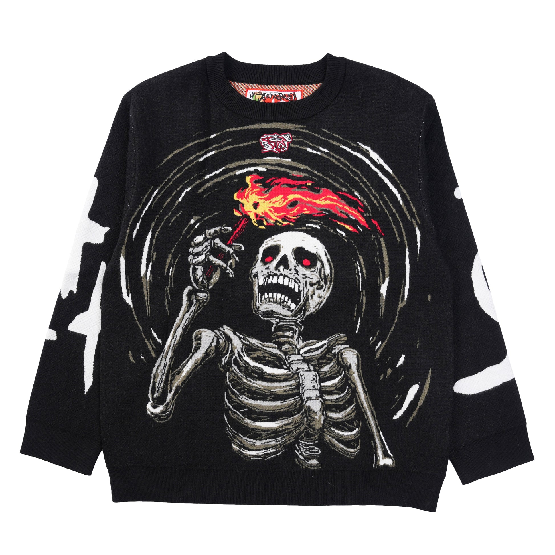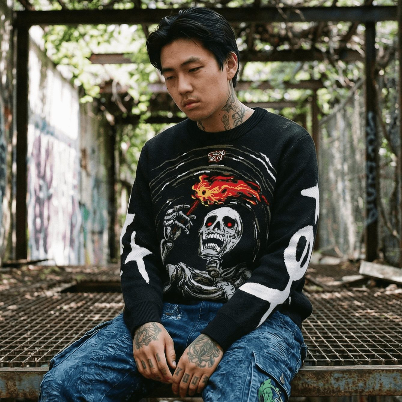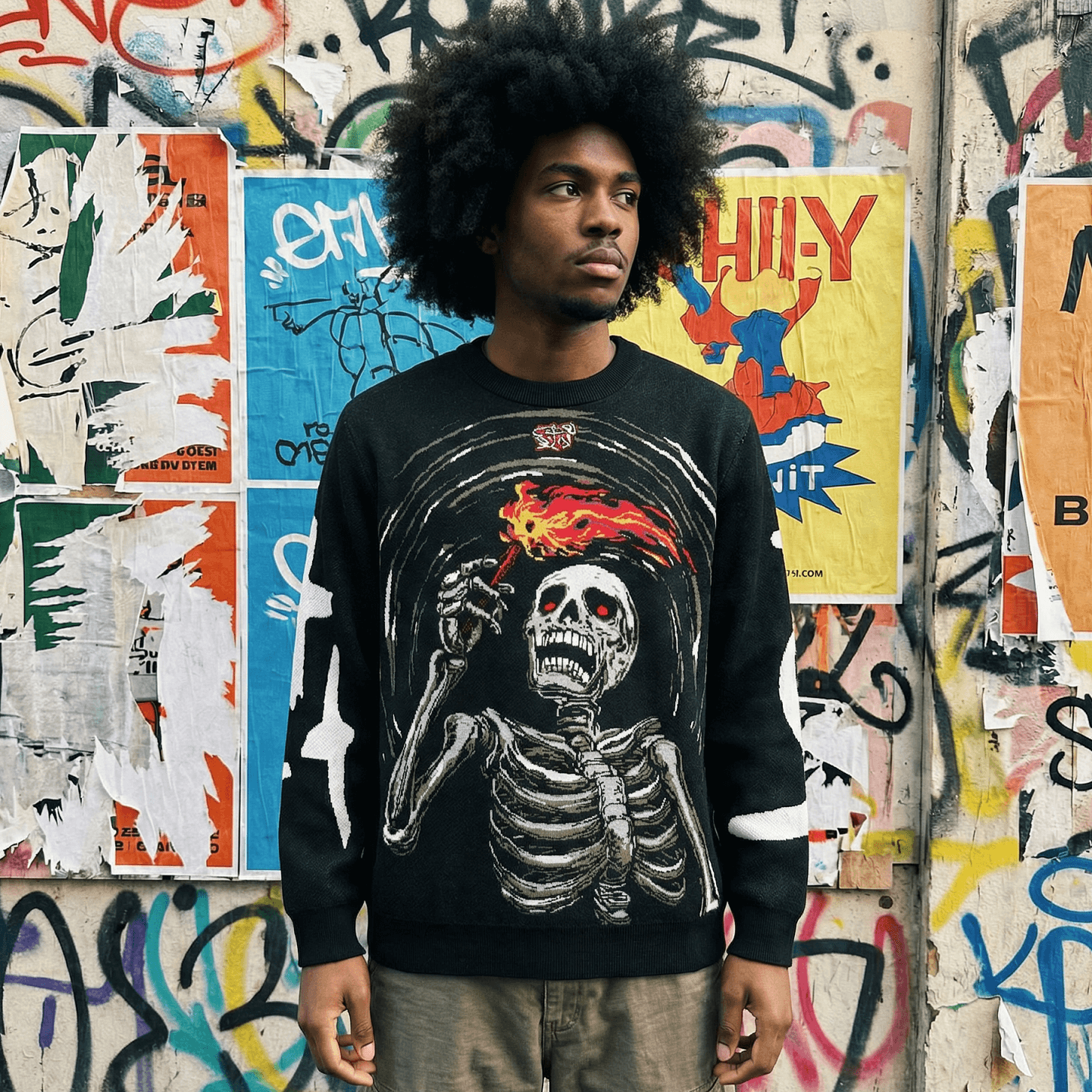 Designed by Raf Reyes: a skeleton lights a match in the abyss — death's grin wide, flame tremblin' — like a joke against eternal black 🃏| | | bled out boney figVRe with six ᵥraw bullet wounds @back piercin' a shattered symbol ⇄ “no fear in my heart” curlin' like a final vow 🖤 it’s the story of defiance: a soul already dead choosing to burn anyway 🔲:: VERYRARE turns agony into ᵥrebellion in pVRe post-death punk light-in-the-grave type shit 🙏📿🏴.