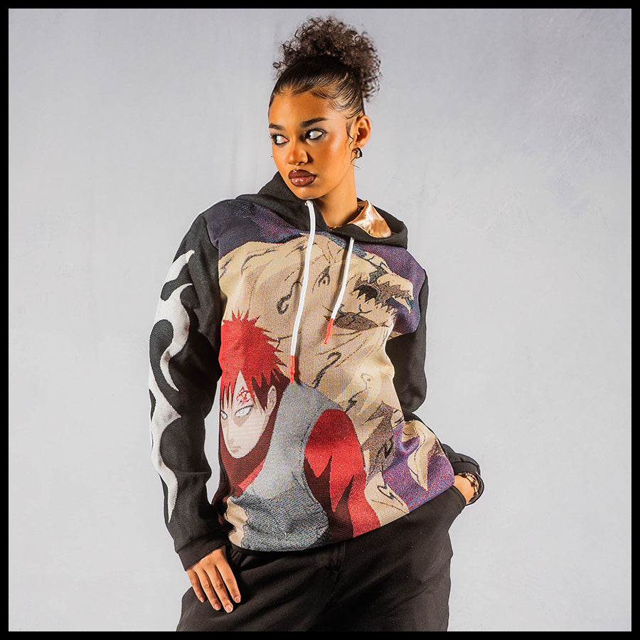 Designed by Raf Reyes: young Gaara stands poised — cold gaze locked — while Shukaku, the One-Tail, looms behind him in a frenzy of cursed sand +++ hatred ~ this scene marks his descent into monstrosity: no love, no guidance, just ᵥraw survival and Jinchuriki trauma [...] that forehead scar reads “love”, but it’s carved from agony.