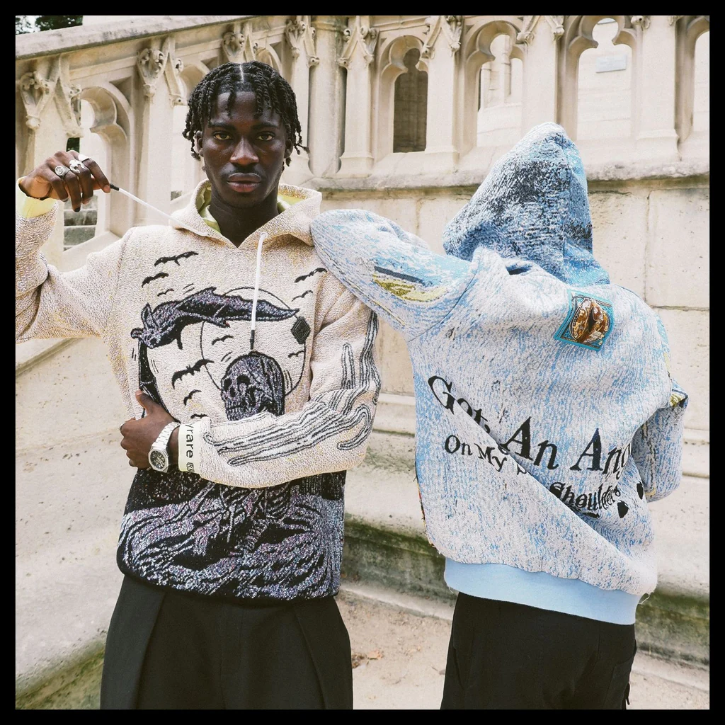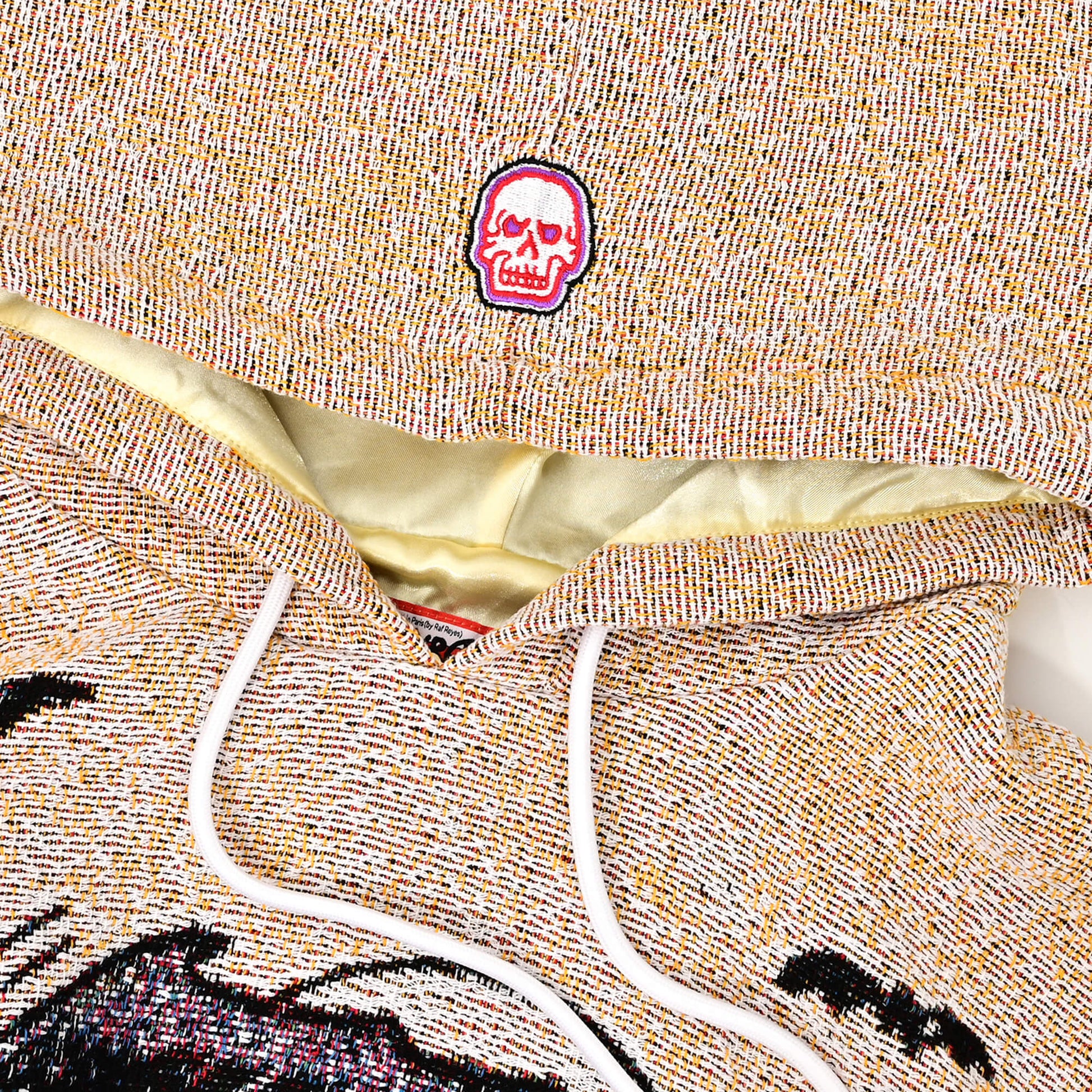 Tech specs: premium jacquard woven tapestry fabric (410gsm polycotton) | | | leather appliqué'd with silver embossed-debossed 'Hell-&-Back'-patch (+ tonal thread'd contour'd), 100% wool ribbings @ sleeves (w/ intarsia logo at cuffs) +++ suede mini-ribbing (at bottom), satin silk lining (inside *fully*), tight-knitt’d drawcords (with compression/coated matte tips), enamel-coated eyelets, metal tag (+ enamel color pouring/coating innit) at back, embroidery at hood.