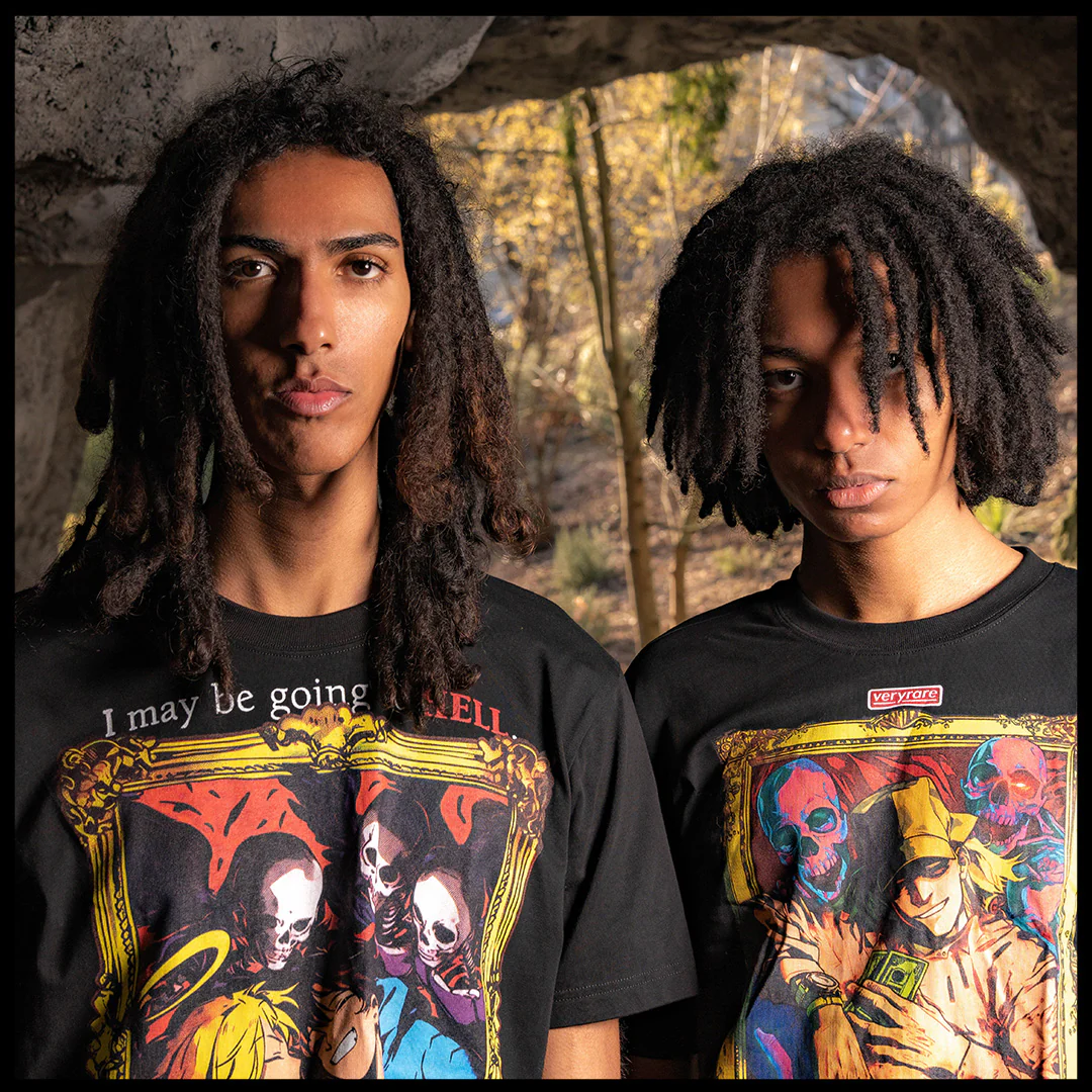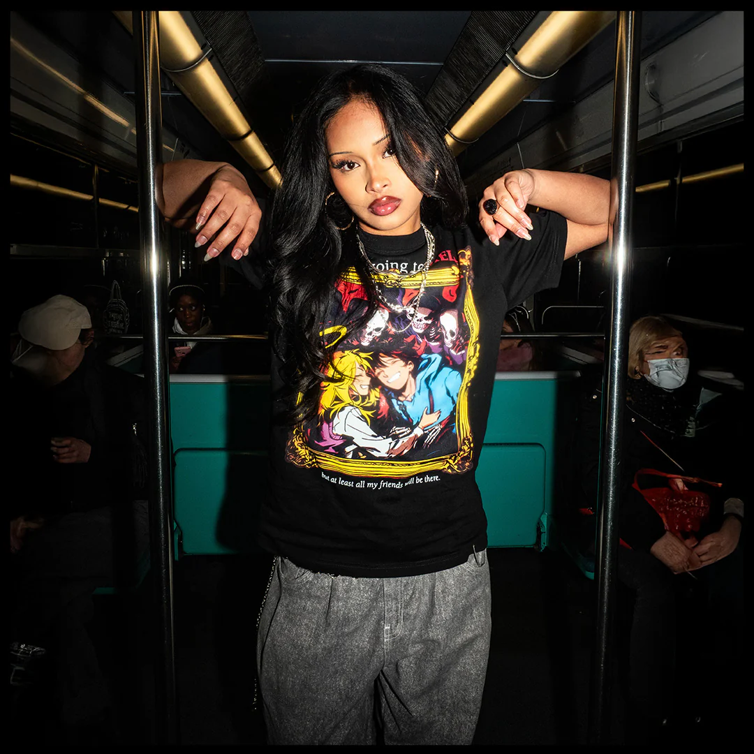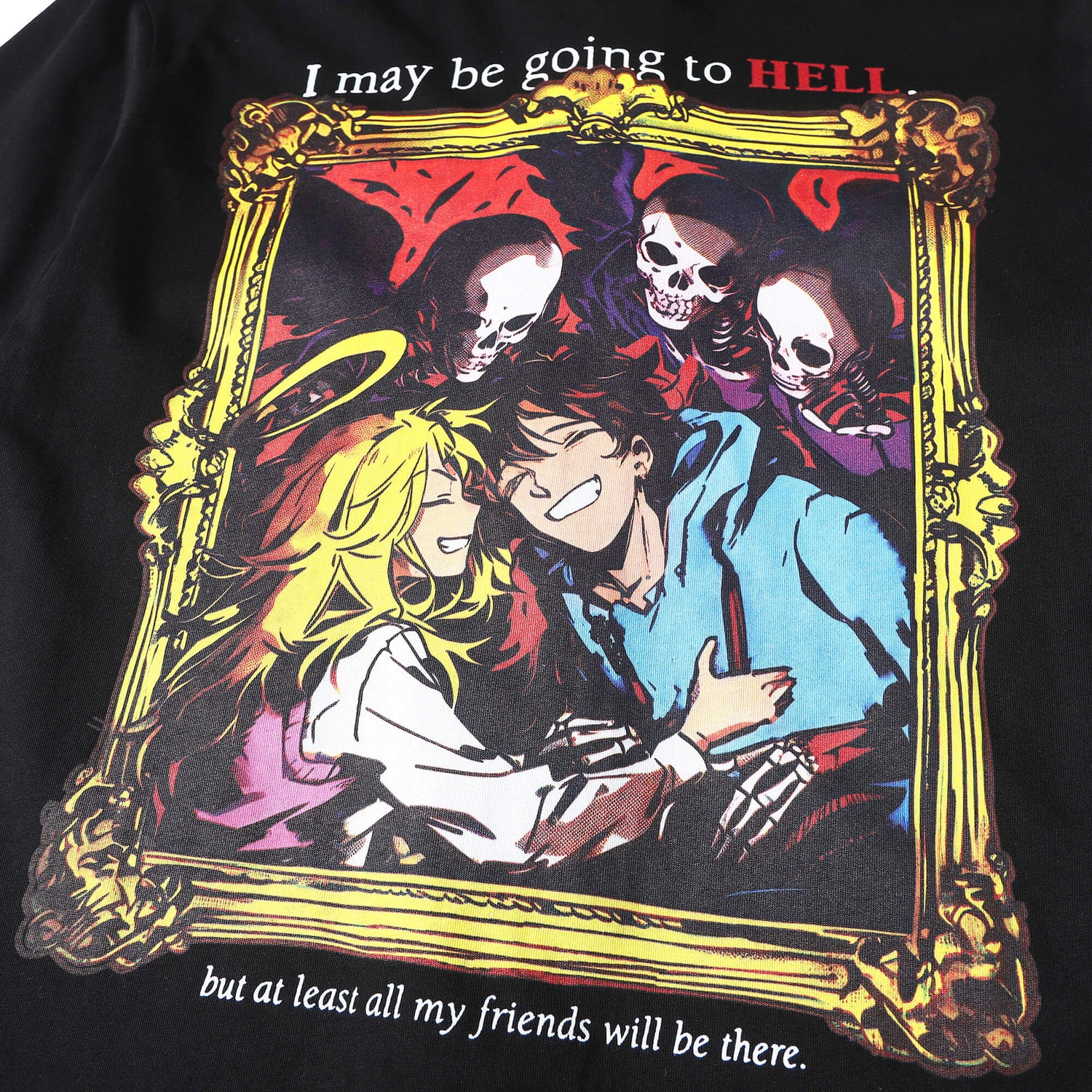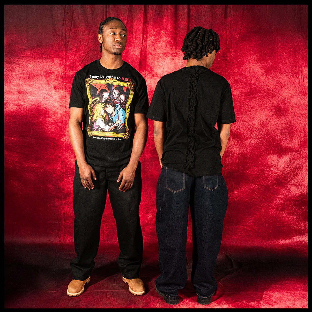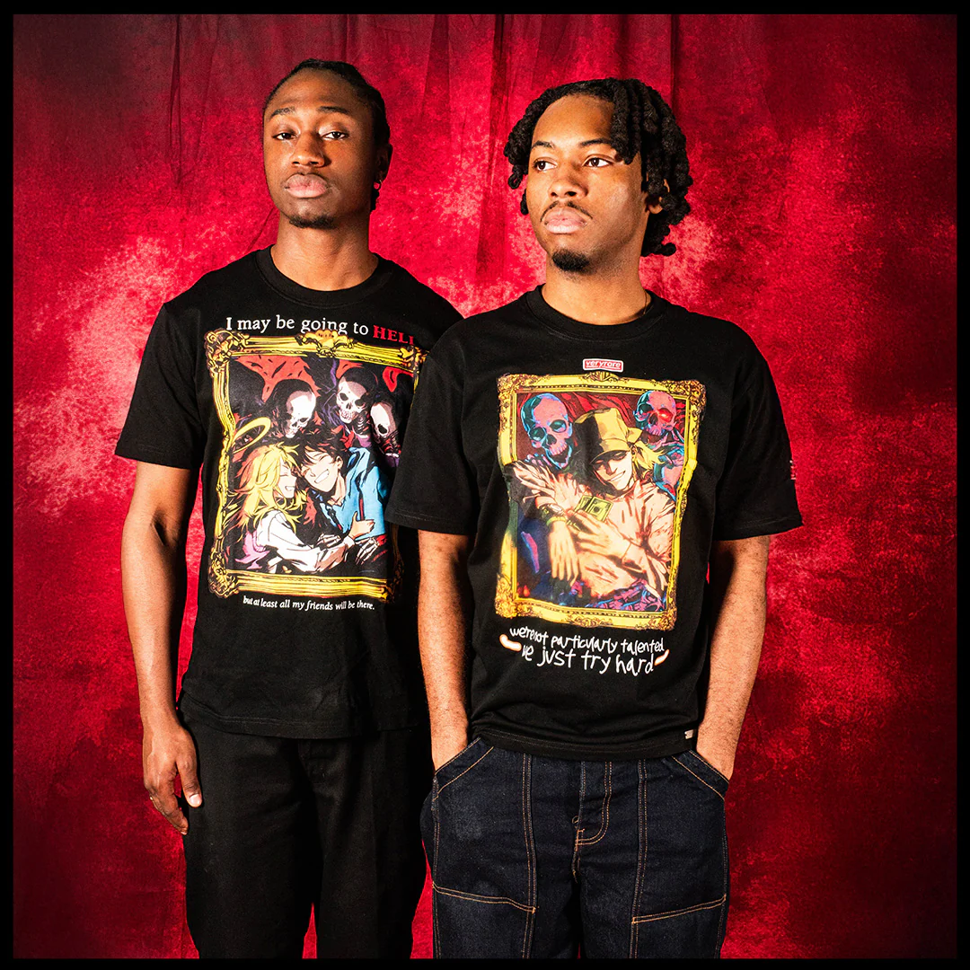 Designed by Raf Reyes: two friends locked in laughter, faces lit with defiant joy, as if they’ve already made peace with their fate 🧿~ behind them loom three shrouded skeletal death-angels — silent, watchful, inevitable — their bony fingers curl close/ᵥready to claim | | | yet the pair doesn’t flinch :: they know where they’re headed [...] and they’re not going alone ⇄ “I may be going to HELL” the frame whispers like prophecy “but at least all my friends will be there” [...] issa final ᵥride-or-die, sealed in ᵥrebellion, blood & fire 🔥💀.