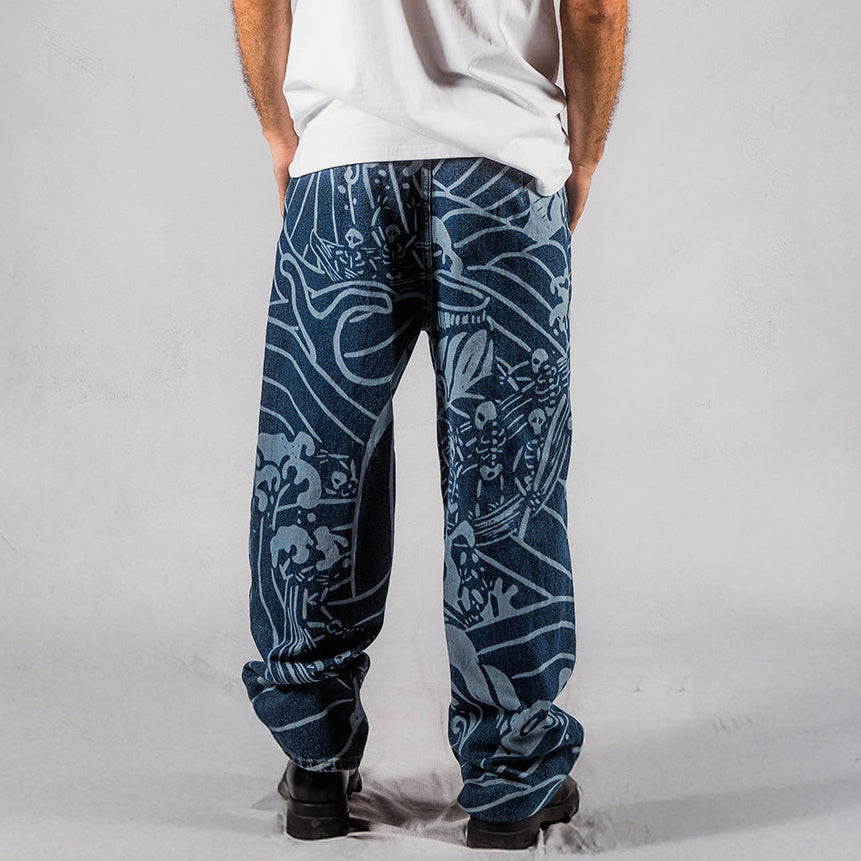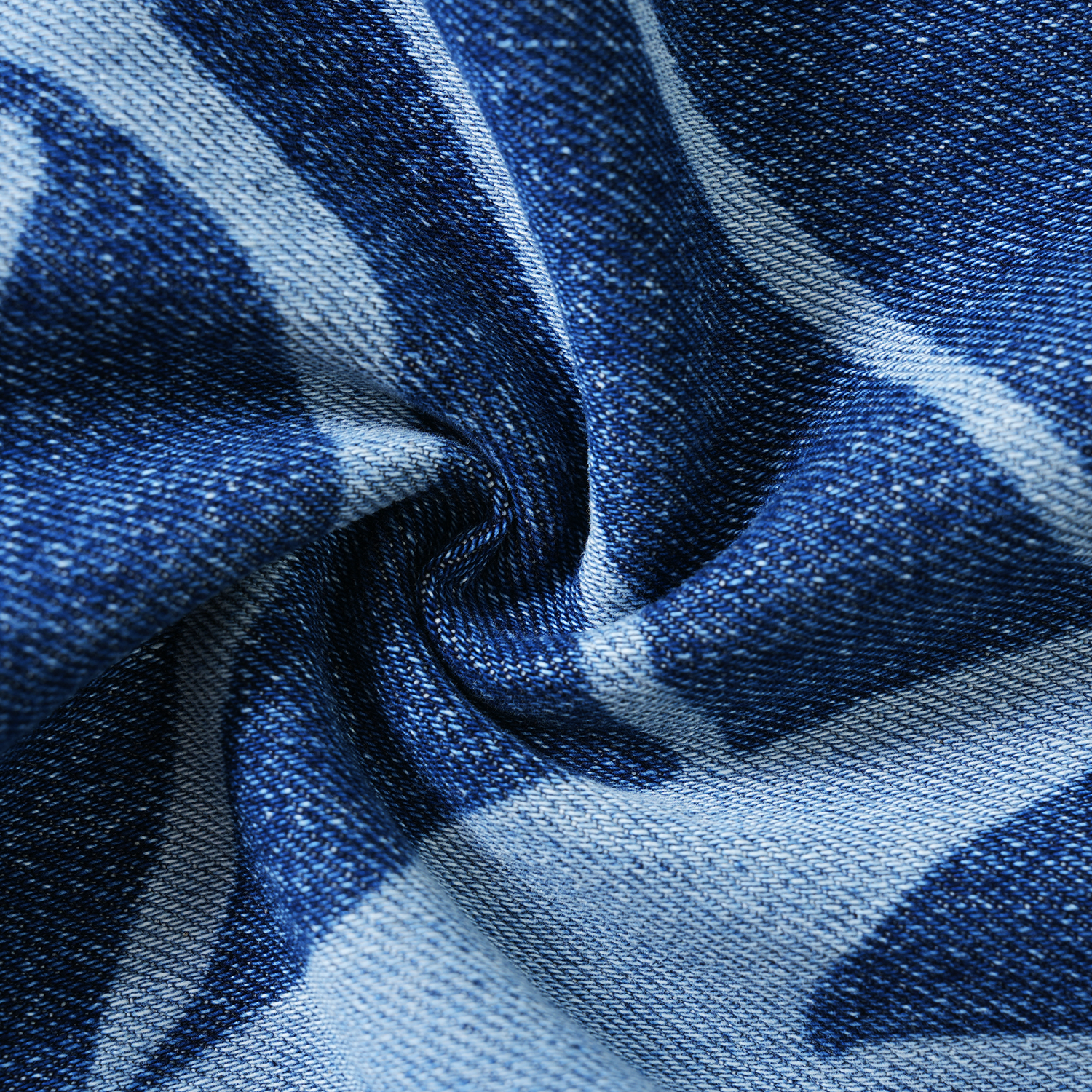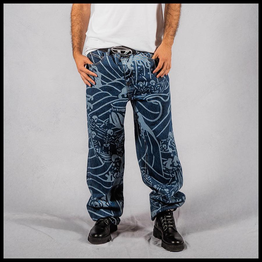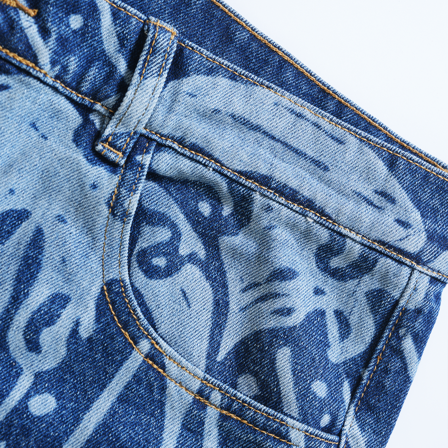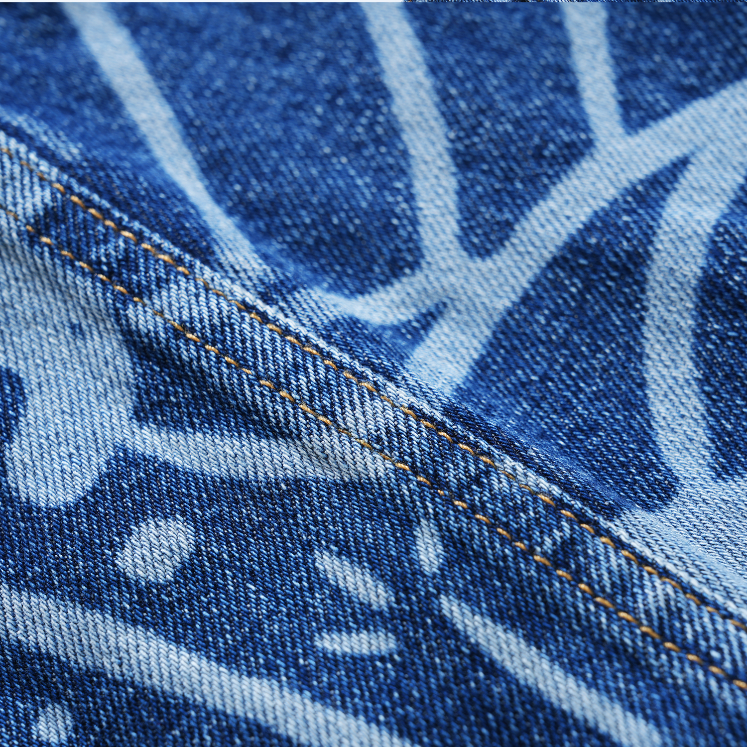Tech specs: 14oz natural indigo-dyed denim (100% cotton) loose/relaxed fit + intricately laser-etched all throughout | | | custom-molded gunmetal branded button, embroidery (at front), real leather jacron (at back).