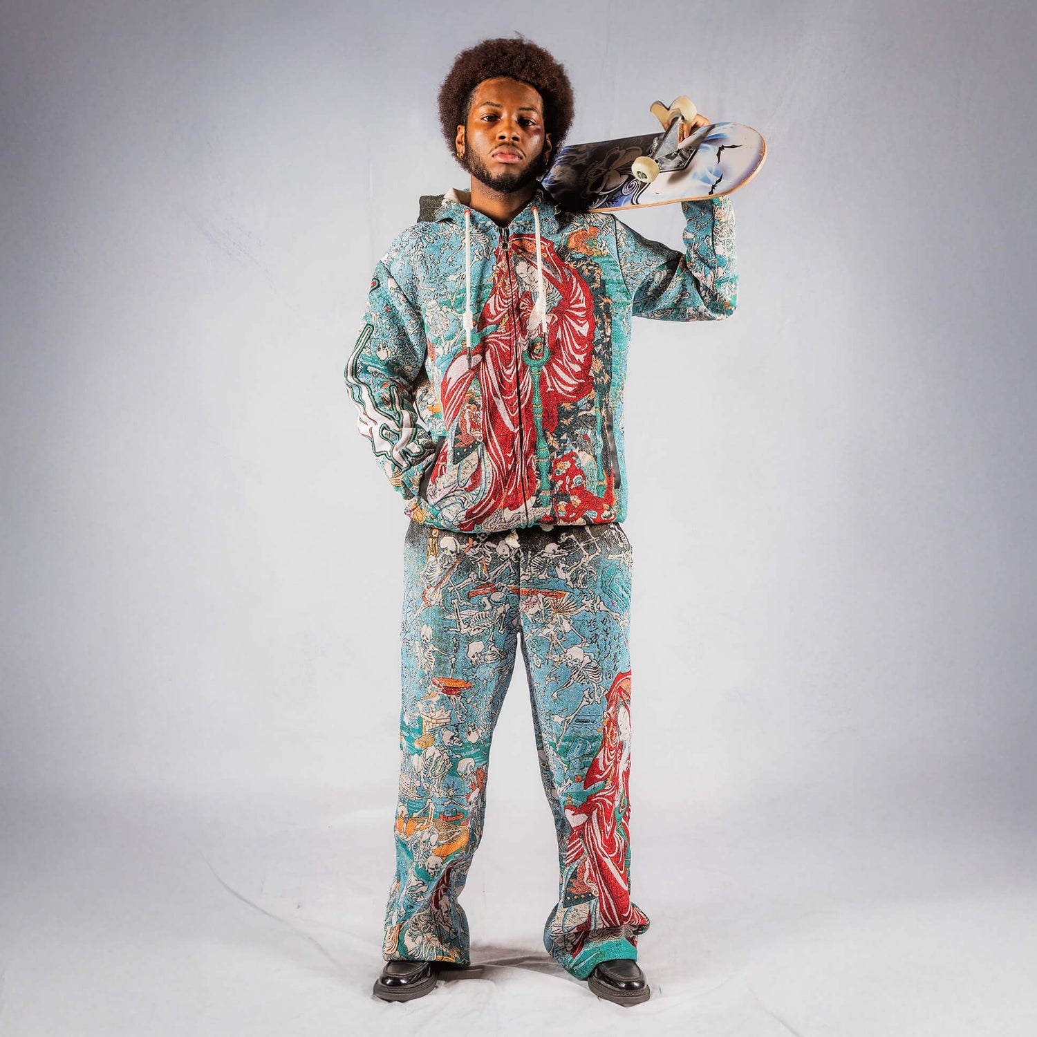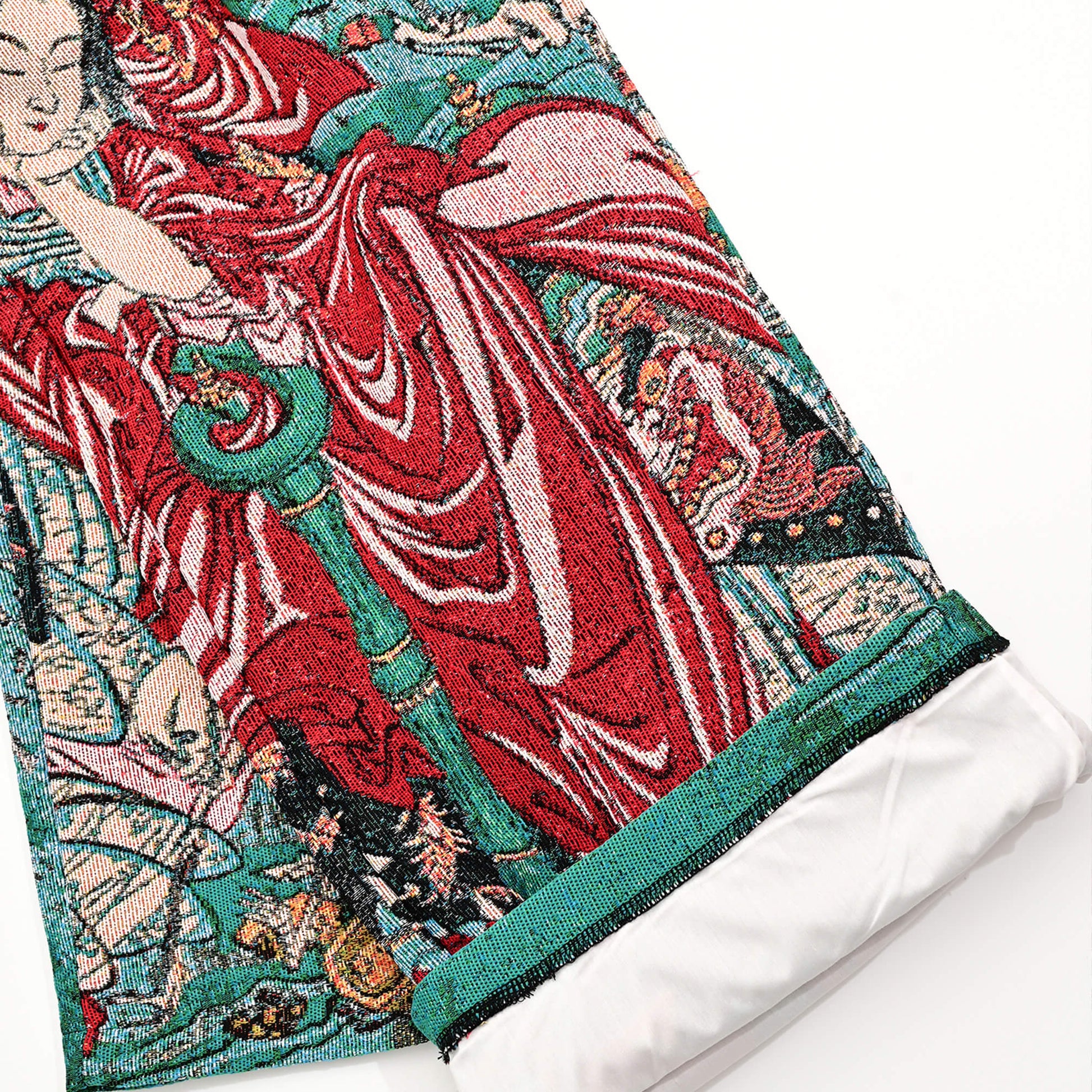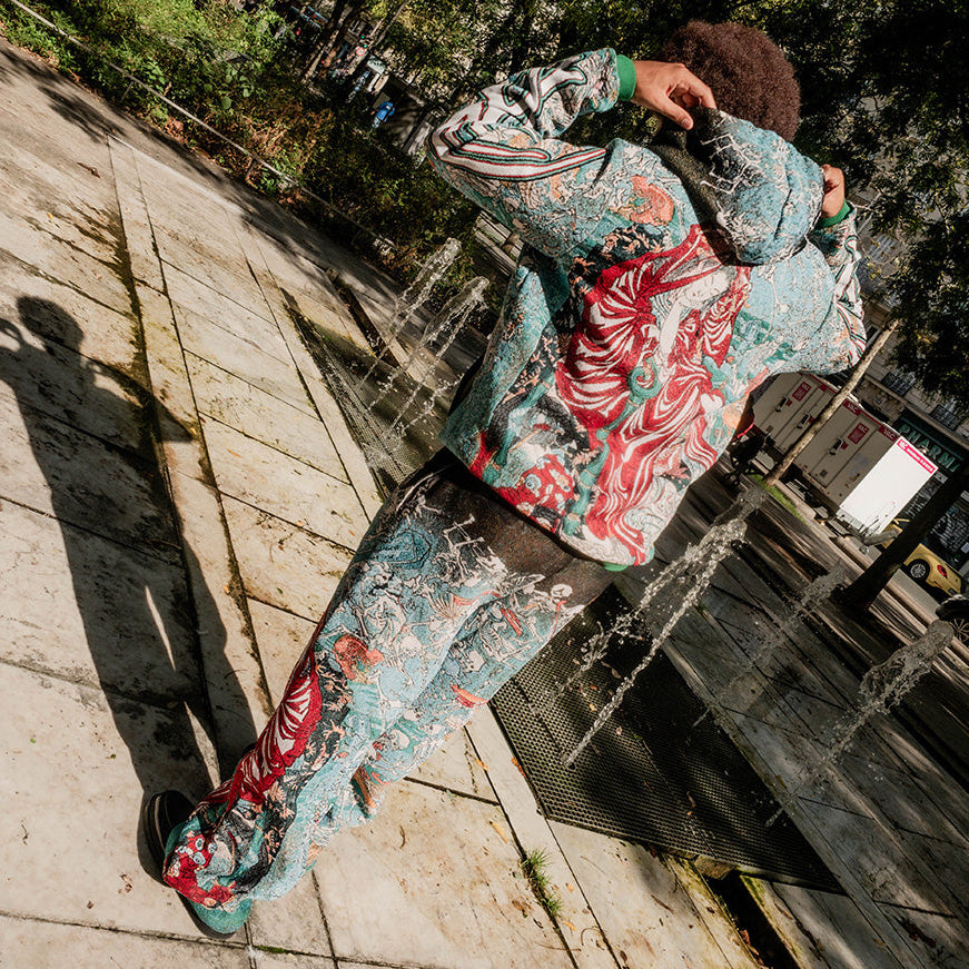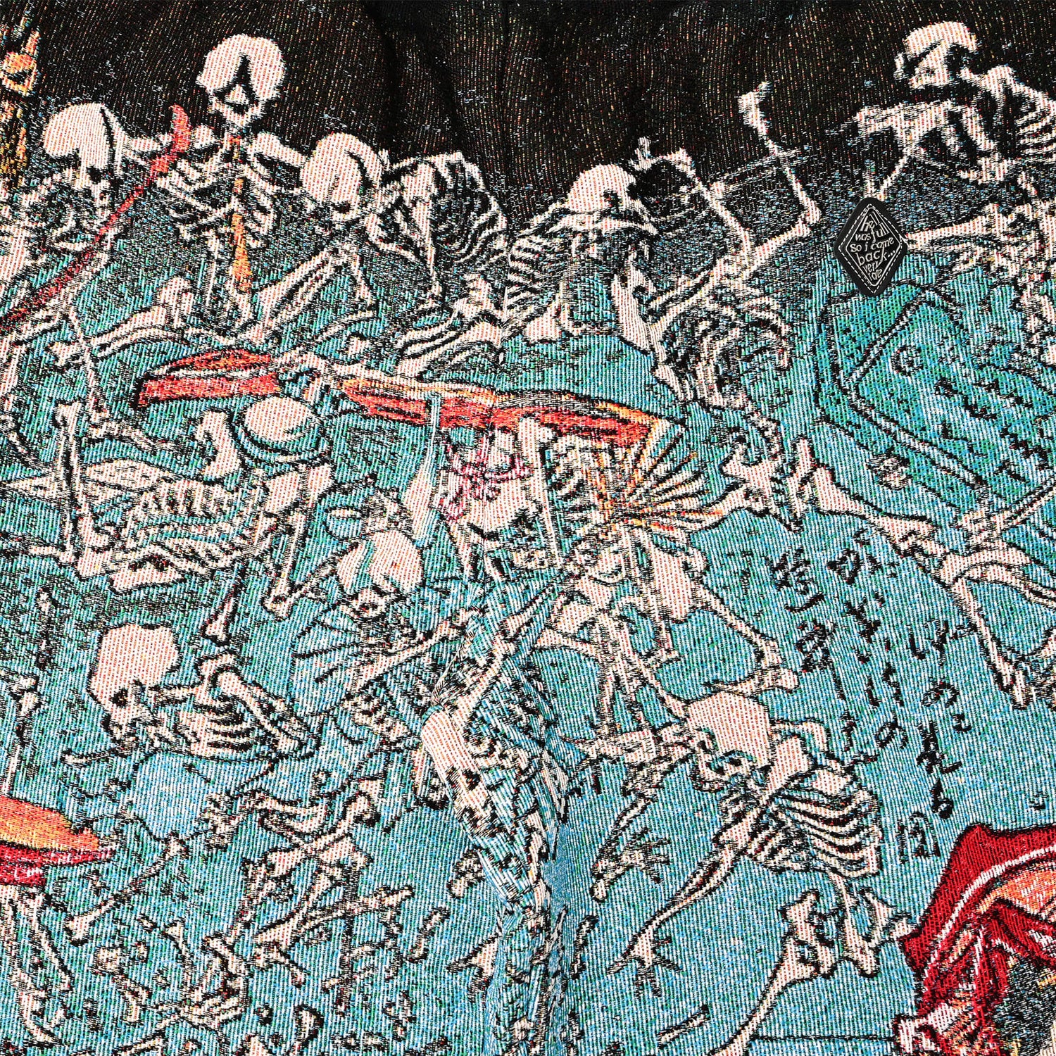Tech specs: premium jacquard woven tapestry fabric (410gsm polycotton) | | | real leather appliqué'd with silver embossed-debossed 'Hell-&-Back'-patch (+ tonal thread'd contour'd), mini samurai ‘rope’ braided belt-system +++ lining’s composition: 50% cotton, 40% rayon, 10% viscose ~