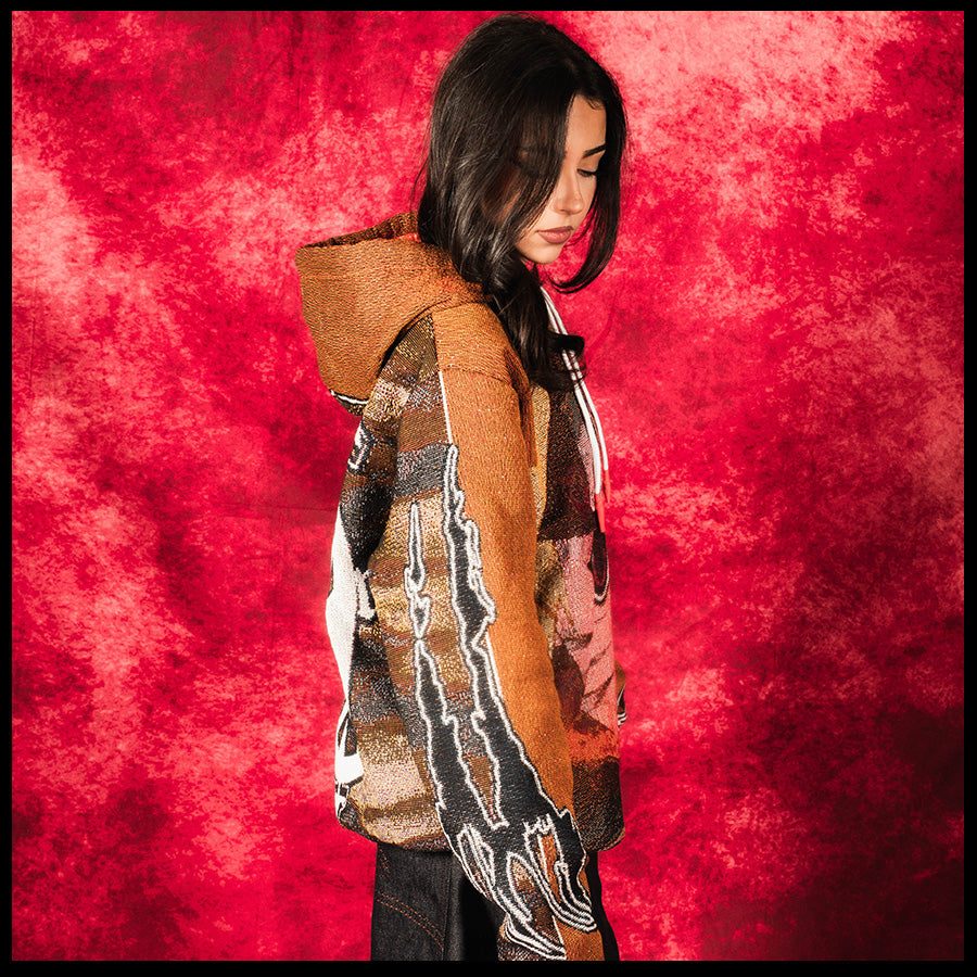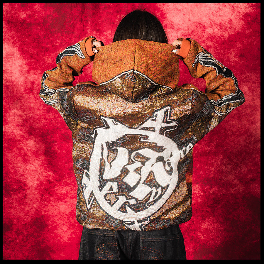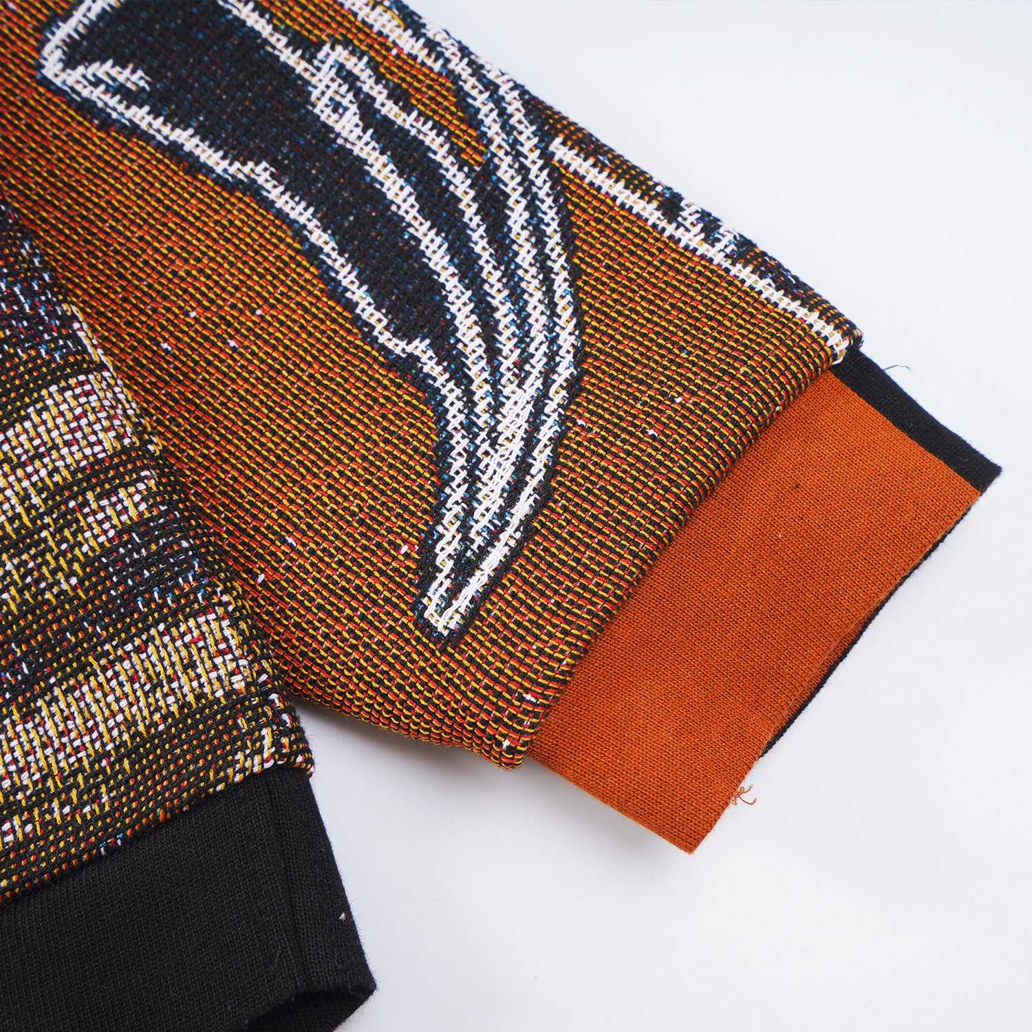 premium jacquard woven tapestry fabric (410gsm polycotton), satin silk lining (inside *fully*), enamel-coated eyelets, tight-knitt’d drawcords (with compression/coated matte tips) | | | 100% wool ribbings @ bottom & sleeves (w/ intarsia logo at cuffs) ~