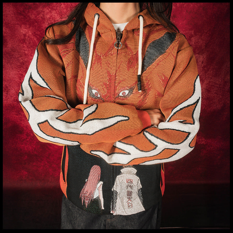 Designed by Raf Reyes: Kurama — feral and massive — looms over Minato and Kushina as they face death to protect their newborn ~ this the sealing scene: love weaponized w/ sacrifice ⇄ the Fourth Hokage and his wife don’t flinch [...] they anchor the beast inside their son ⇄ chakra becomes cradle ~ the design stitches the myth into fiber/fabric — parents becoming barrier, fox becoming burden, destiny shaped in blood and flame.