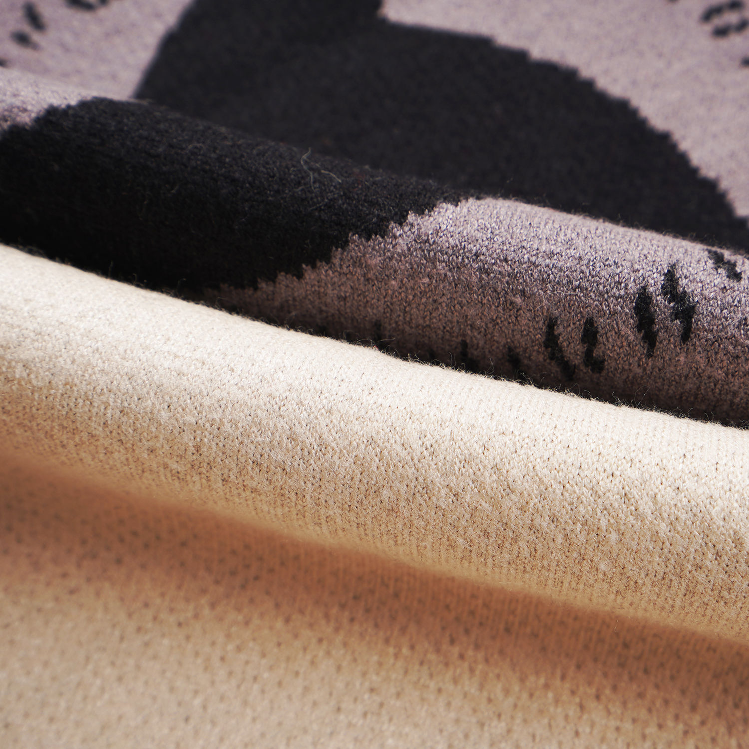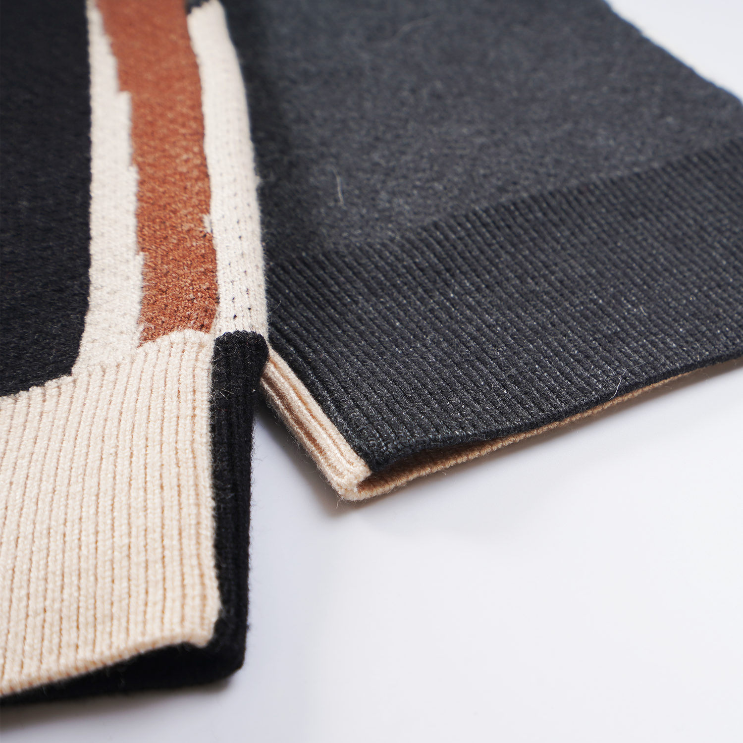 14gg birdseye jacquard knit (composition: 50% viscose, 30% polyester, 20% nylon), tubular/tonal hems.
