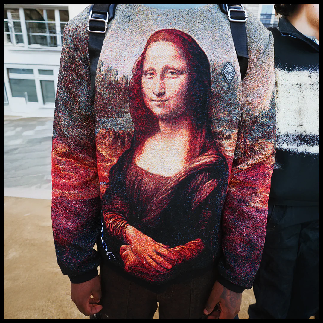 Designed by Raf Reyes: Design by Raf Reyes: in the world of fine ᵥRenaissance art, Leonardo da Vinci's masterpiece, the Mona Lisa, is ᵥrenowned for her enigmatic smile 🖼~ stolen from her museum wall, a shadowy tale emerges, shrouding History in mystery 📜--- it symbolizes artistic brilliance & a daring heist innit ⇄ a testament to high-Art's enduring power & fascination with 'La Joconde' 🎨♾️.