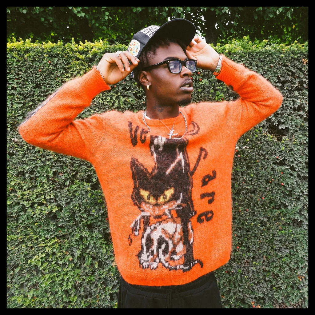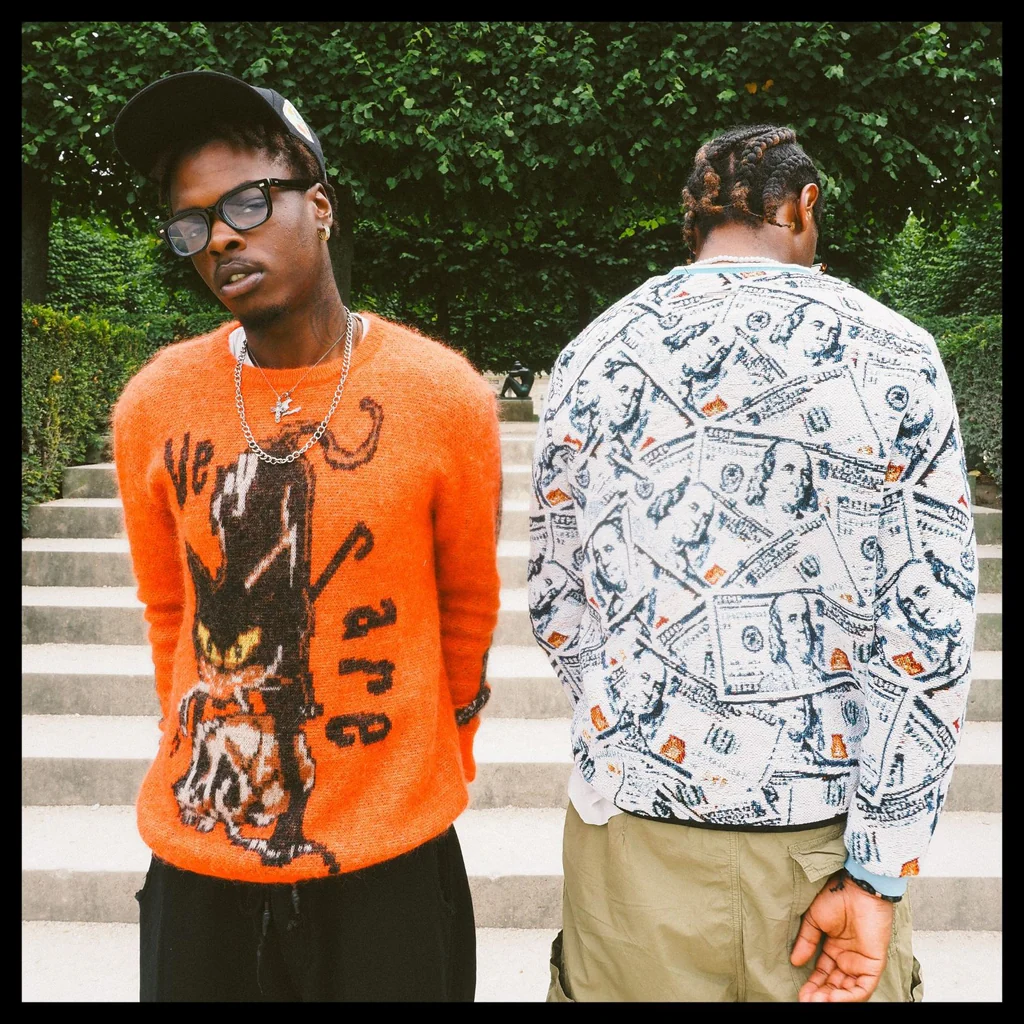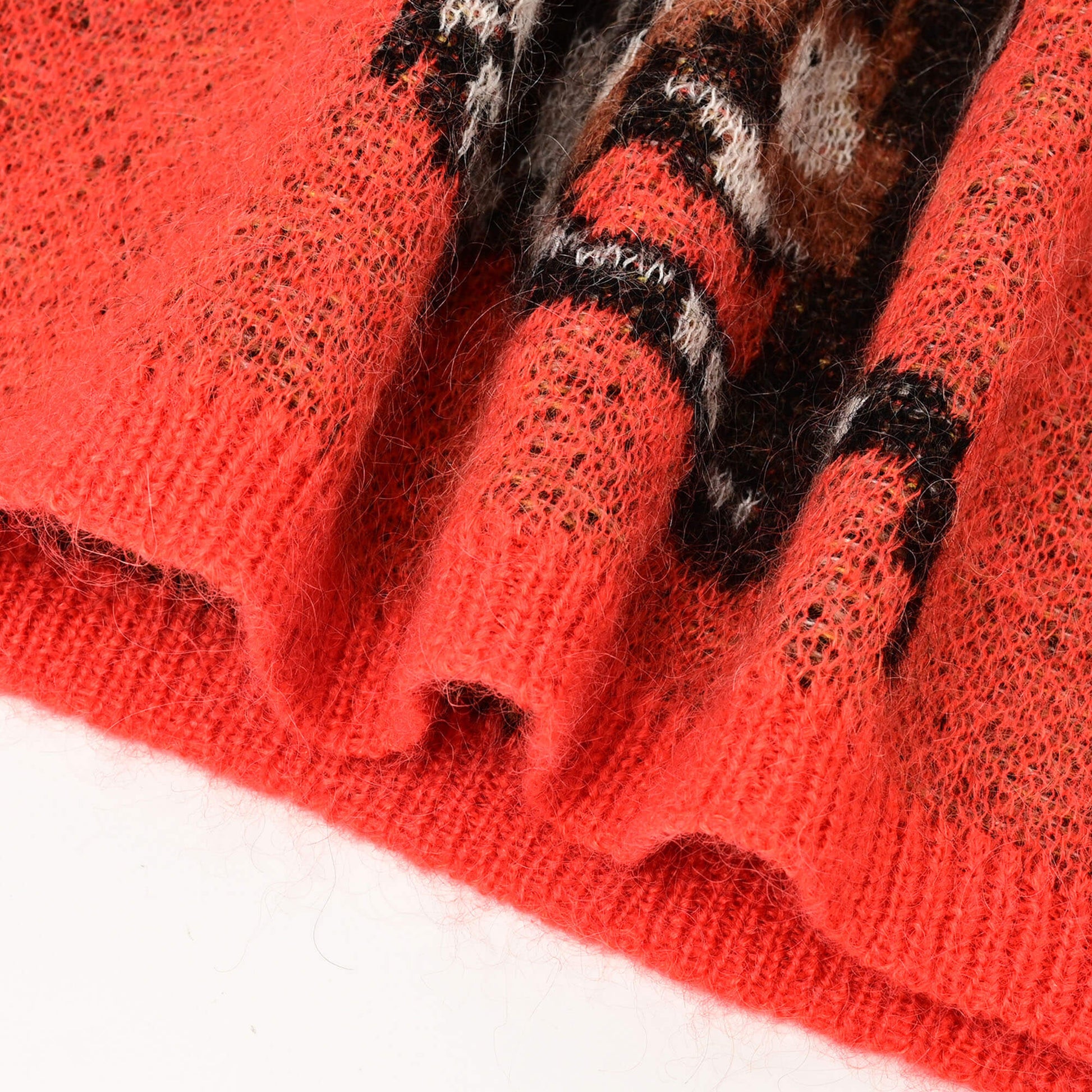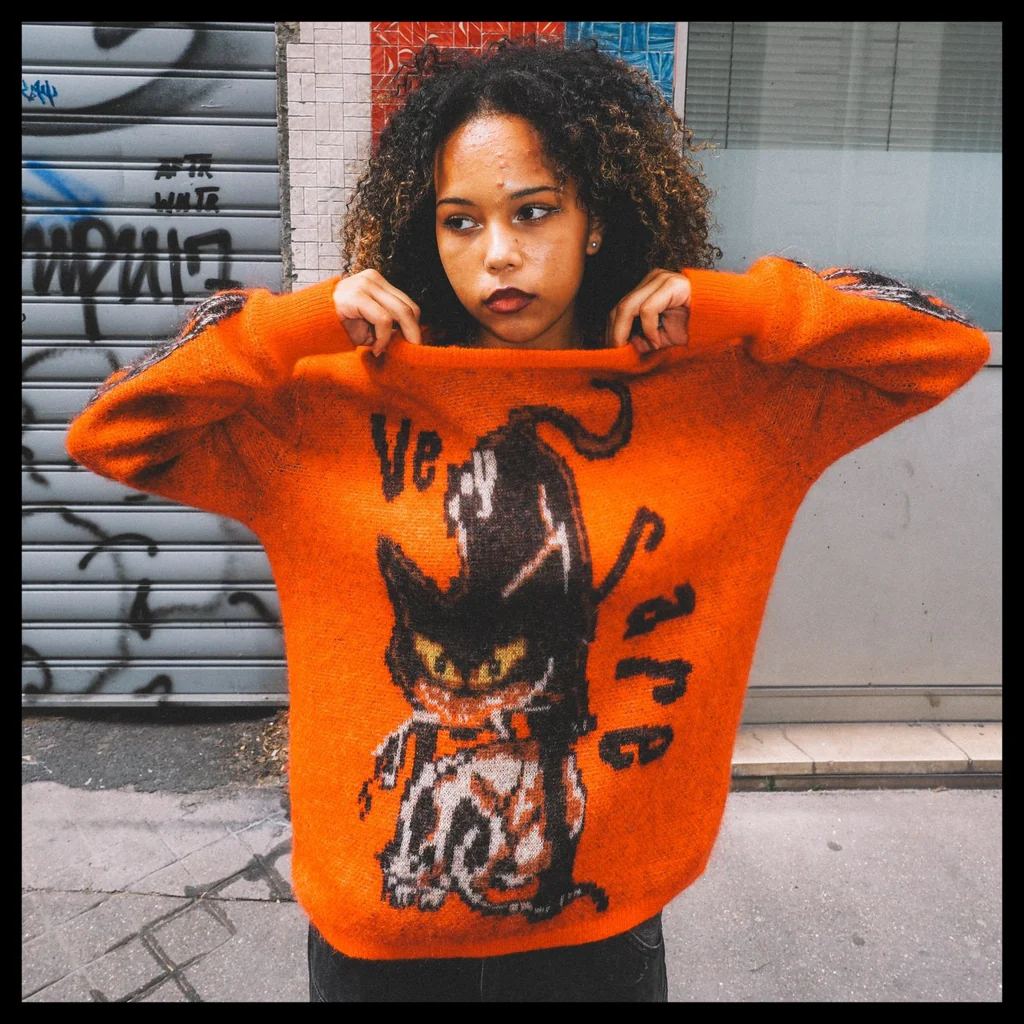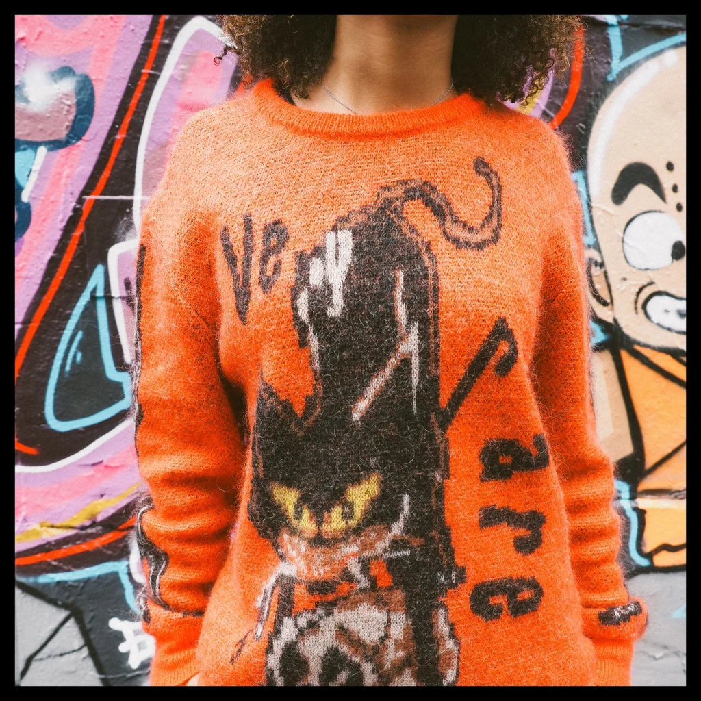Tech specs: midweight/slight-stretch long-sleeve crewneck jumper (30% mohair, 30% merino wool, 40% nylon), pulls on, relaxed fit, 'Neko/Hebi' & 'VRARE 💿 ᵥrecords' graphics/motifs at front and back, ribbed trims.