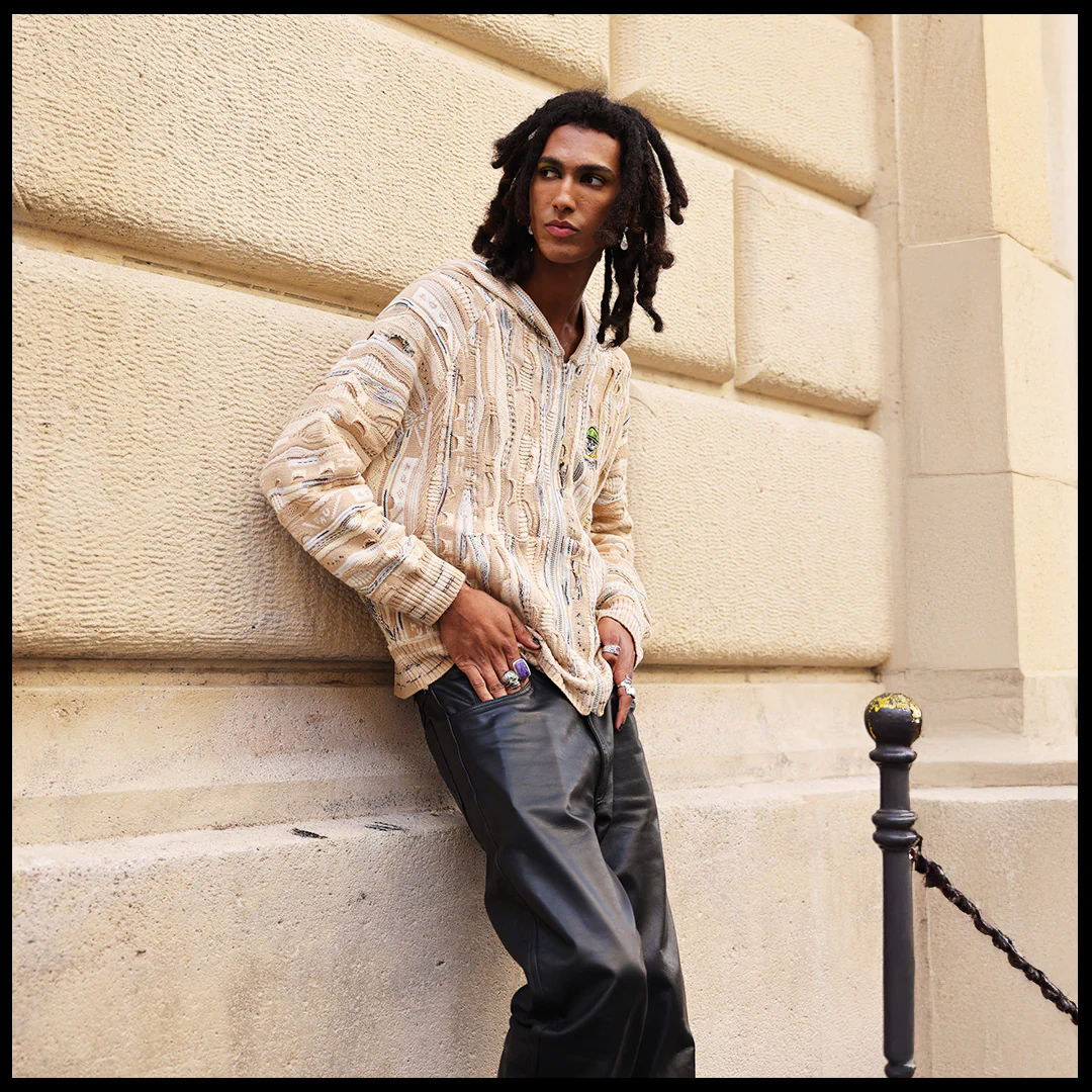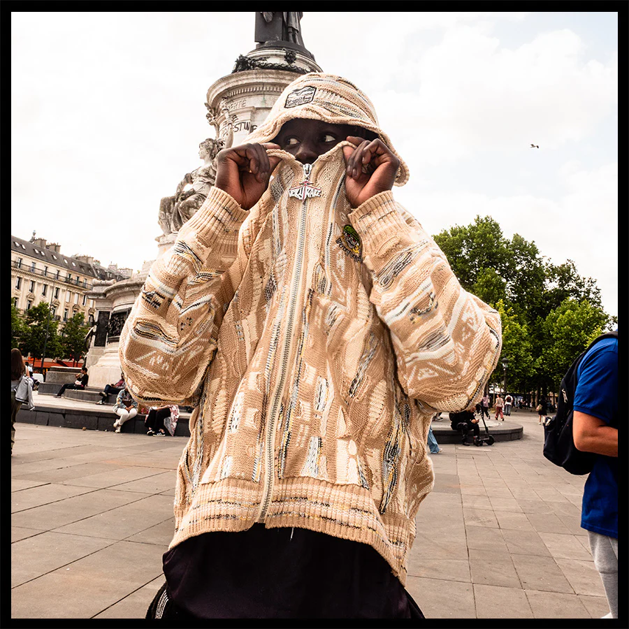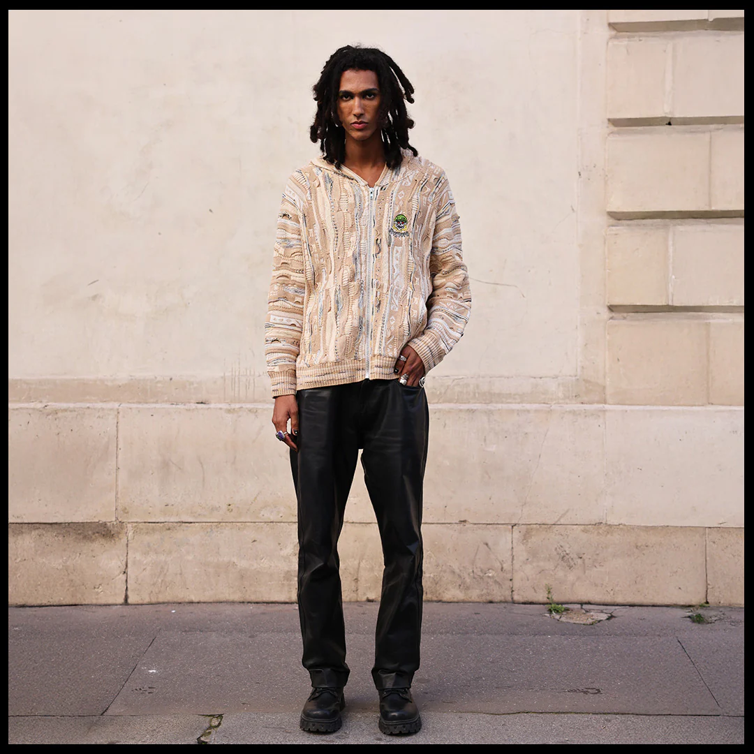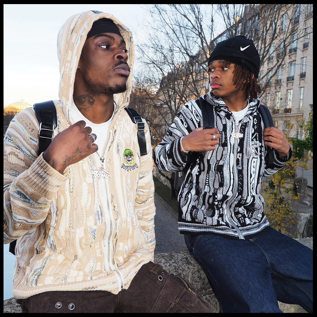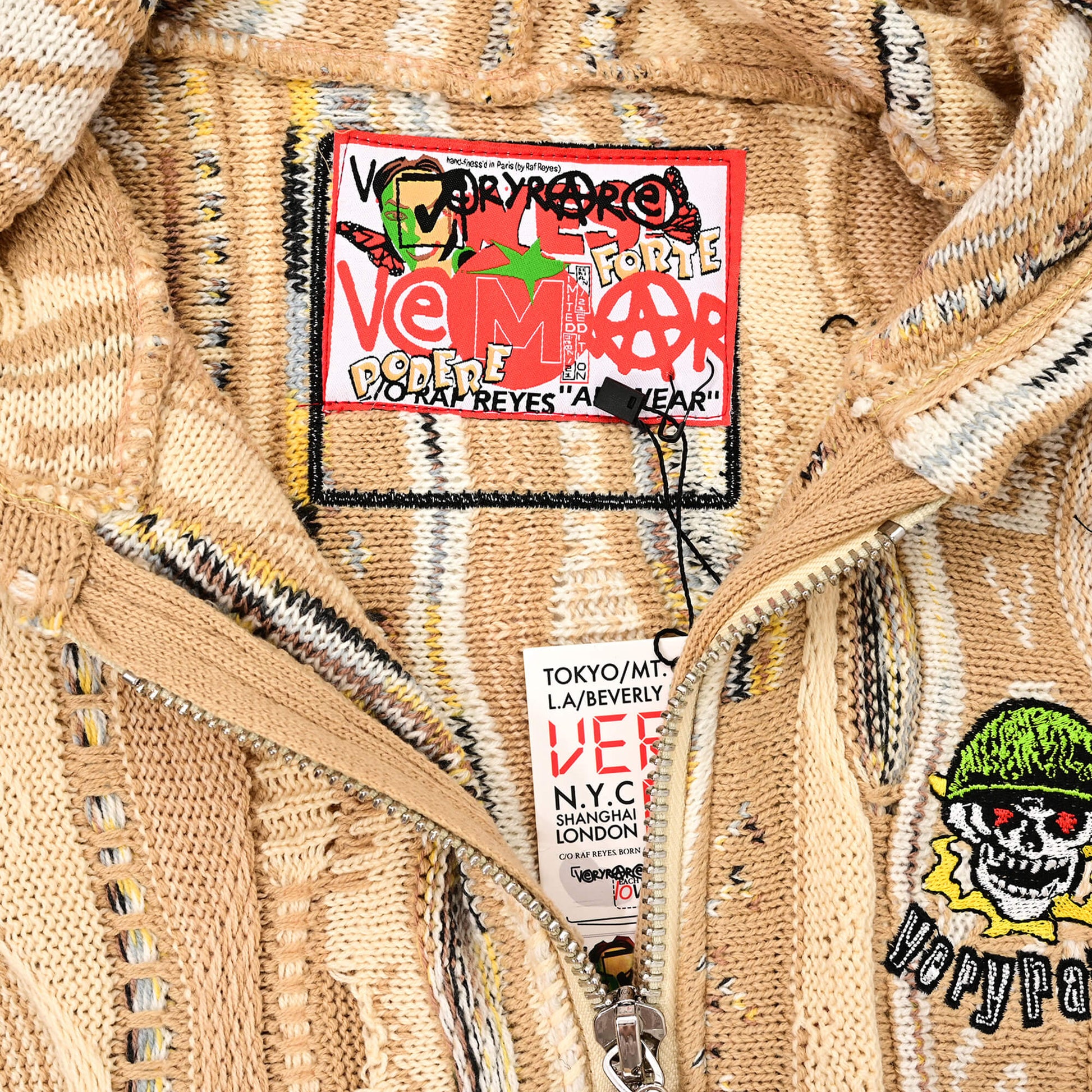 Tech specs: 460gsm mercerized cotton (100%) textured knit crewneck to achieve the softest handfeel producible 🤤 +++ different levels of knittingness raise/relief (& gauge) for extra extra dopeness innit | | | custom-molded enamel'd poured silver puller | | | embroidery + woven tags sewn @ front, hood & back 🪡~