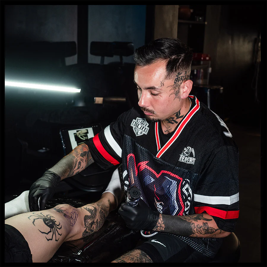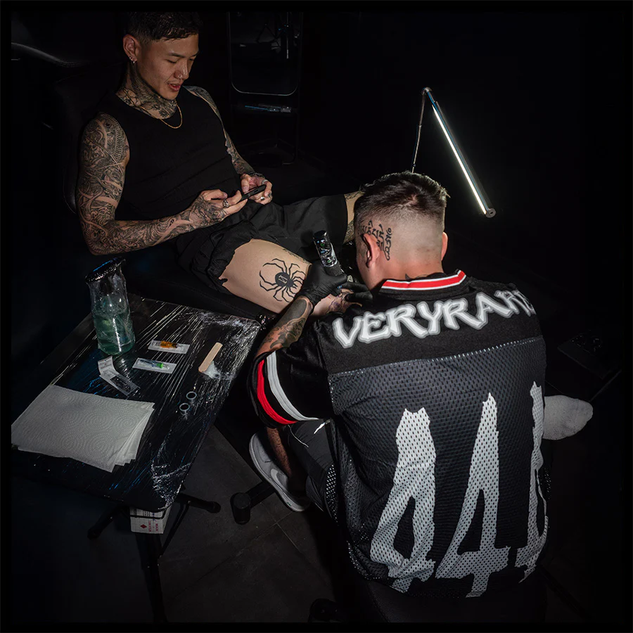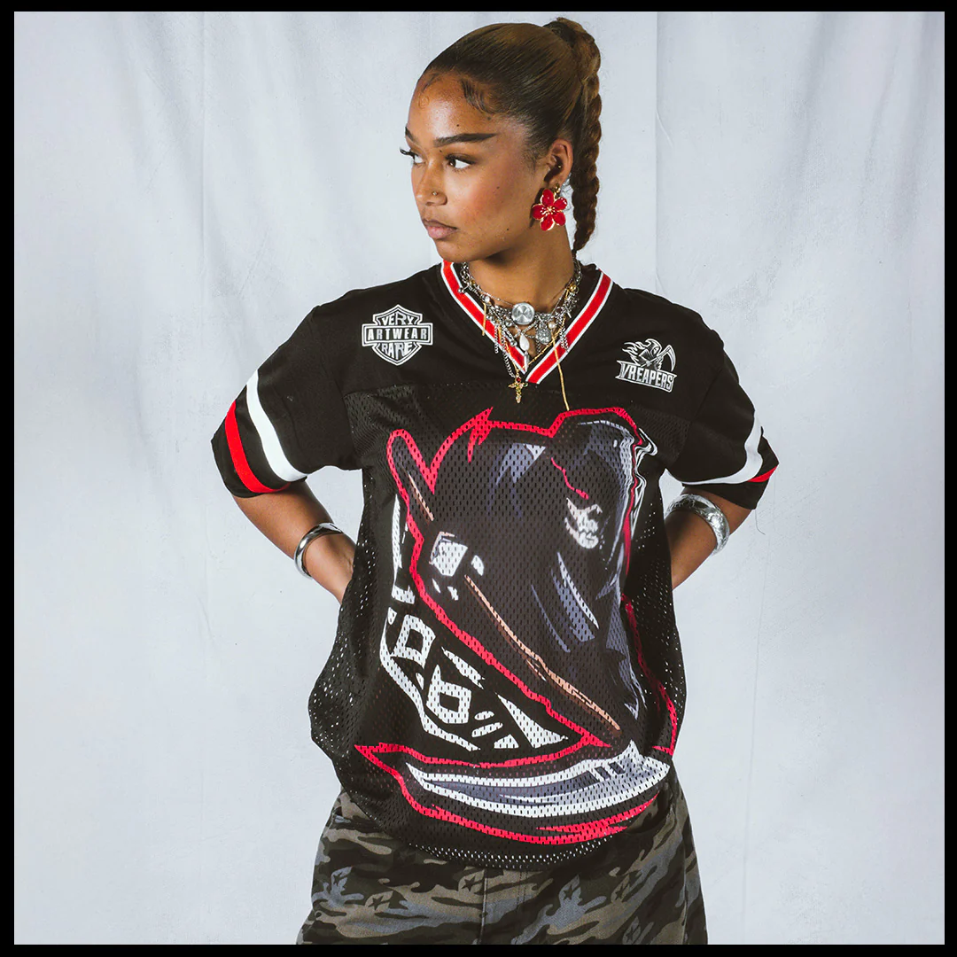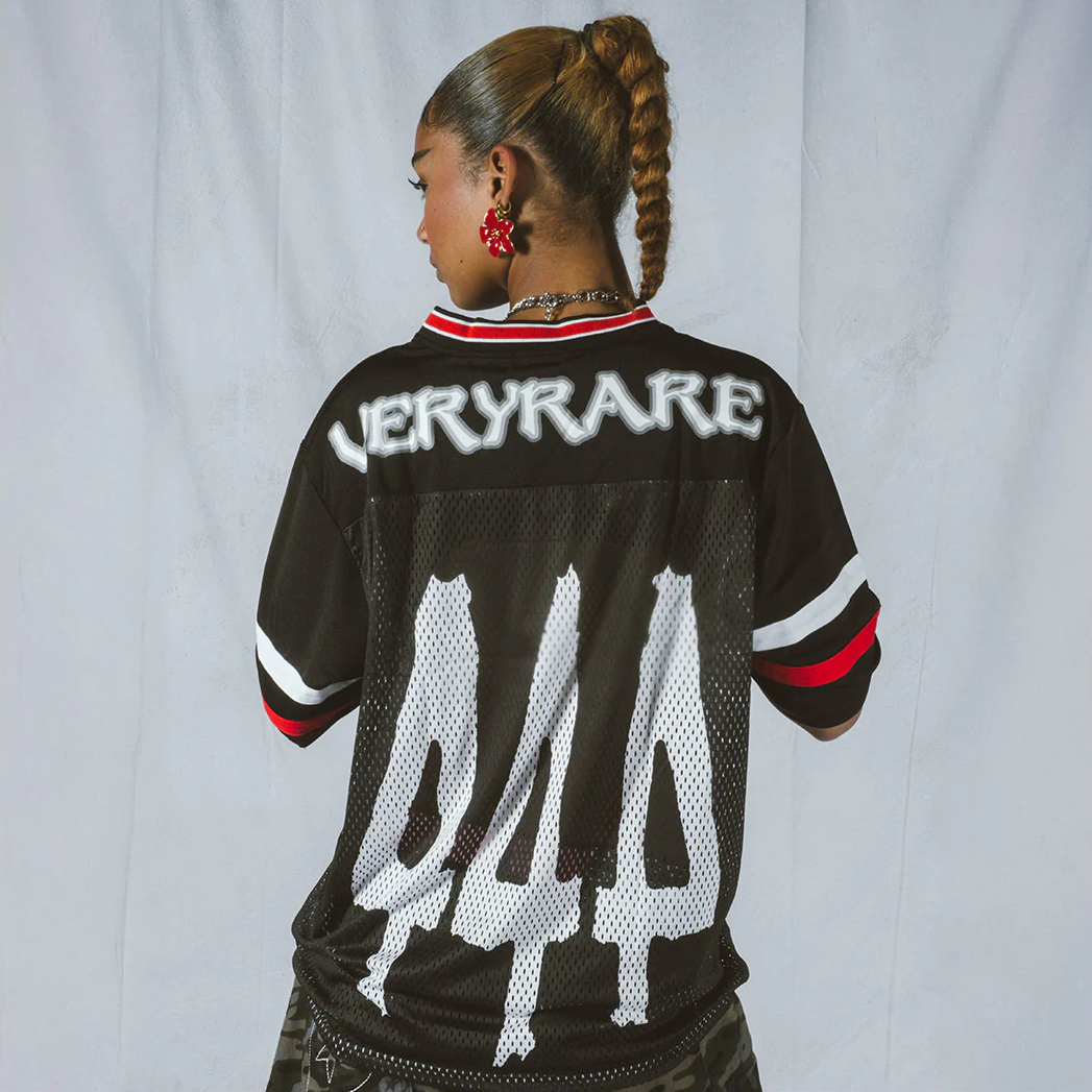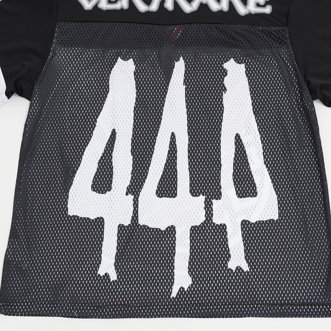 Tech specs: mediumweight ultra-premium mesh jersey (75% polyester | 20% polyamide | 5% cotton) | | | oversized 'ᵥReaper' graphic (@ front) + '444' (@ back) | | | VERYRARE teamwear 'motors' logo & soccer crest printed at front and back on dual-fabric build ⇄ breathable mesh body w/ tighter-knit athletic jersey panel across upper chest & shoulders for contrast & structure | | | athletic stripes 'appliqués' sewn on sleeves + V-neck rib collar | | | loose-cut fit w/ dropped shoulders for flow & breathability.