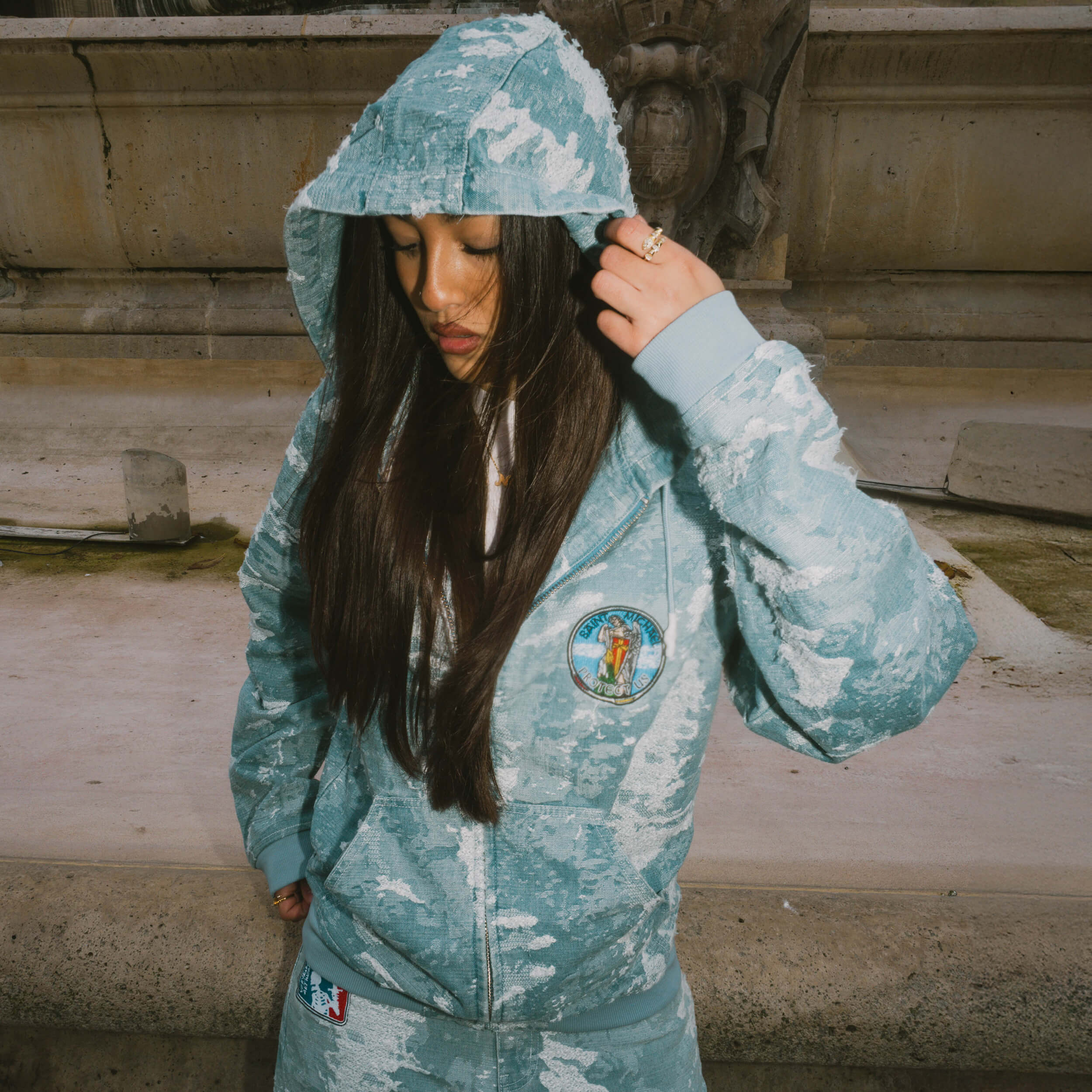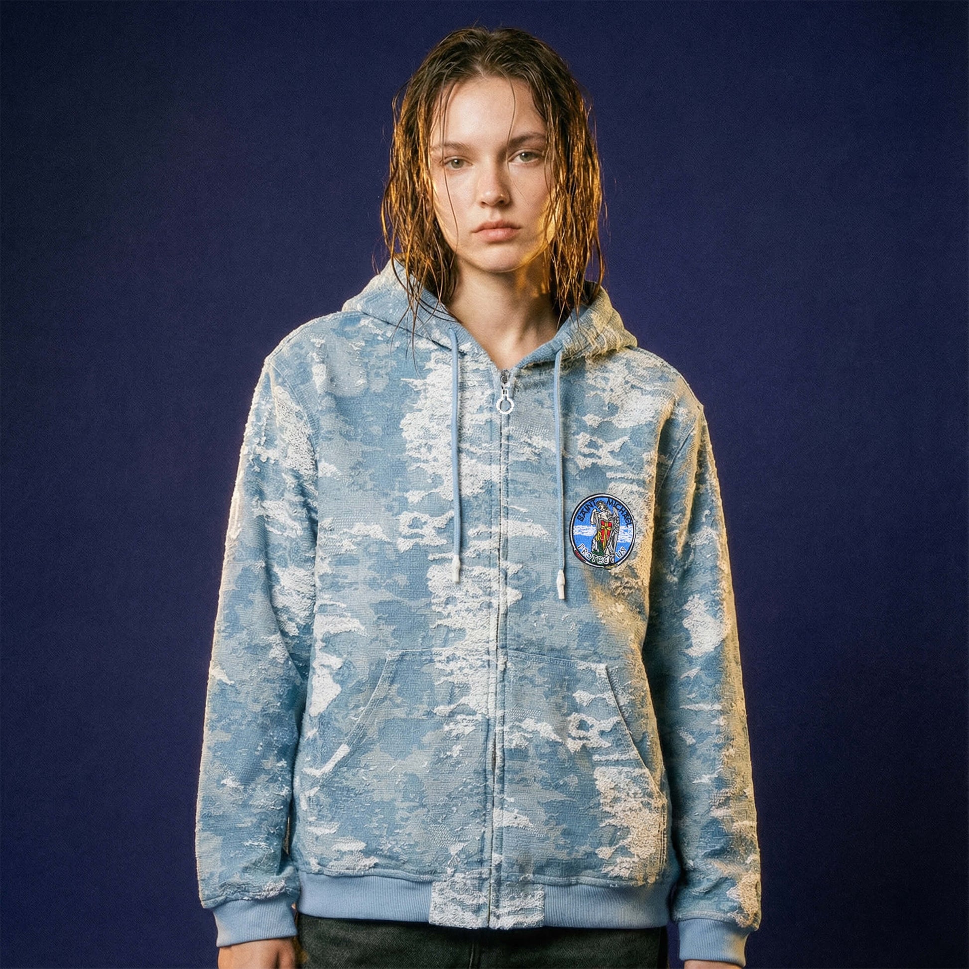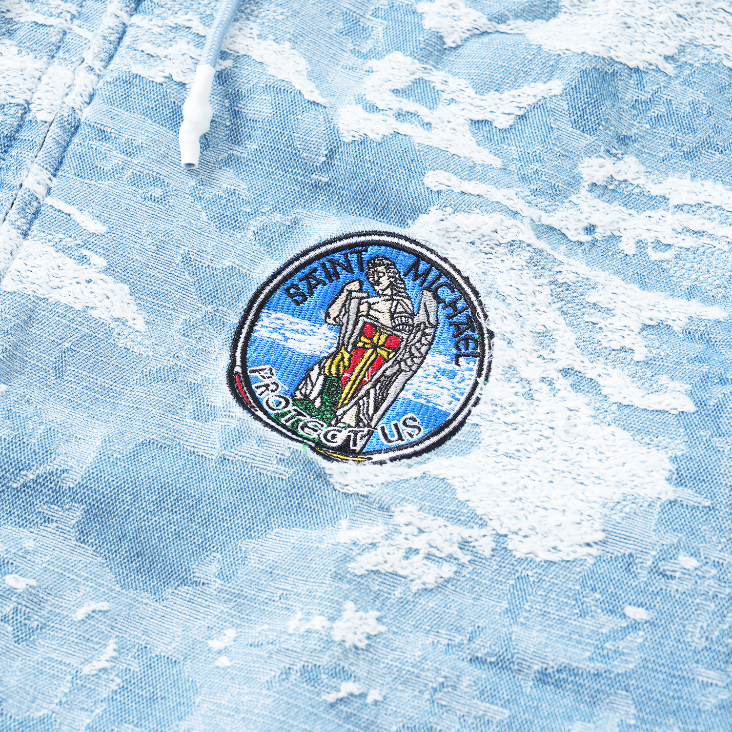 Designed by Raf Reyes: baptized in blue — and built like armor — this Saint Michael hoodie wraps you in prayer and battle *at once* ⚔️ the jacquard-woven sky camo clashes heaven & grit, while the embroidered arkangel shields the chest like a crest of divine protection 🙏📿--- "PROTECT US" isn’t just stitched — it’s spoken ⇄ a ᵥrelic from the streets to the sacred, for the modern crusader walking through fire and frost 🔥❄️:: forged by VERYRARE for the faithful ⚔️ amen.