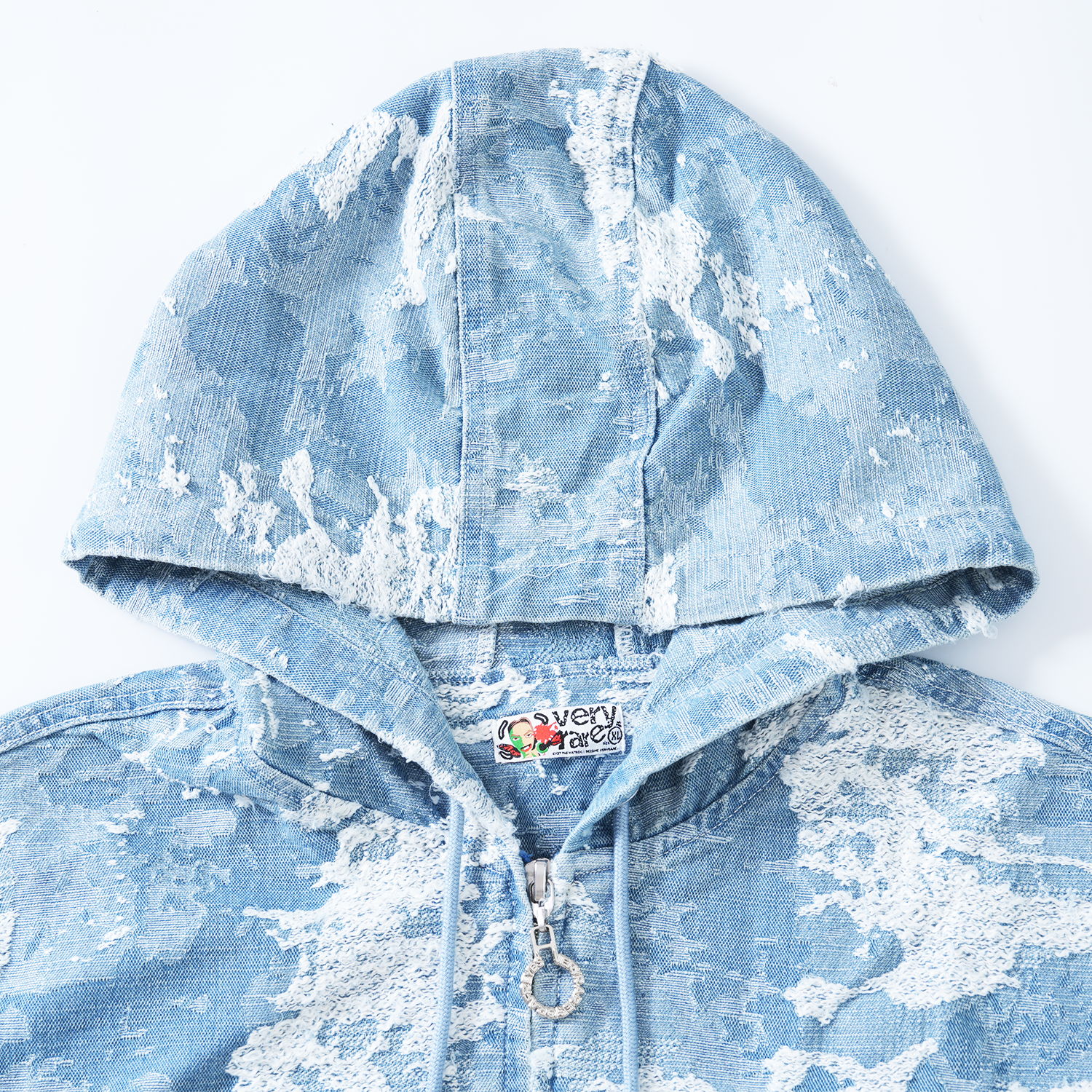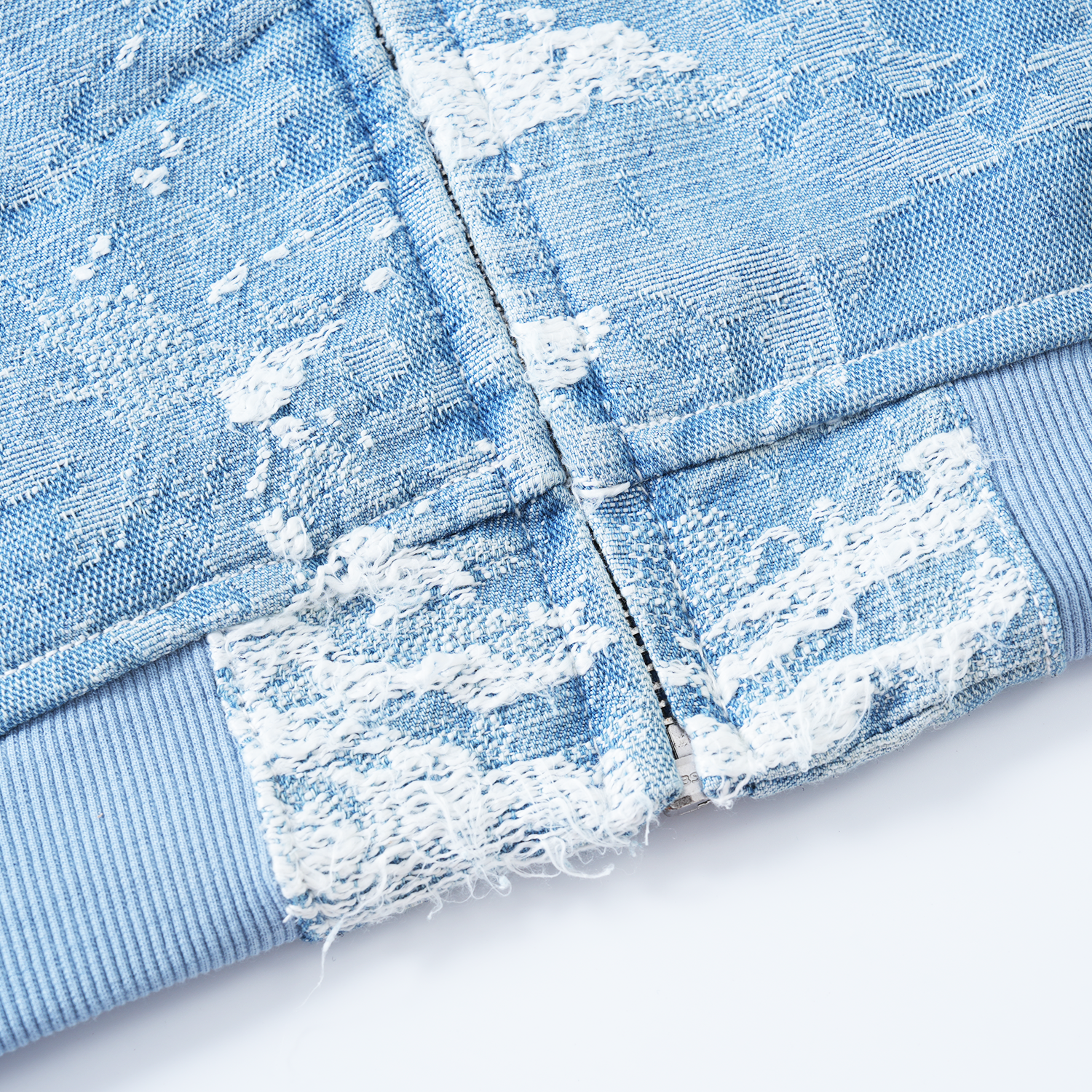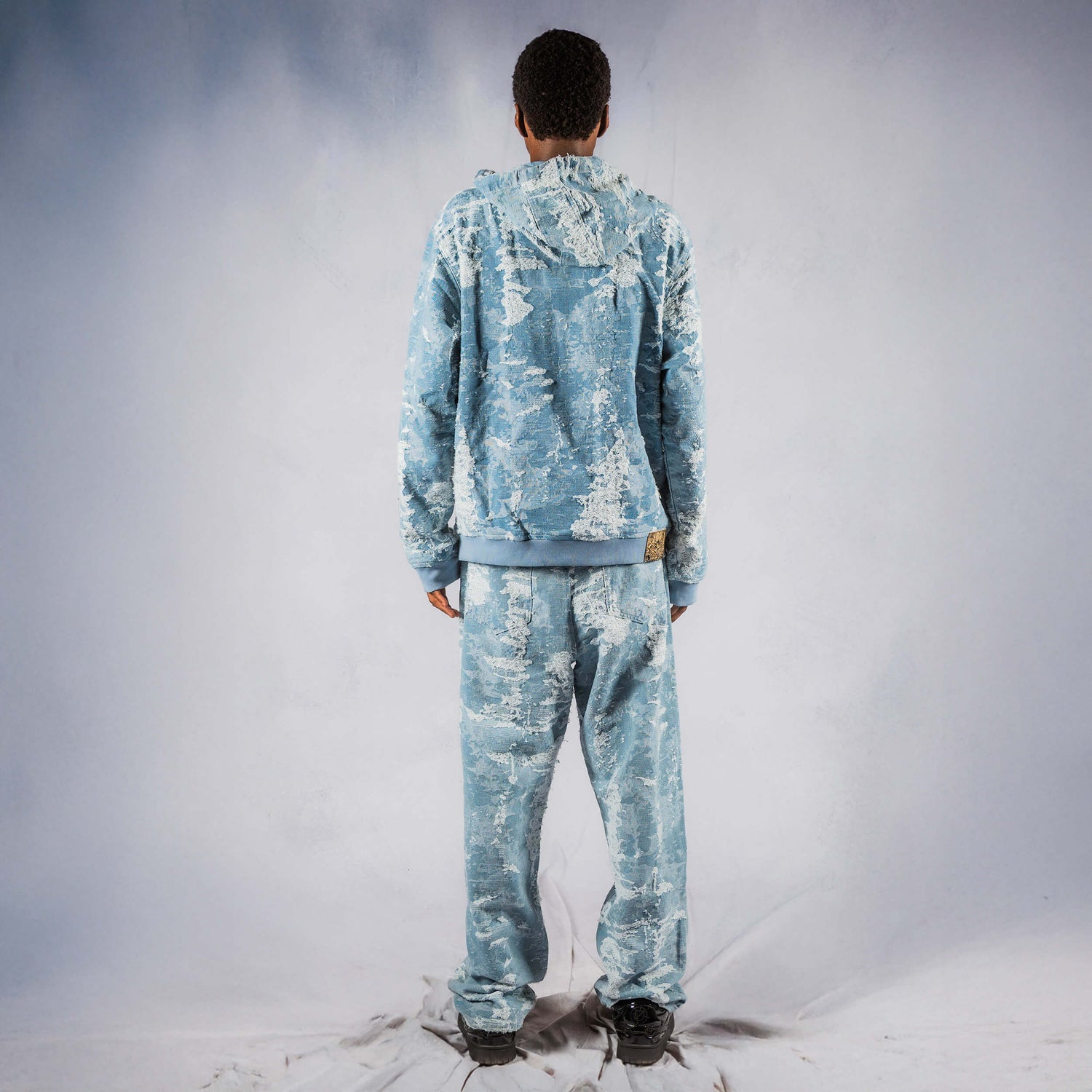 Tech specs: remarkable couture-inspired fil coupé jacquard denim hoodie (100% cotton | | | 475gsm/14oz) straight-cut/regular cut (slightly boxy w/ a relaxed fit) ~ VERYRARE "camo clouds" 3D motif all throughout incorporates a subtle texturing (& softness), while the fabric has been worked & dyed to give it the perfect 🔵 tint 🪡 [...] tonal ribbings, custom-molded gunmetal branded buttons, embroidery @ front, real leather jacron @ back ~ this piece can be worn with matching hoodie/trucker jacket for a total look 👖.