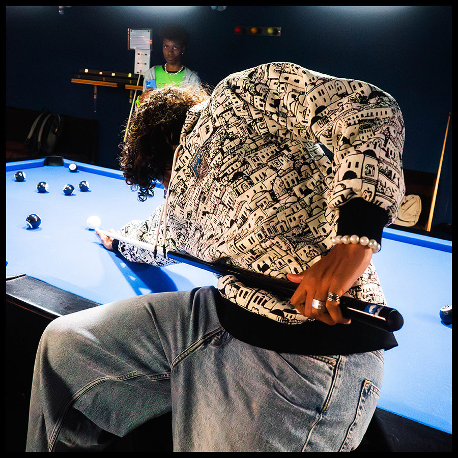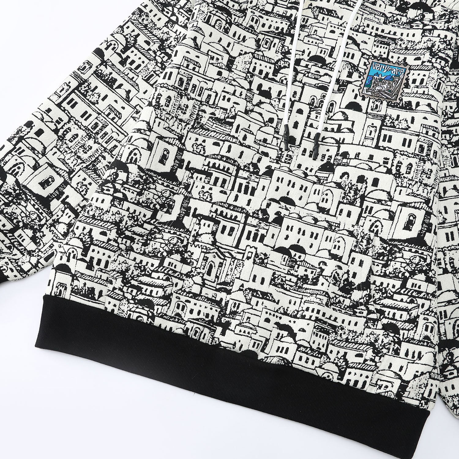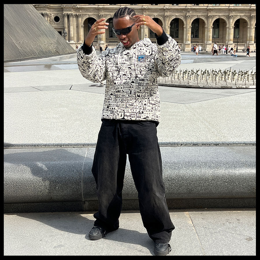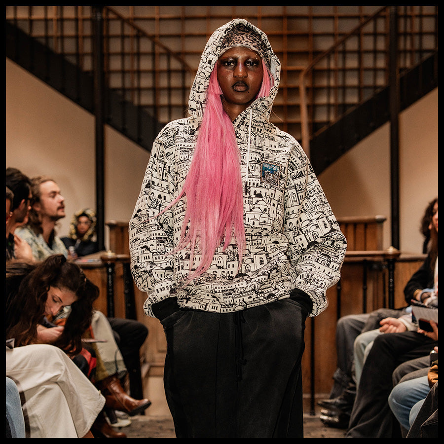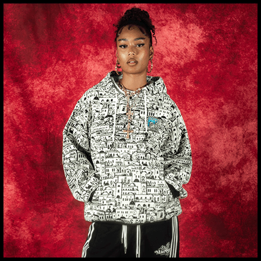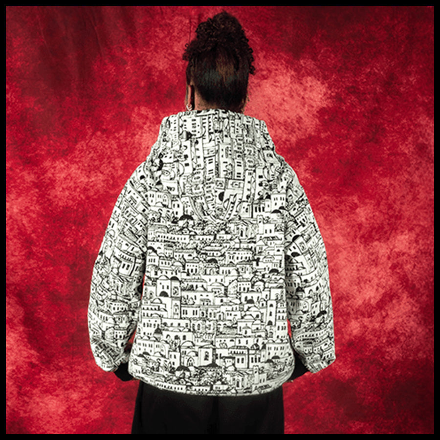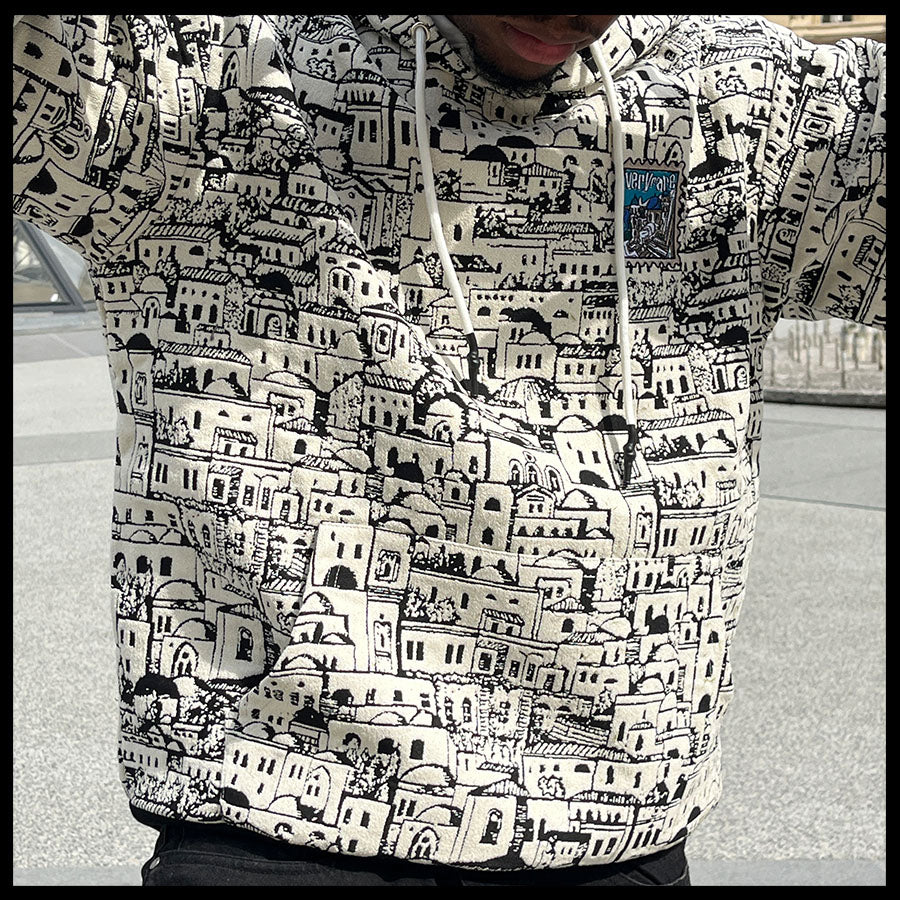 Designed by Raf Reyes: a labyrinth of whitewashed ᵥrooftops & stacked windows unfolds across this hoodie like a sun-bleach'd dream of Santorini — ᵥreborn in ink [...] built like a maze, each blocky home/narrow alley loops into the next, turning your torso into a living cityscape 🏛️🌀~ ancient and modern, sacred yet gritty, dis VERYRARE baby!!!
