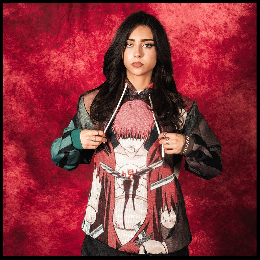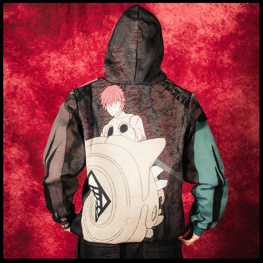 Designed by Raf Reyes: Sasori of the ᵥRed Sand — puppetmaster prodigy, caught between memory and weaponry [...] the design @ front captures his final moment, pierced by his past: his very own mother & father innit :: not weakness — acceptance | | | at back, his true form maybe: a hollow shell of chakra and vengeance, torso cracked open like a ᵥrelic, emptied heart and lungs, the Iron sand emblem sealin' the deal.