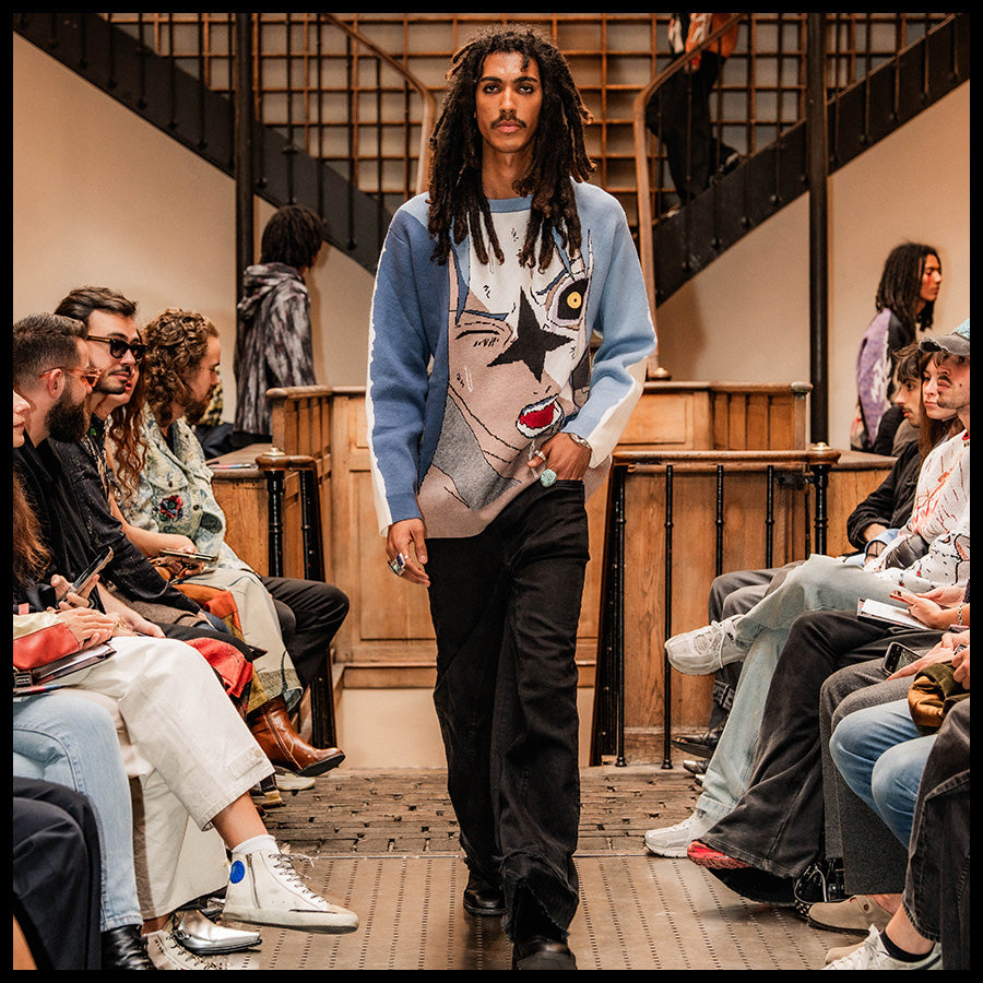 Tech specs: 14gg birdseye jacquard knit (composition: 50% viscose, 30% polyester, 20% nylon), embroidery.
