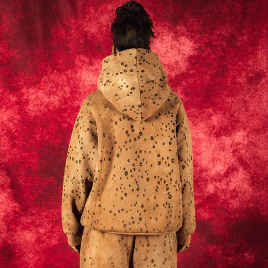 Designed by Raf Reyes: sun-scorched and soul-dried [...] these french terry hoodie look like they’ve been dragged through a desert battlefield & left under a dying sky 🏜️~ the base is sun-fade ochra-colored, freckled with ᵥraw burn-holes and necro-dots like blood spray on parched sand ‼️☠️🔥— VERYRARE for the damned & tha dustbound 😤.