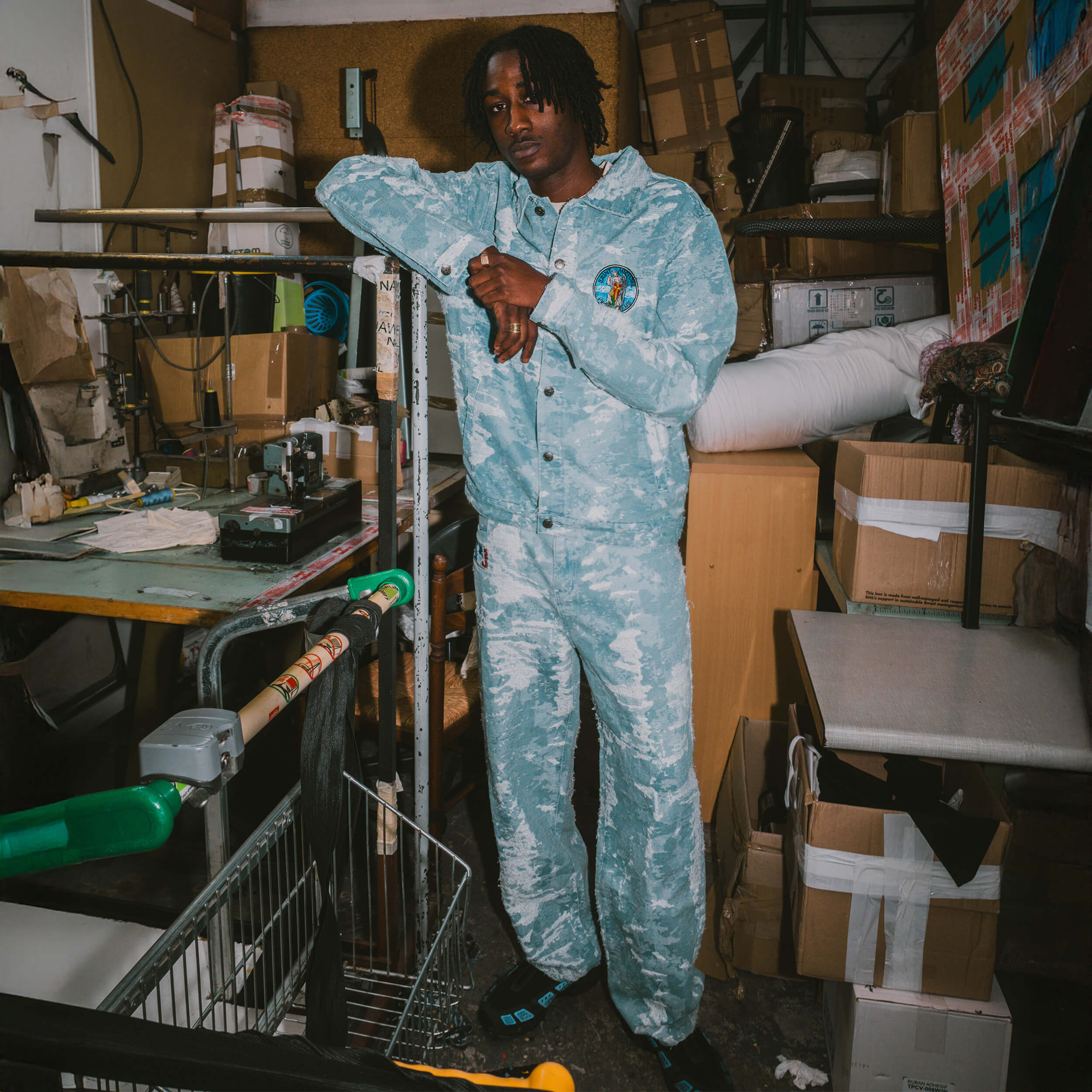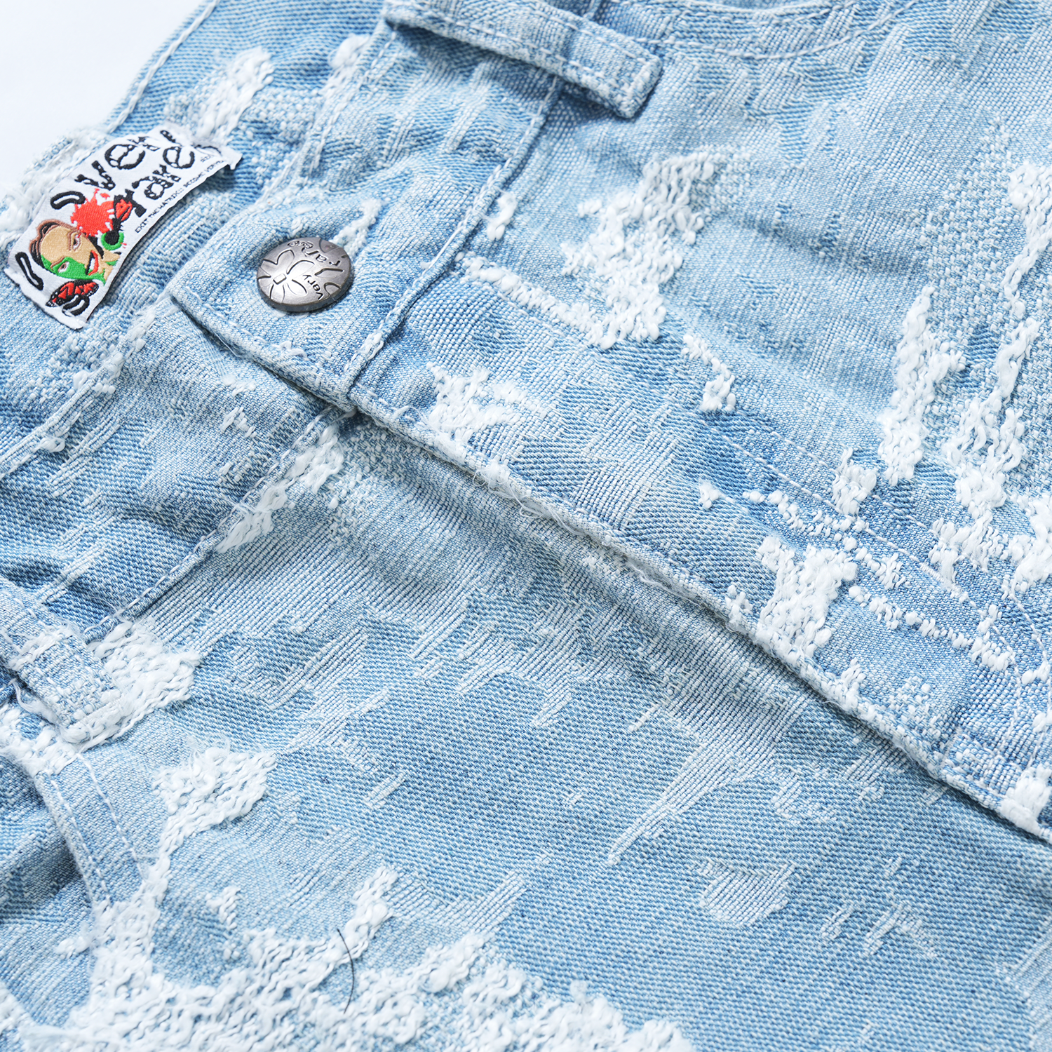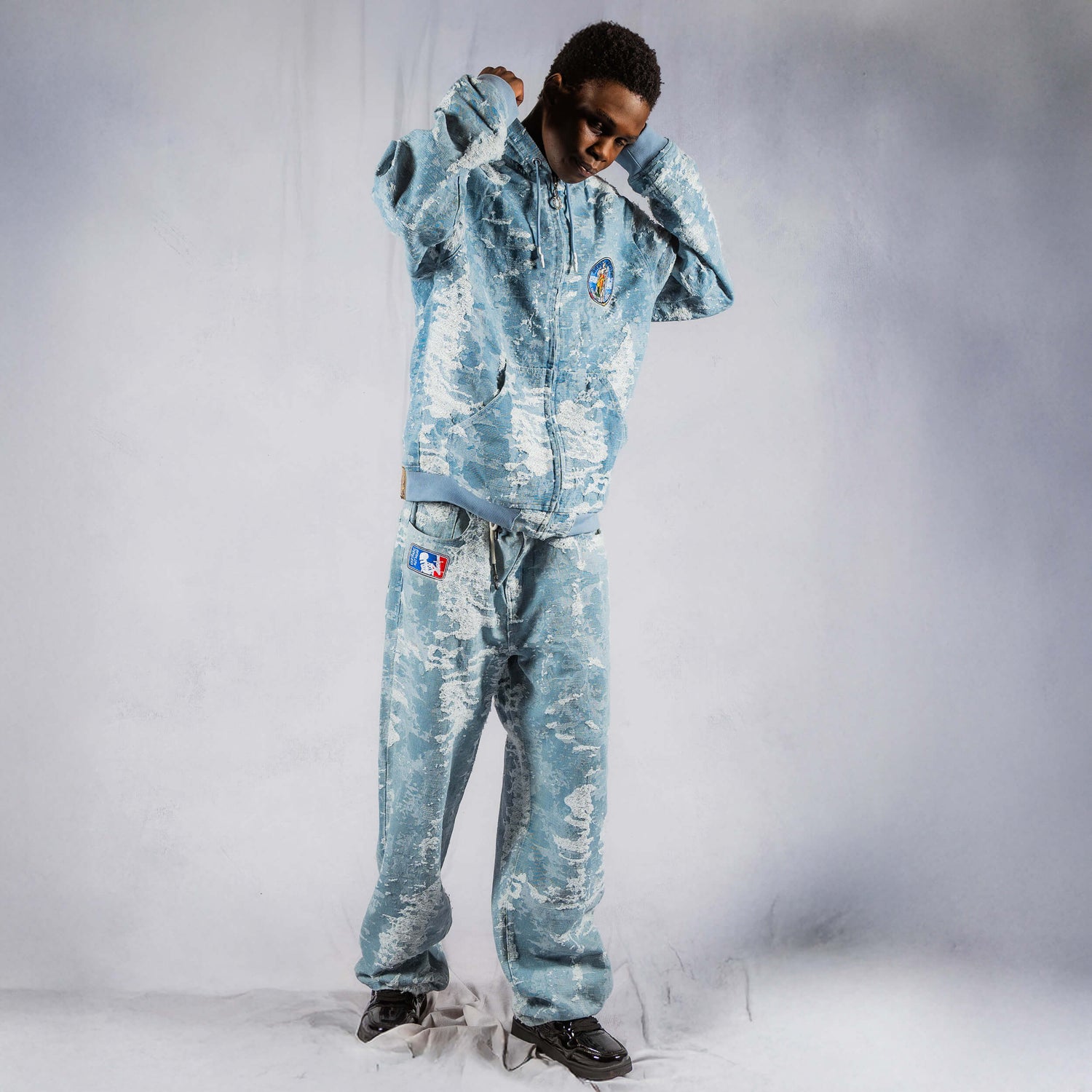 Tech specs: remarkable couture-inspired fil coupé jacquard denim straight-cut/regular cut pants with a slightly baggy fit (100% cotton | | | 475gsm/14oz) ~ VERYRARE "camo clouds" 3D motif all throughout incorporates a subtle texturing (& softness), while the fabric has been worked & dyed to give it the perfect 🔵 tint 🪡 [...] custom-molded gunmetal branded buttons, embroidery @ front, real leather jacron @ back ~ this piece can be worn with matching hoodie/trucker jacket for a total look 👖.