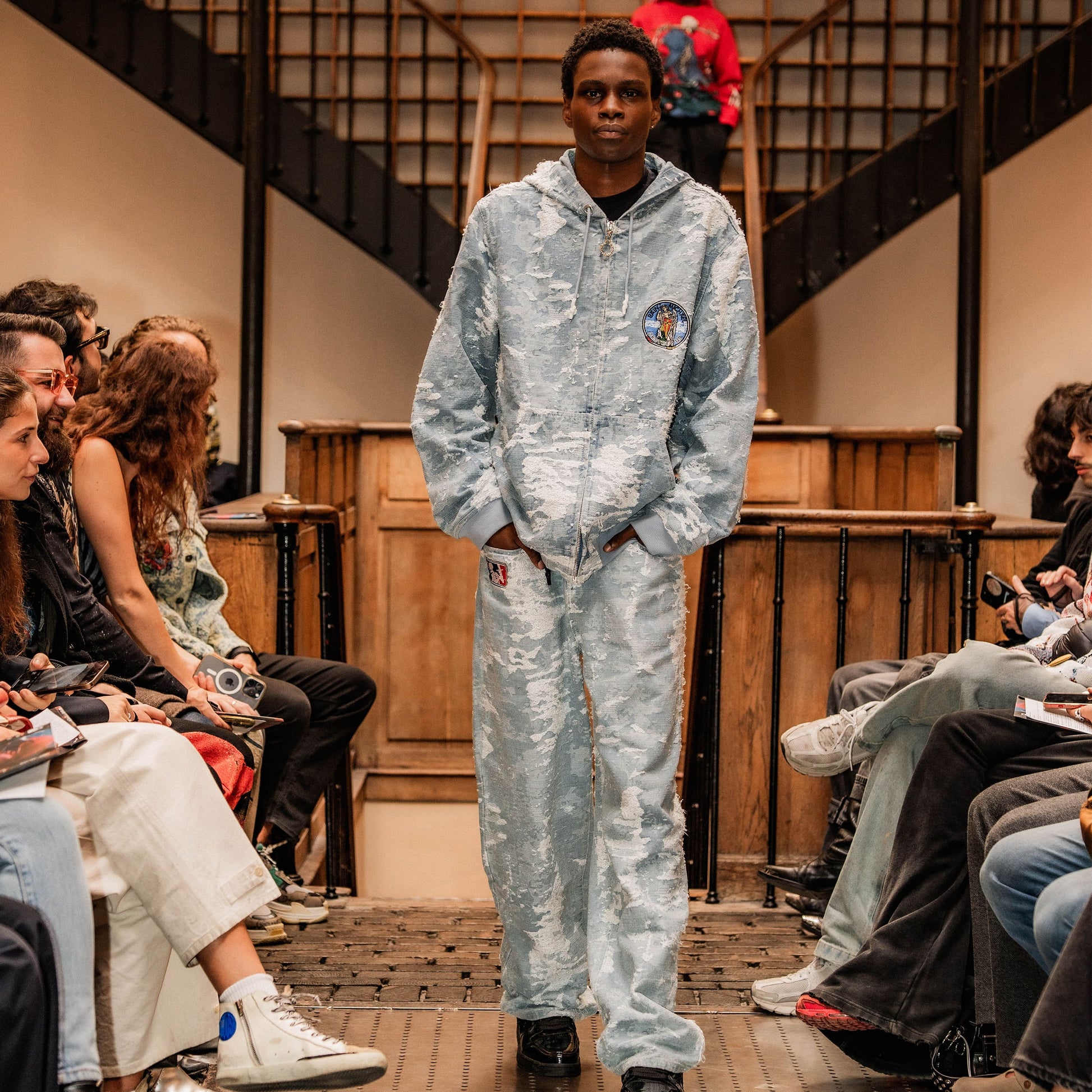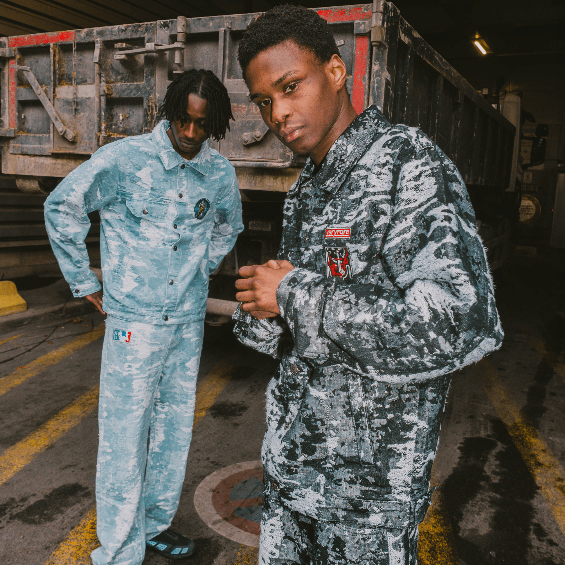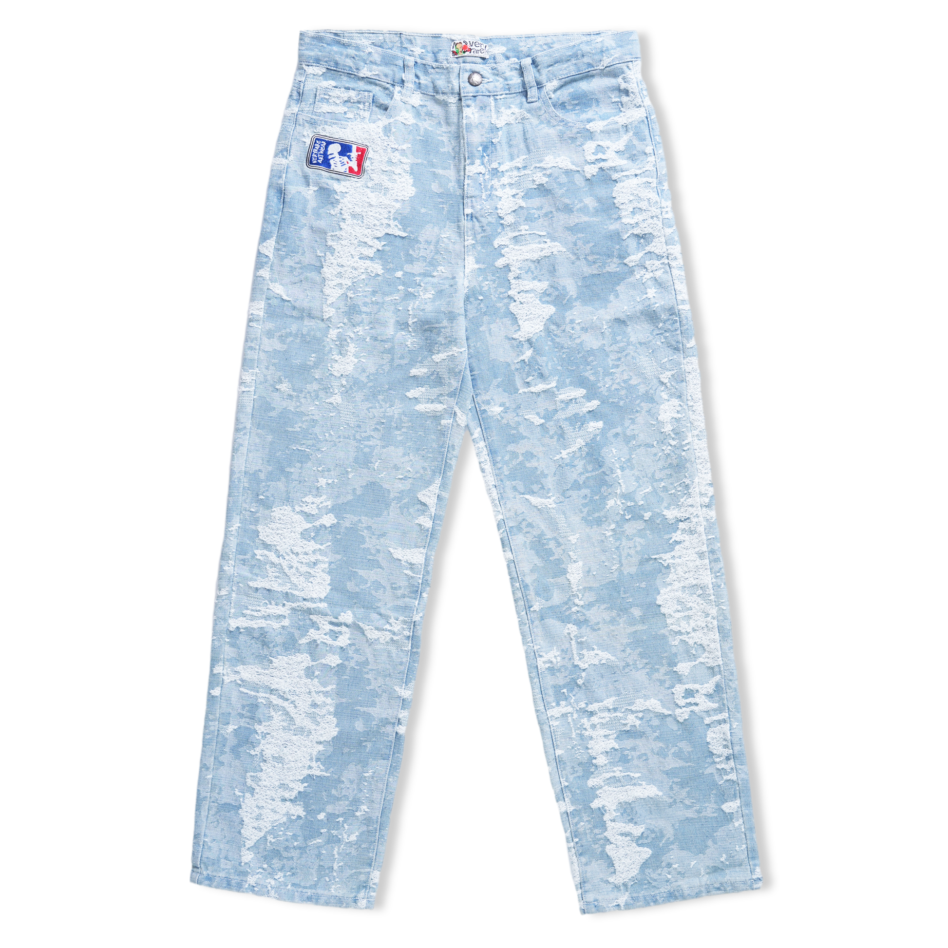Tech specs: remarkable couture-inspired fil coupé jacquard denim straight-cut/regular cut pants with a slightly baggy fit (100% cotton | | | 475gsm/14oz) ~ VERYRARE "camo clouds" 3D motif all throughout incorporates a subtle texturing (& softness), while the fabric has been worked & dyed to give it the perfect 🔵 tint 🪡 [...] custom-molded gunmetal branded buttons, embroidery @ front, real leather jacron @ back ~ this piece can be worn with matching hoodie/trucker jacket for a total look 👖.