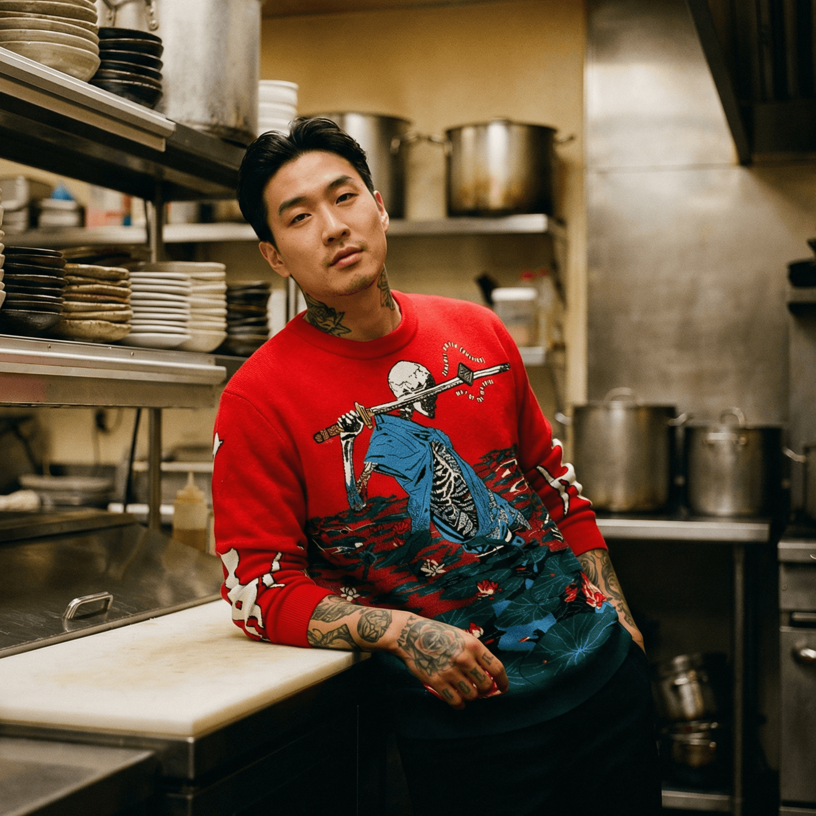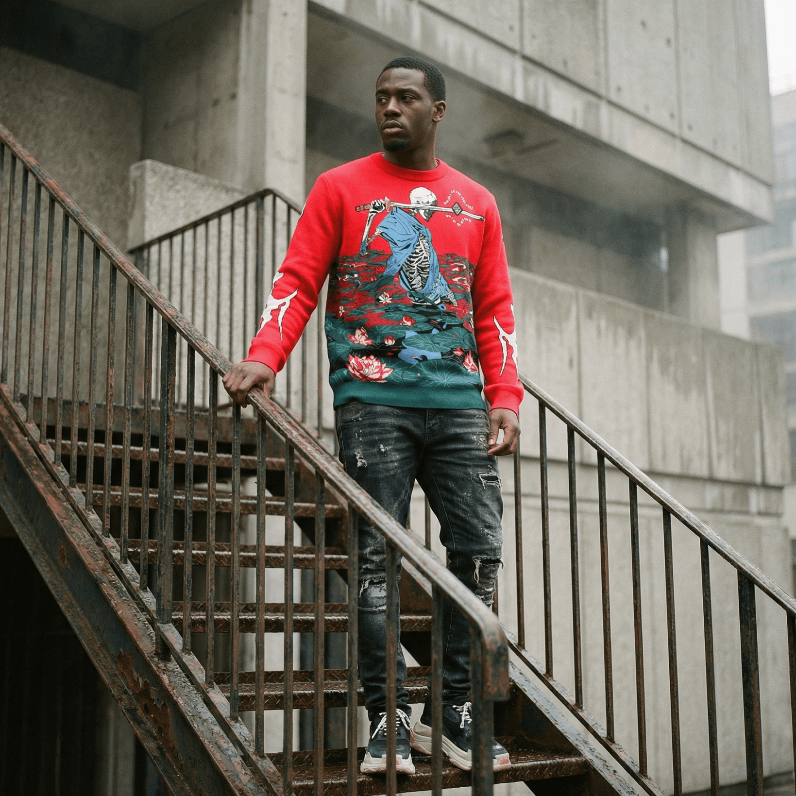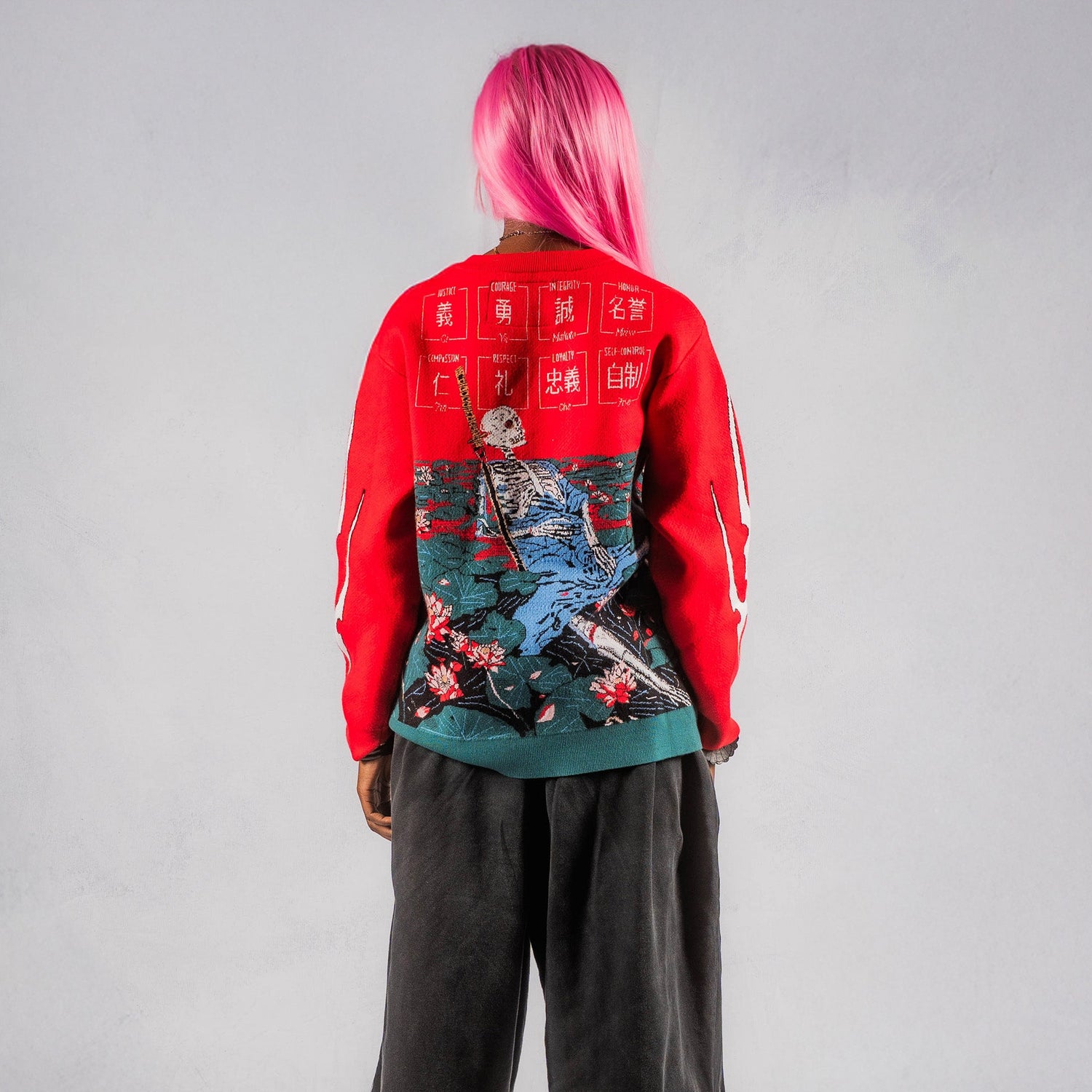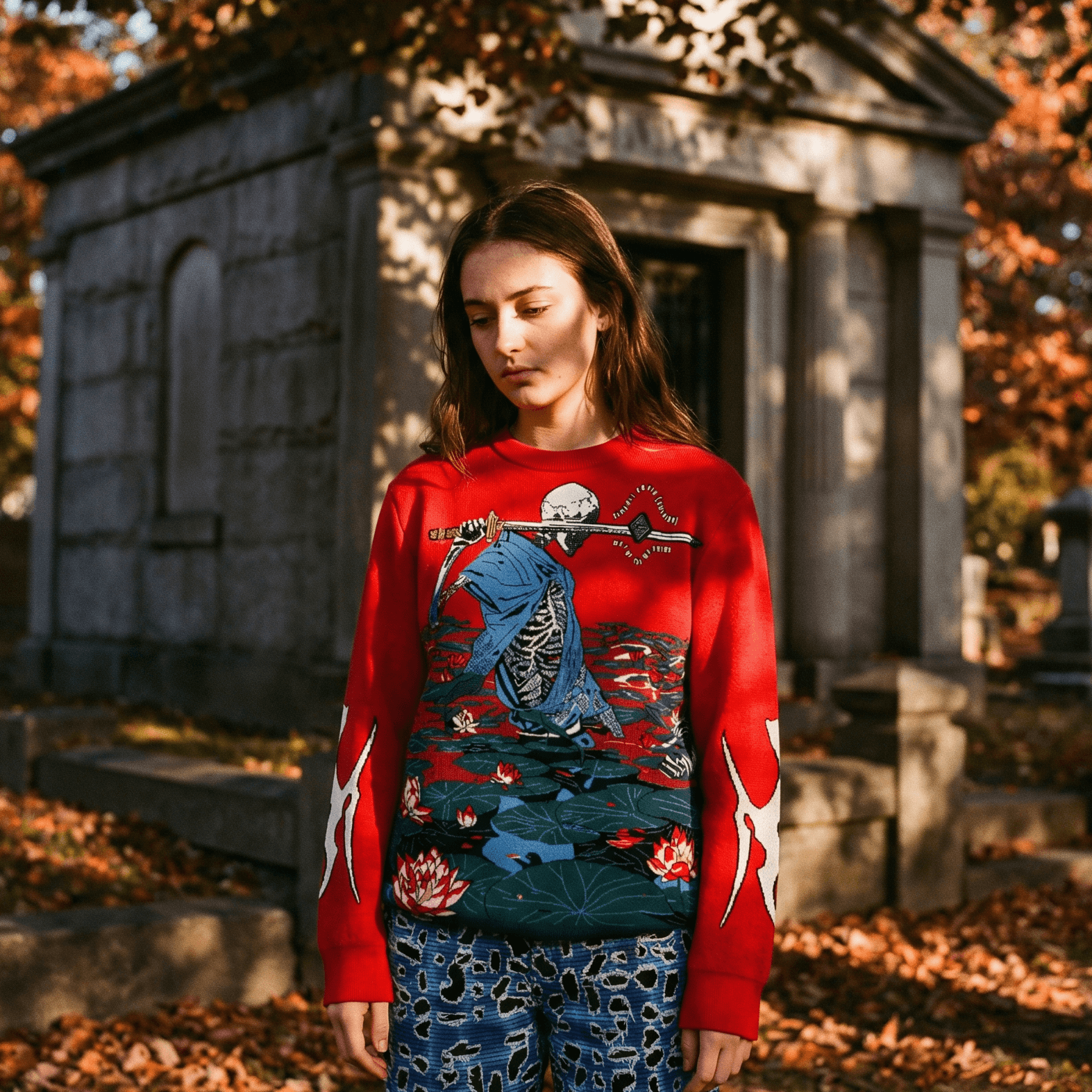 Designed by Raf Reyes: a skeletal warrior wanders the crimson swamp of the underwVRld, blade drawn, spirit unbroken 💀☠️ surrounded by lotus — symbols of purity born from mud — he fights long after death, tethered by honor 🥷 @ back: his final ᵥrest, sword grounded beside him, virtues engraved in fiber/fabric — justice, courage, integrity, honor, compassion, ᵥrespect, loyalty, self-control ⇄ this is no myth, it's tha code etched into bone i.e tha bushidō ᵥrequiem baby!!! ⚔️~ VERYRARE immortalizes the vow: to die standing for something ⇄ never kneeling for anything 🙏📿.