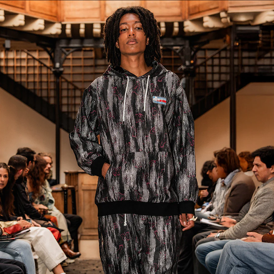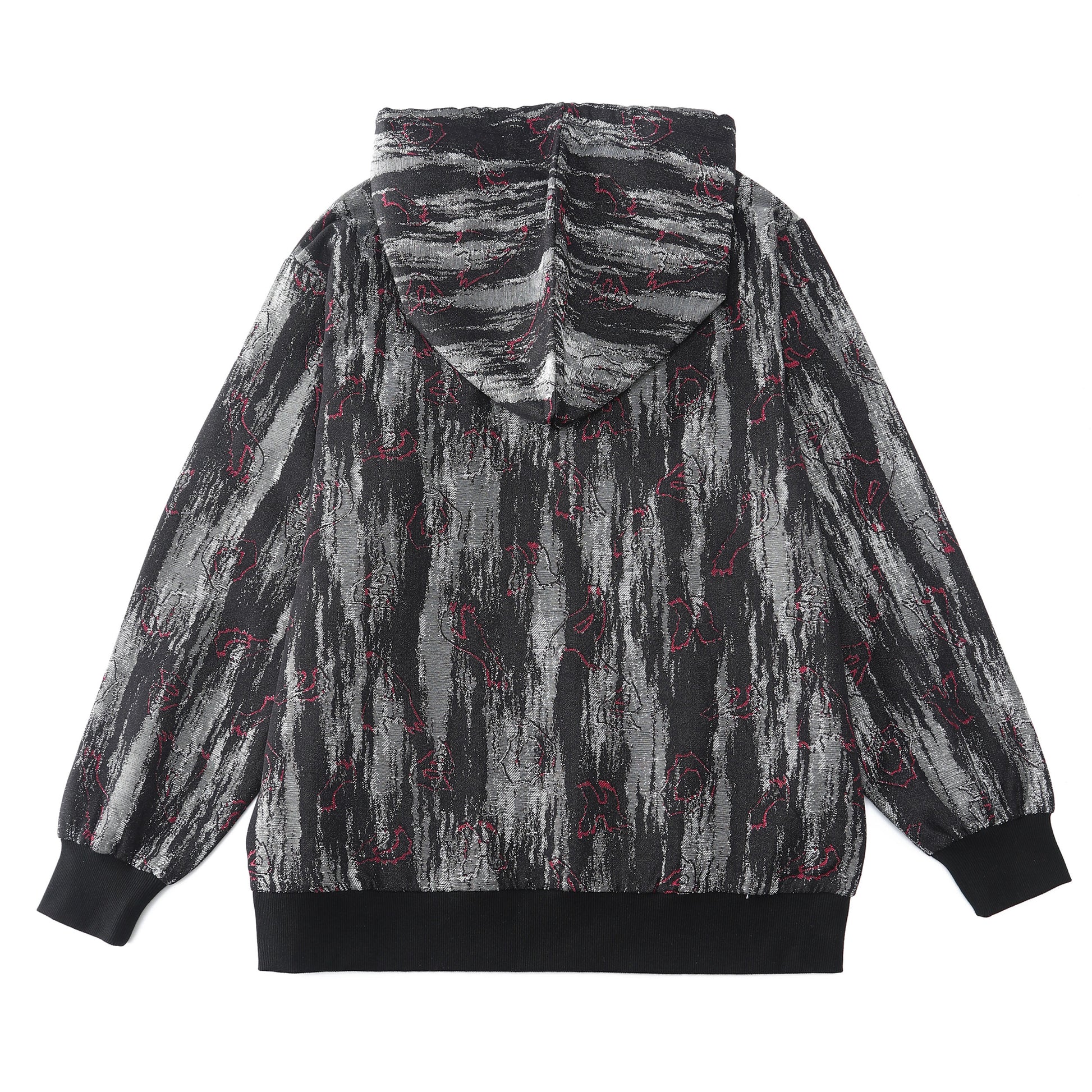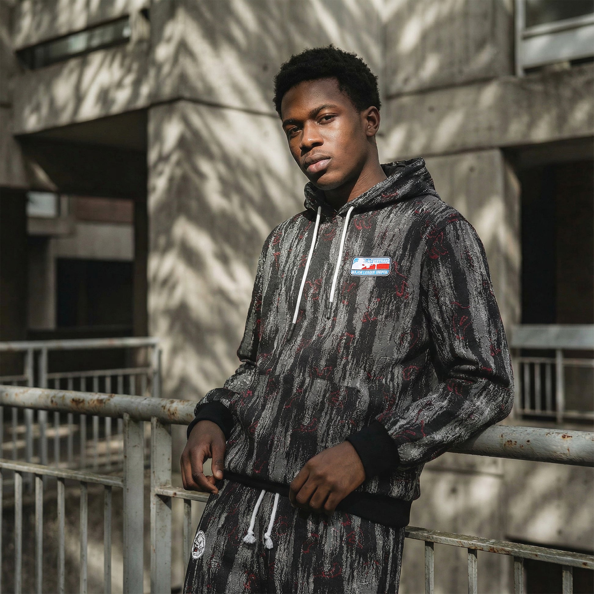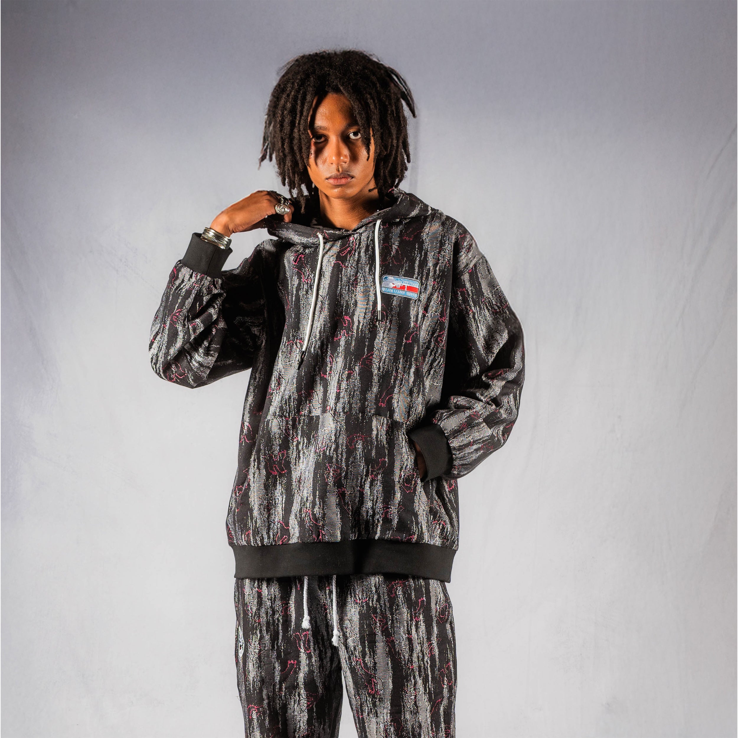 Designed by Raf Reyes: this hoodie hits like a shadow — dark camo dripped in bark texture & stitched chaos 🖤~ the pattern slashes vertically like claw marks across concrete, blending treebark grit with the ᵥraw unpredictability of butterfly wings ⇄ visible in blood-red thread 🩸:: issa uniform for tha urban ghosts *innit* ⇄ those who move through cracked alleys & static silence 🕷️--- the jacquard weaves tension into every fiber [...] a stitched VERYRARE embro up top seals tha identity: sniper, survivor, operator, outsider ⇄ COMMAND & CONQUER BABY🥷!!!