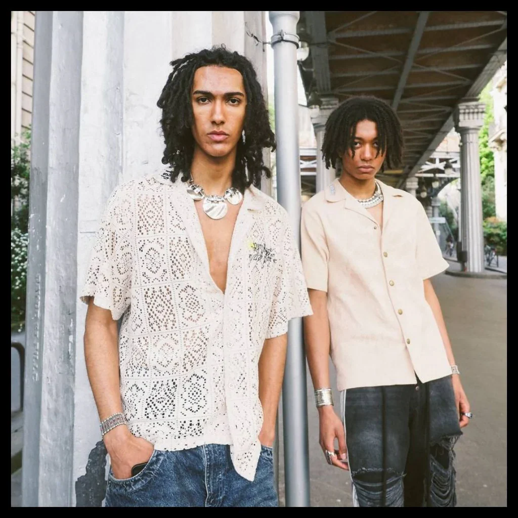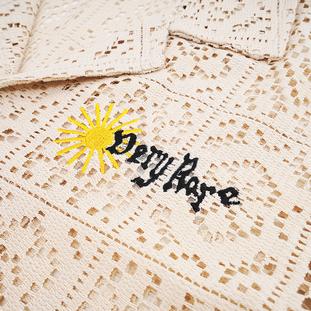 Tech specs: 100% cotton (260gsm) hand-dyed ""sand"" essence head-turning bohemian charm boho-chic crochet boxy shirt, embroidery, metalware & intricate floral + tribal designs (all-throughout) (w/ alluring hollow-out details) [creating a perfect balance of elegance and edginess].