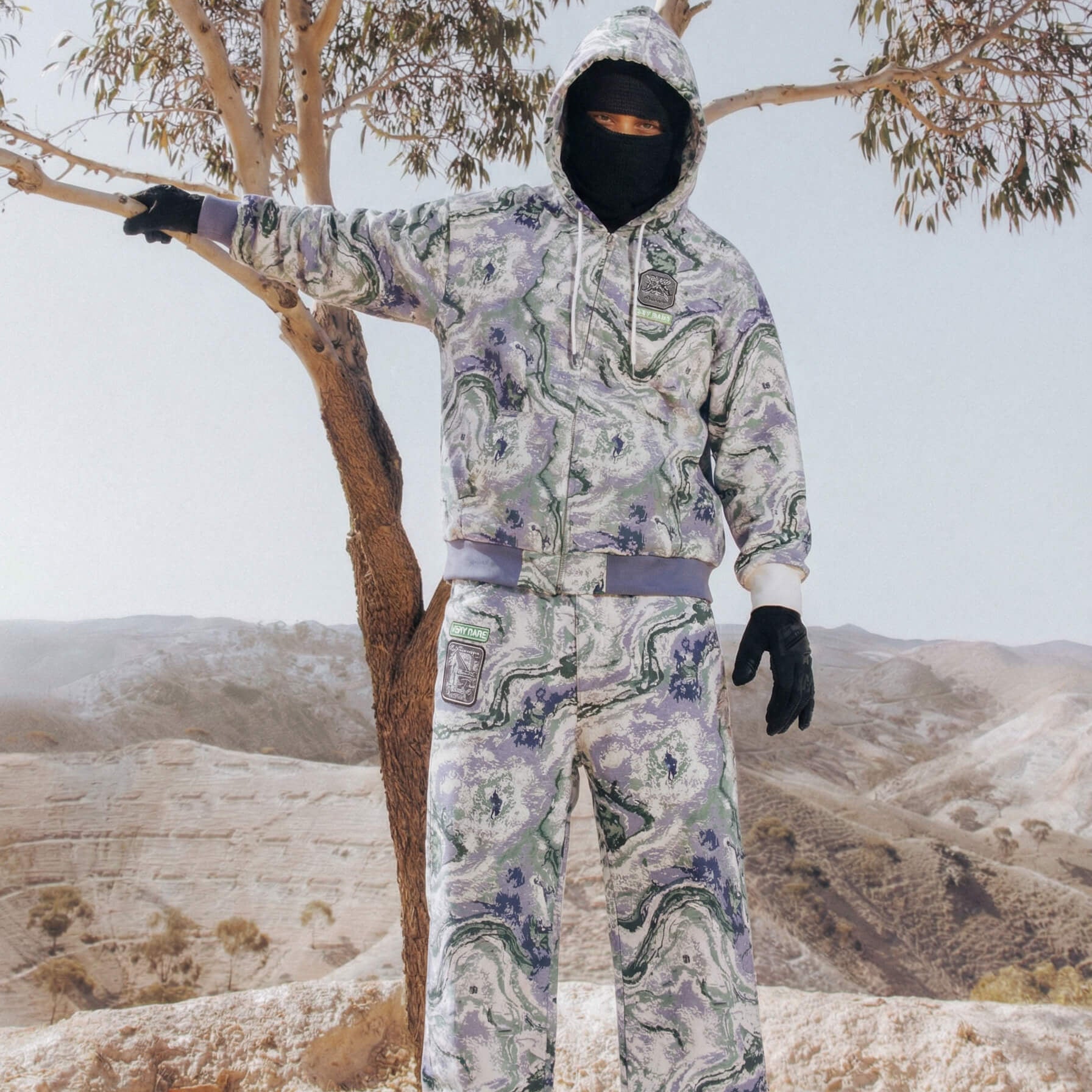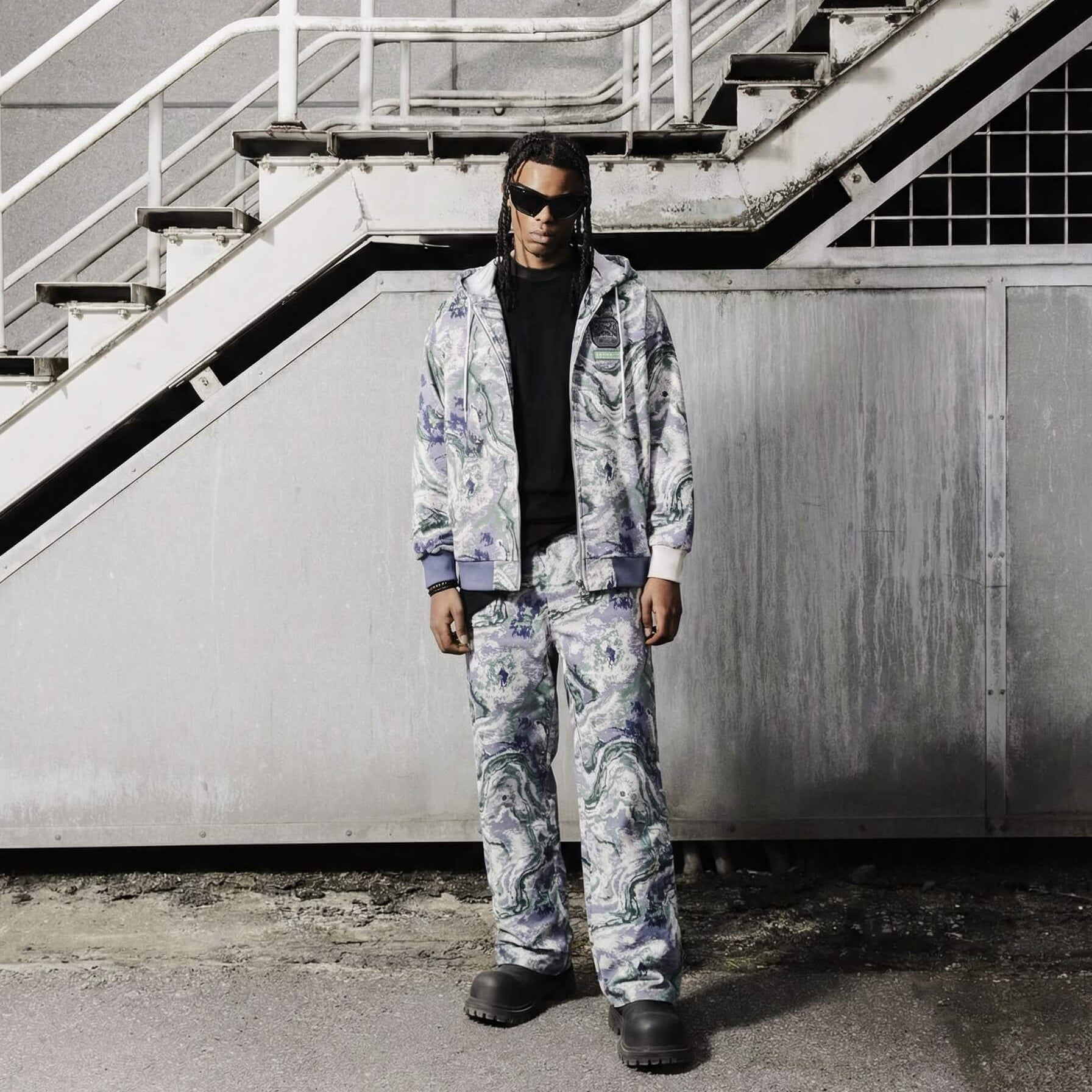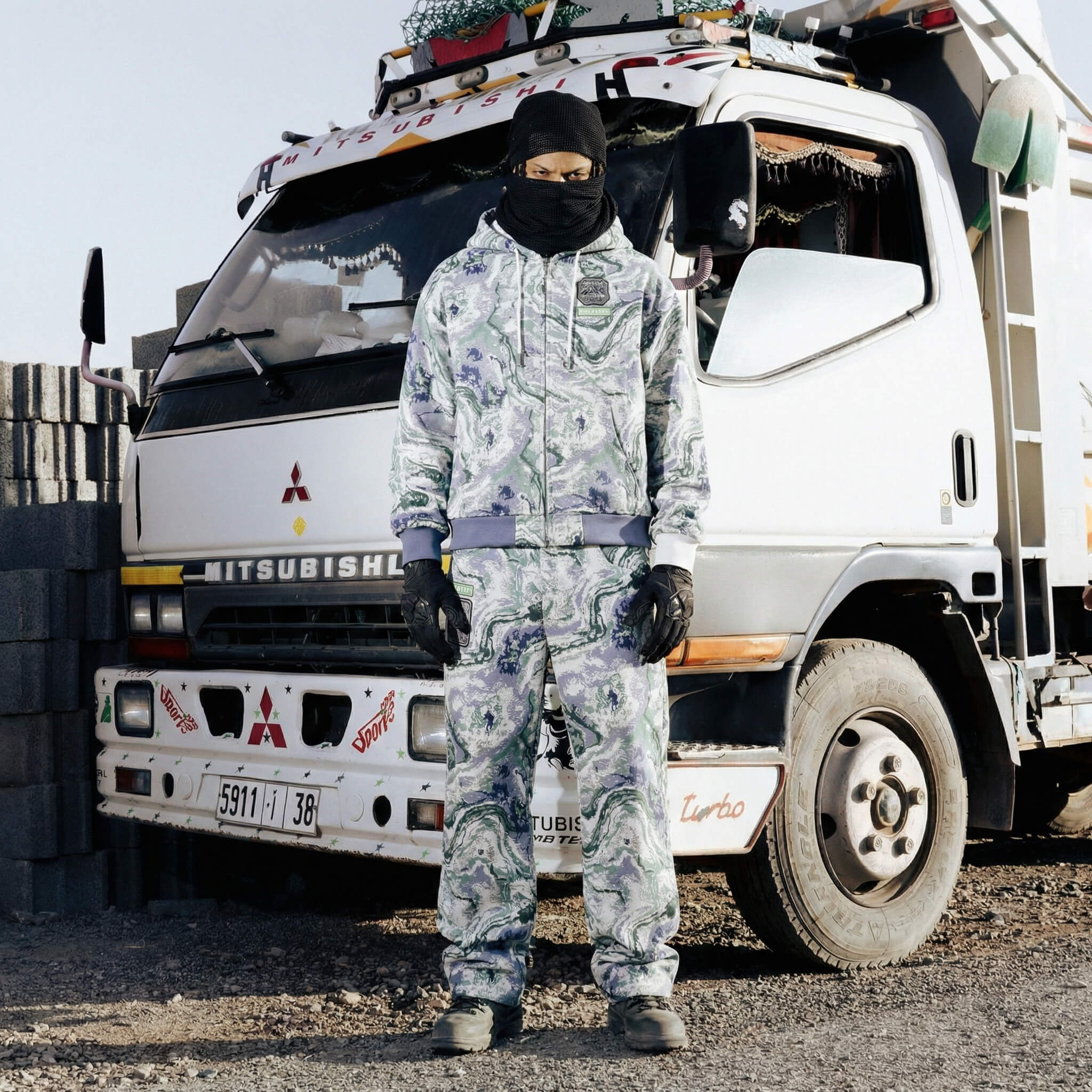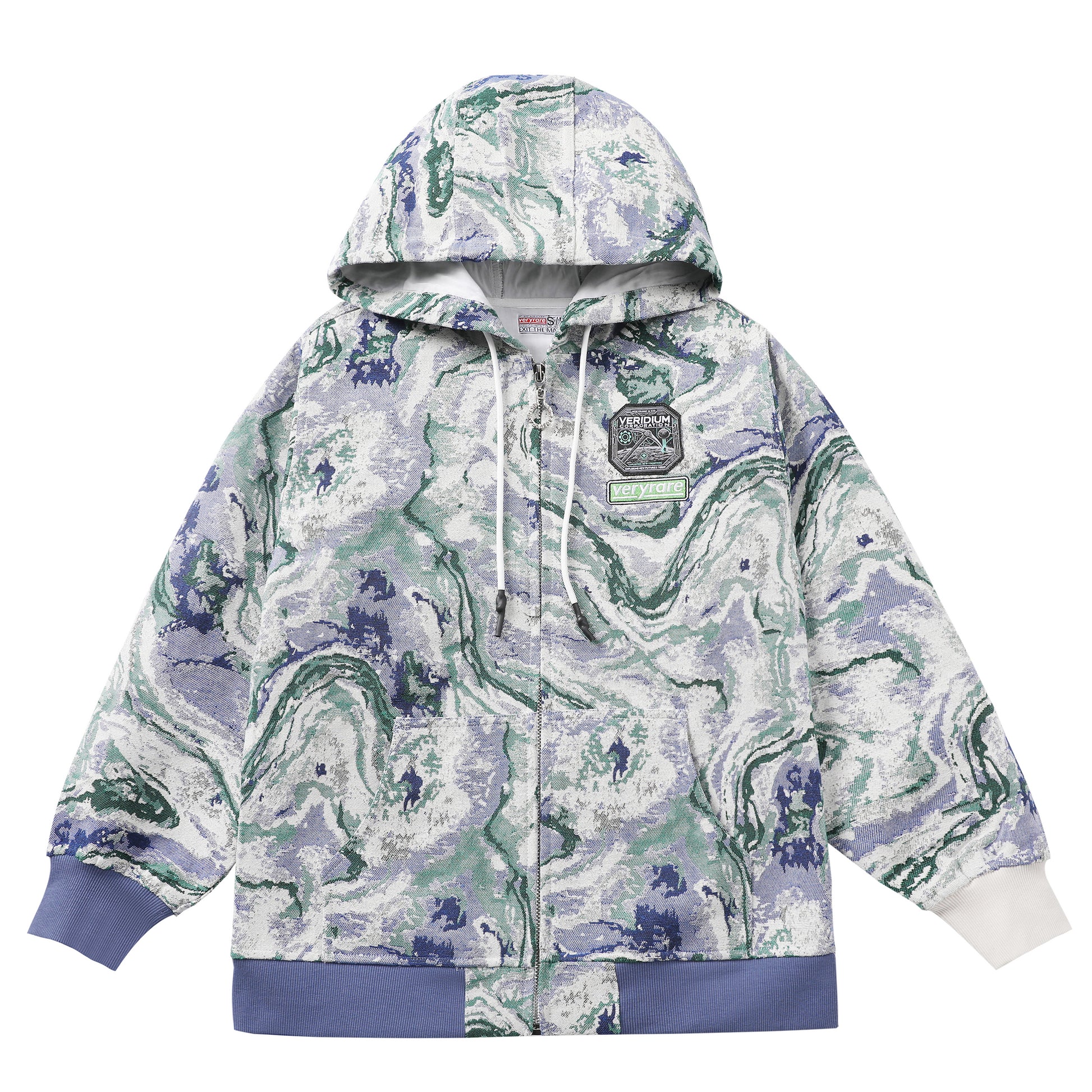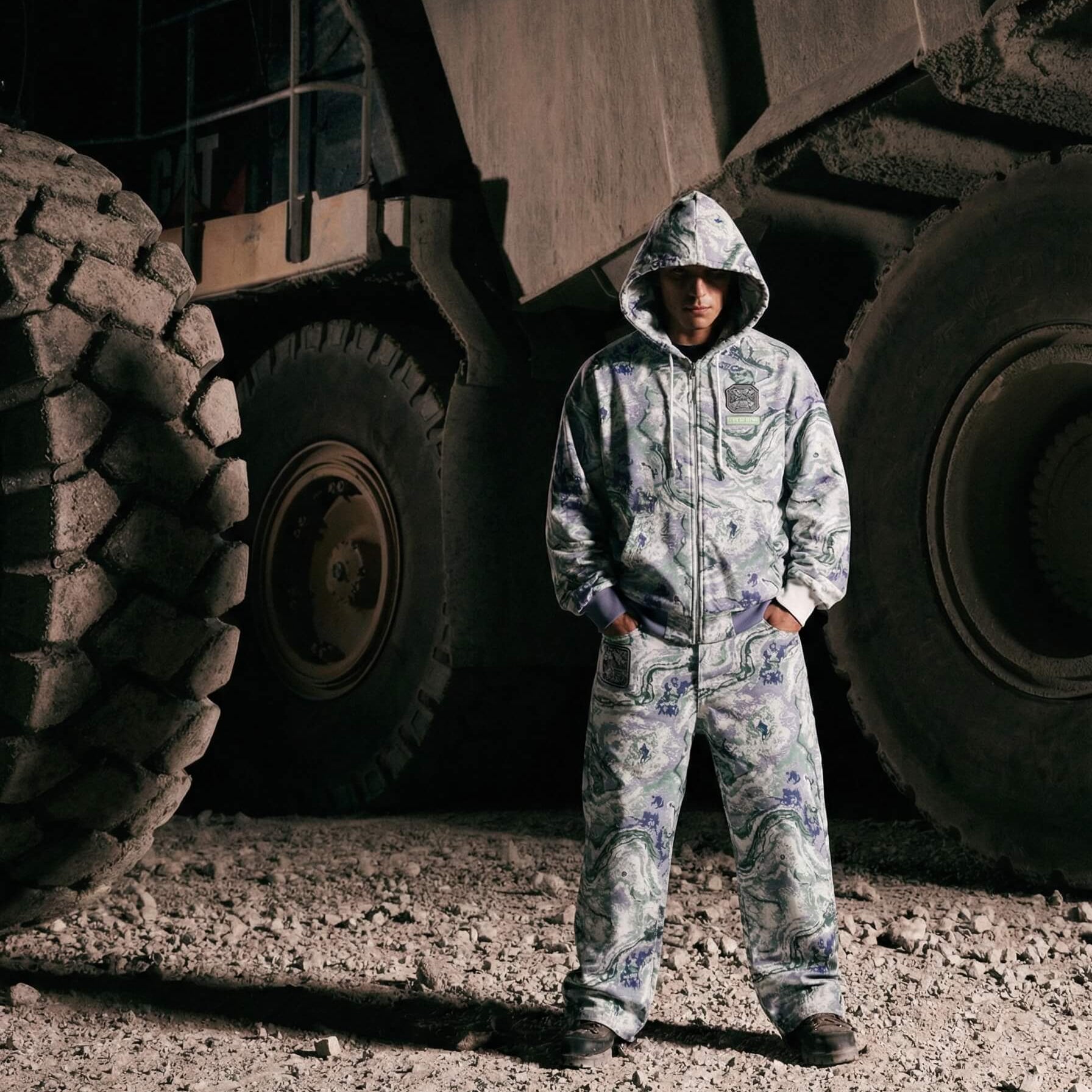 Designed by Raf Reyes: the VeRidium Corporation sells ᵥrare coordinates to uncharted frontiers/lands in the outer galaxies... 🪐 this water-swirled tapestry ᵥreads like satellite oceans after a system crash — cVRrents turned into code, coastlines erased, new maps written in static 📟| | | the chest patch is a mission badge i.e "exploring new futures today" said like a promise 🏗️ zip in, and you’re cleared for deployment ⇄ mythmaking, anthropocene & ᵥresource extraction +++ the quiet thrill of stepping past the last known border...