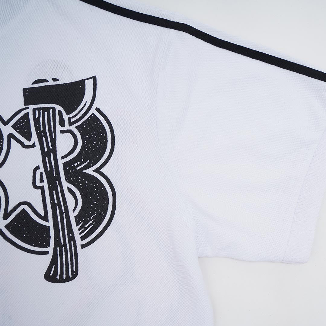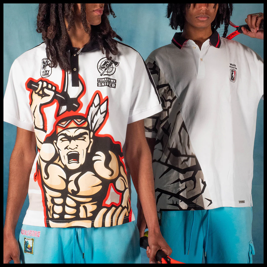 Tech specs: 290gsm cotton (100%) piqué jersey polo, relaxed/boxy fit, print, embroideries, enamel-coated buttons.