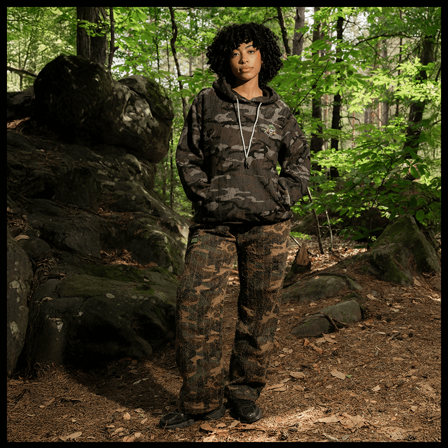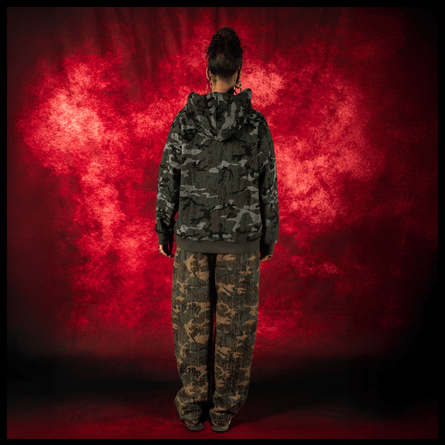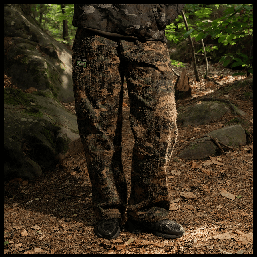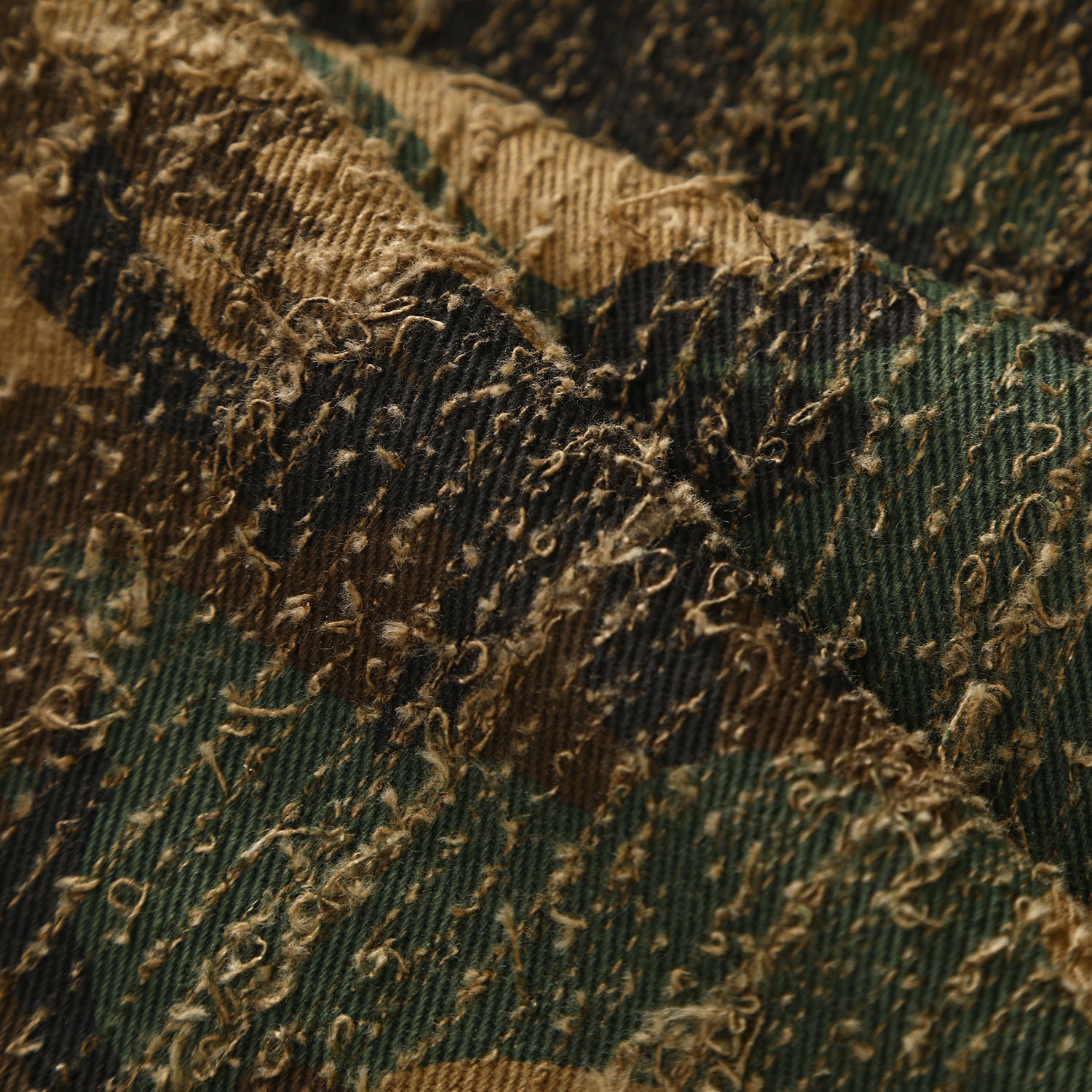 Designed by Raf Reyes: jungle-core with a vengeance 😤~ these pants rip through the foliage in camo frayed like they’ve seen combat | | | distressed to hell, the surface unravels into texture — wild, raw, alive [...] tha ninja's outti with the eyes locked in, no blinkin' — warrior energy only ⚔️--- you’re not hidin', u’re huntin' 🥷💢 ⇄ VERYRARE™ 🪖.