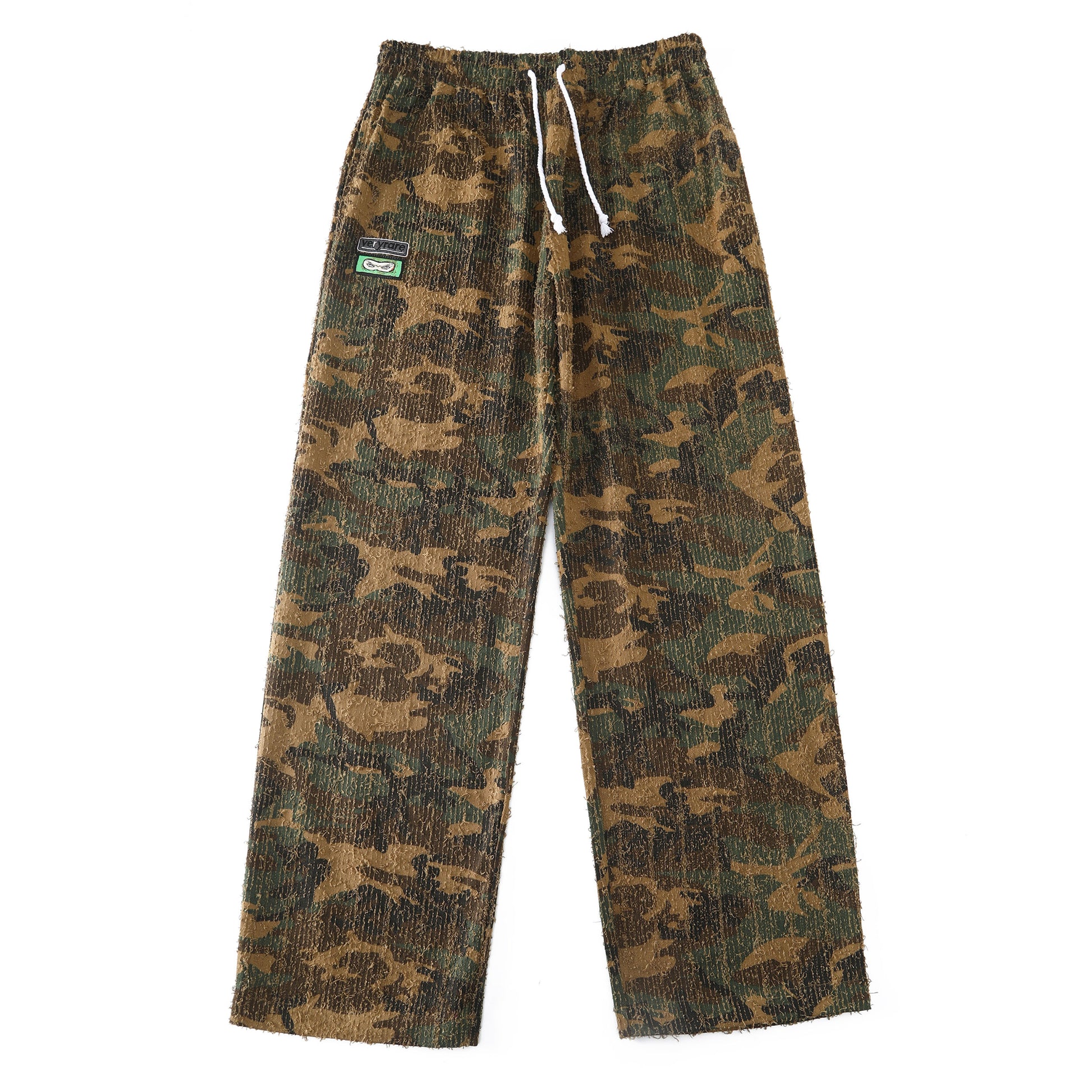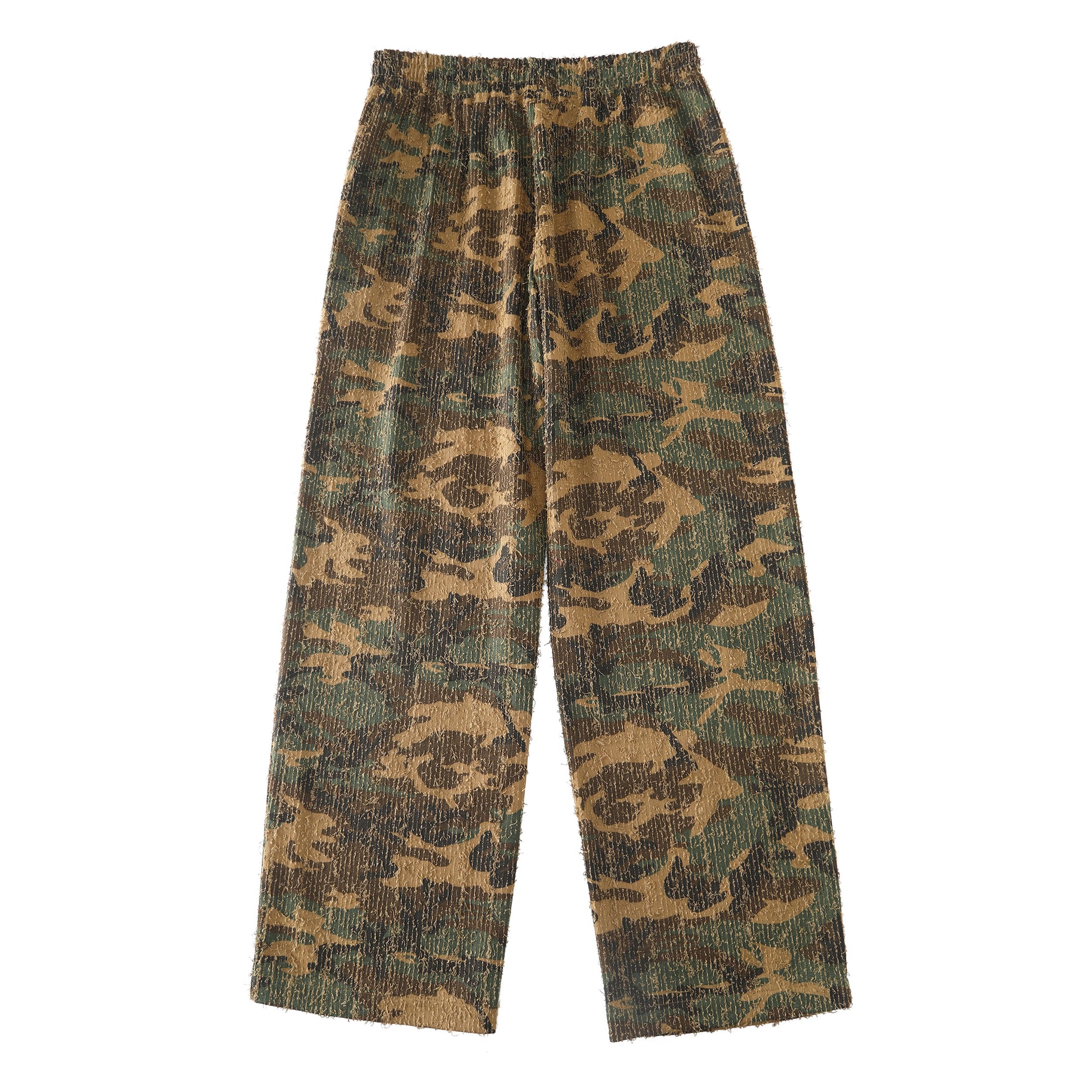 Tech specs: premium 100% cotton camo pants (380gsm) w/ laser-distress treatment ⇄ 'bouloché' vertical distressed line effect/texture all throughout | | | mini "samurai" 'rope' braided belt-system drawcord +++ lining’s composition: 100% cotton | | | embroidery + woven tag at front.