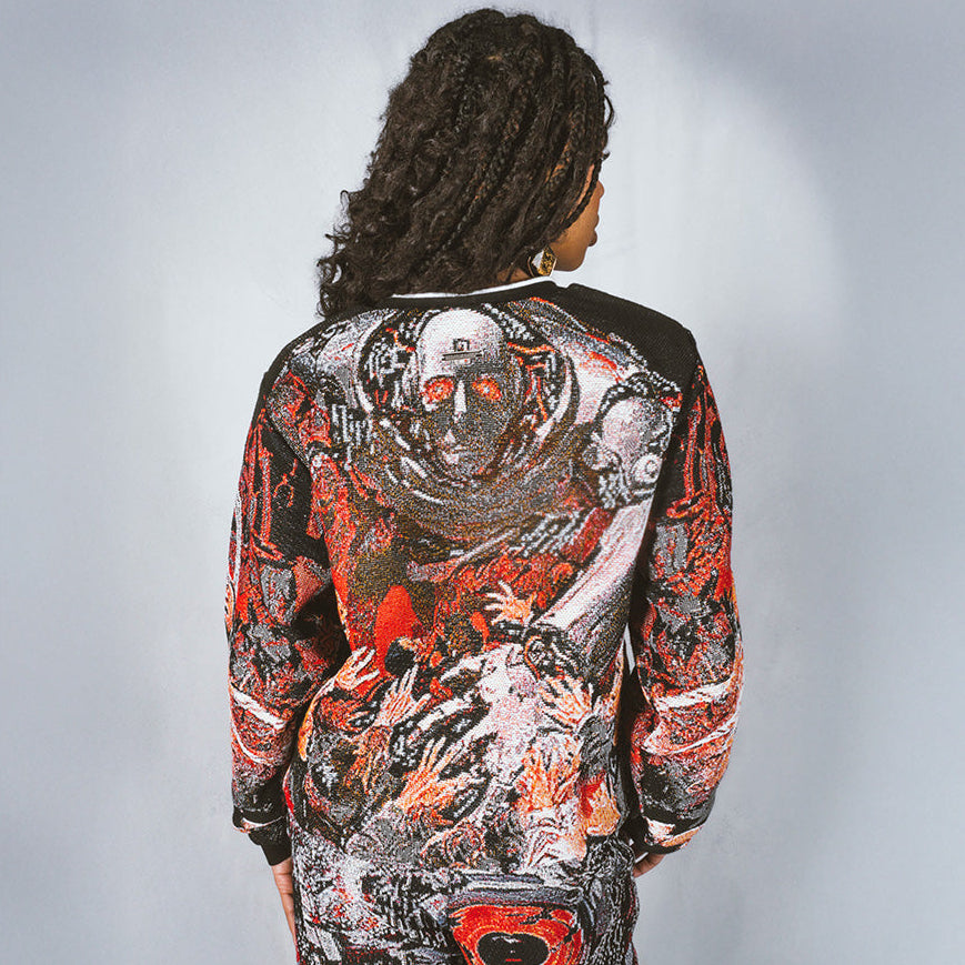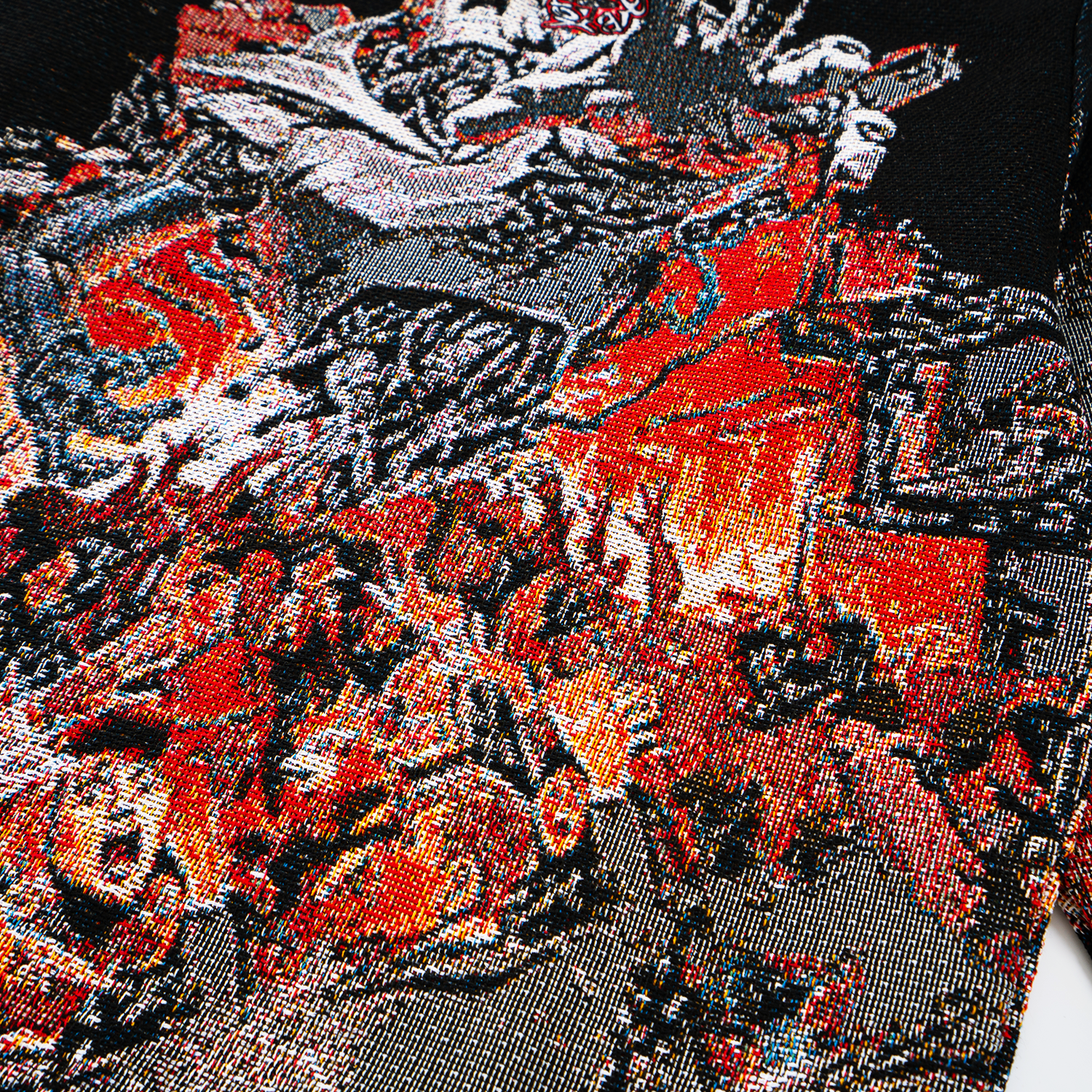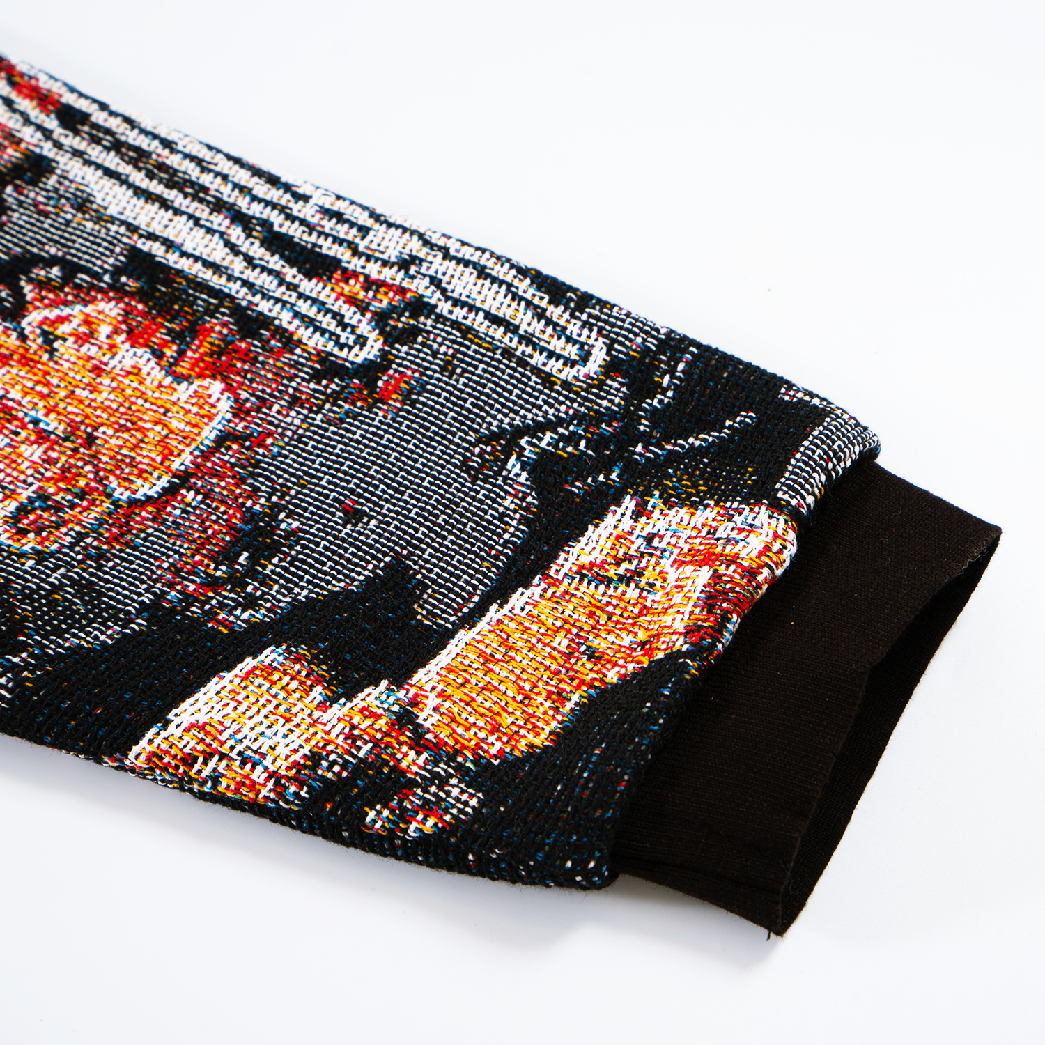 Tech specs: premium jacquard woven tapestry fabric (410gsm polycotton), embroidery @front, suede mini-ribbing (at bottom) | | | 100% wool ribbings @ sleeves (w/ intarsia logo at cuffs) & neck +++ satin silk lining (inside *fully*).